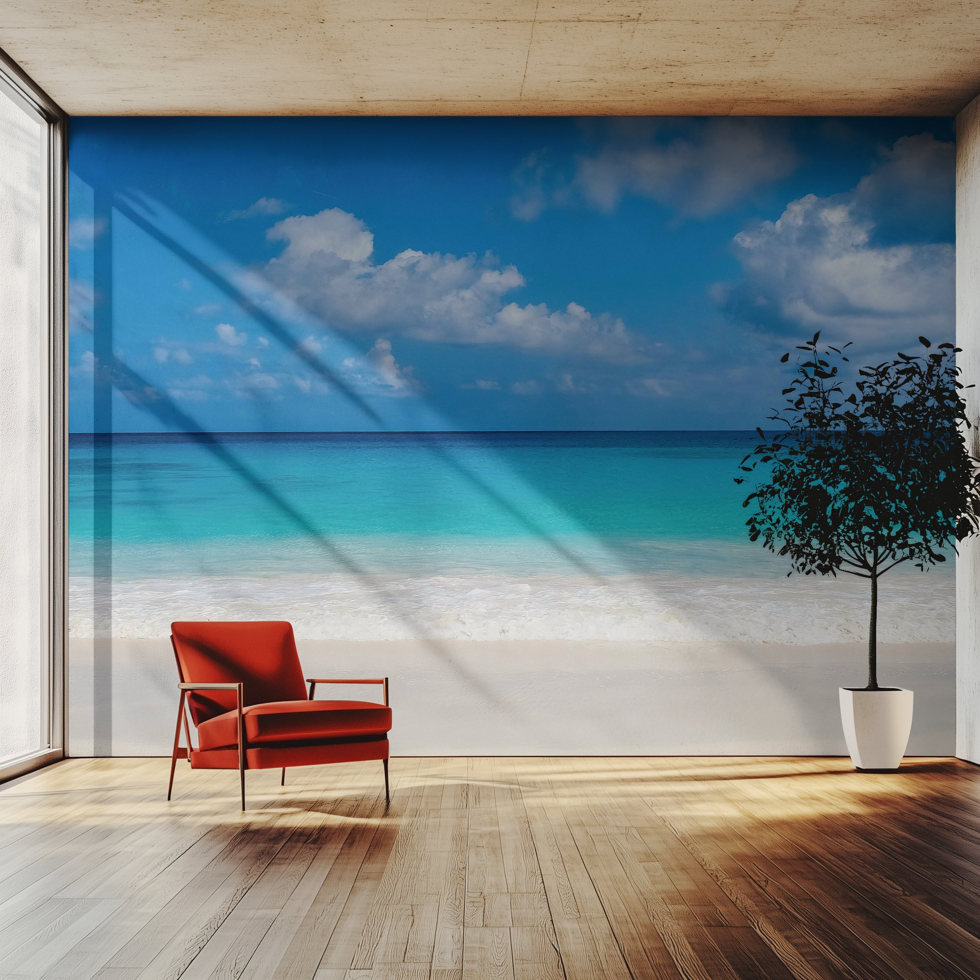 Waves break gently onto a stretch of untouched white sand beneath a bold blue sky. White Coast is the beach stripped down to its most essential elements—clean, open, and endlessly fresh. This coastal wallpaper brings that sense of breath and simplicity into your space, making it feel bright, organized, and free.