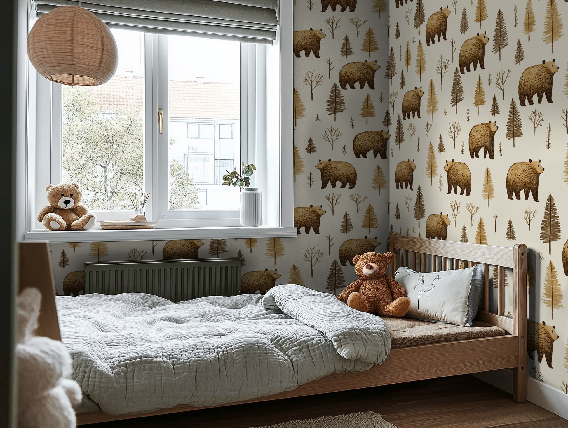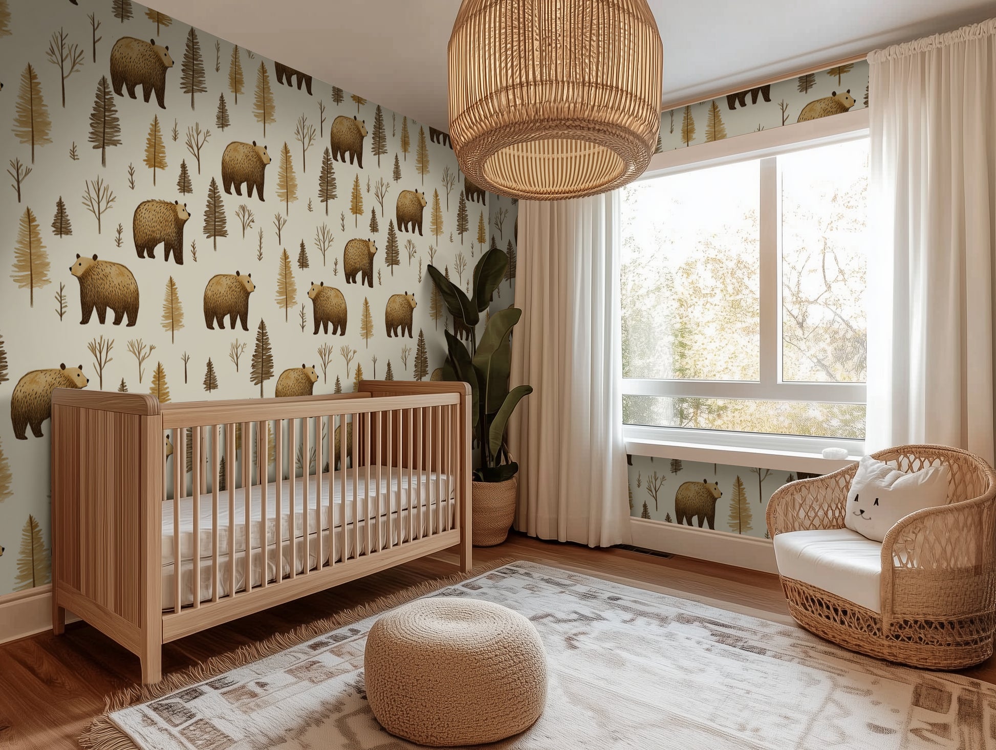 Rustic woodland motifs are a kids’ room staple, but this version feels elevated—thanks to its neutral color story and balanced layout. Great for gender-neutral nurseries or cozy cabins in the making.