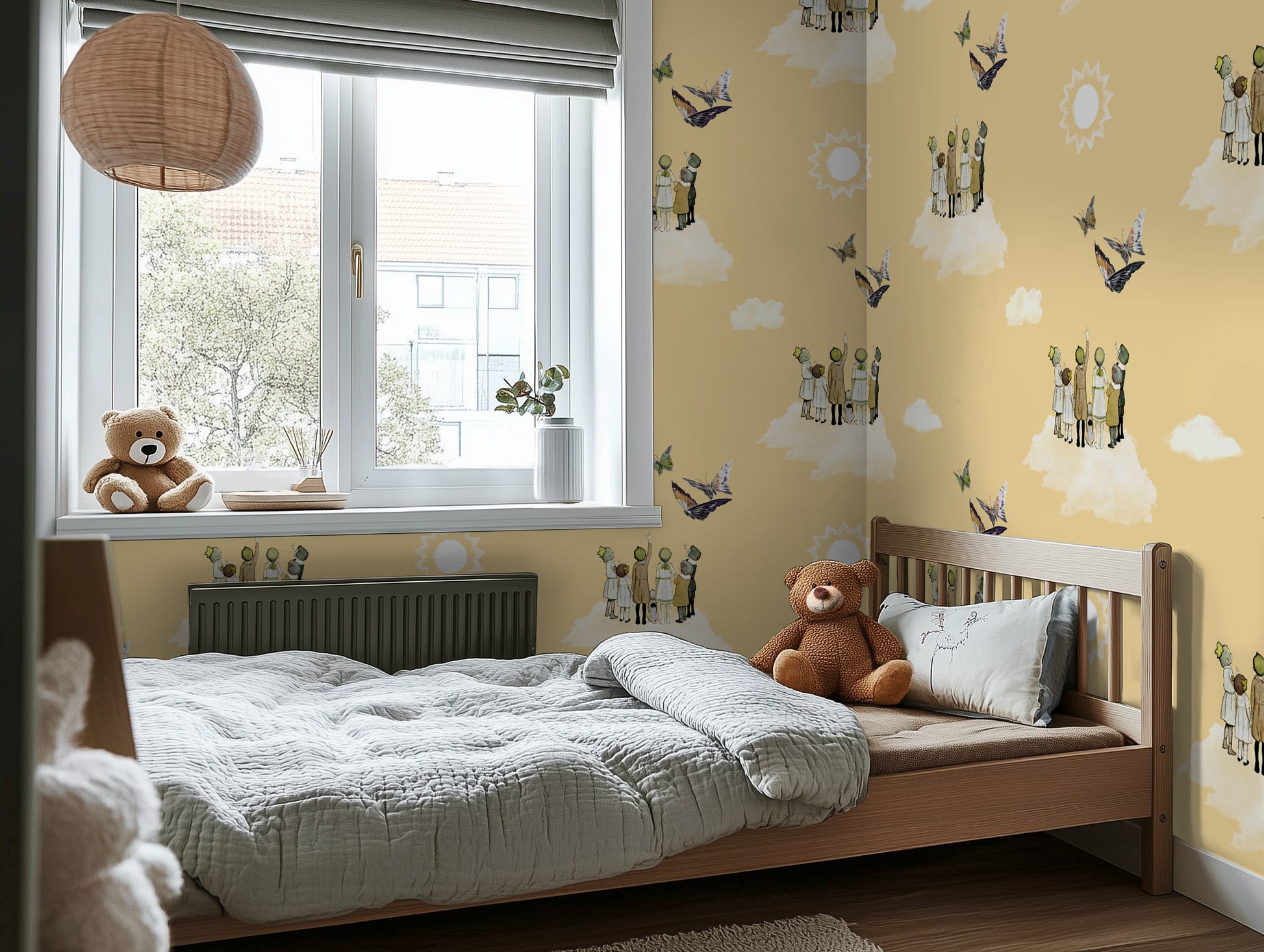 SEO Keywords: kids wallpaper, vintage kids wall art, nursery cloud wallpaper, butterfly kids mural, pastel wallpaper for children, hand-drawn illustration wallpaper, dreamy kids wallpaper, repeating pattern wall mural, storybook wallpaper, whimsical wallpaper design, gender neutral nursery decor, peel and stick kids wallpaper
