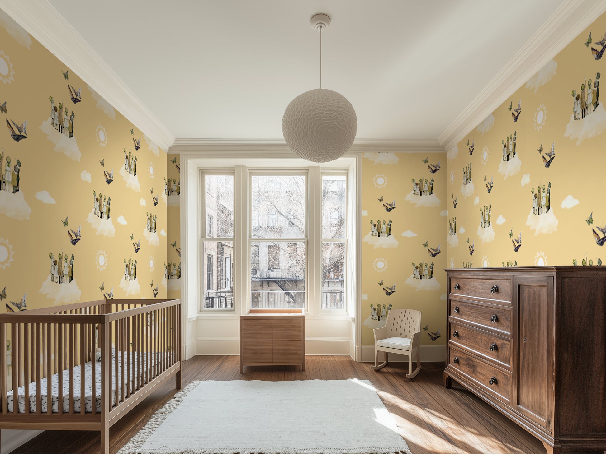 This repeating wallpaper transforms any child’s room into a space of quiet magic and wide-eyed discovery. The hand-drawn illustration style gives it a timeless quality, while the surreal scene invites big thoughts and soft landings. Ideal for nurseries, reading nooks, or bedrooms where calm and curiosity are equally welcome. The five colorways—Sky Blue, Mint Green, Lavender Drift, Rose Dawn, and Honey Glow—let you tailor the mood, from cool and contemplative to warm and whimsical.