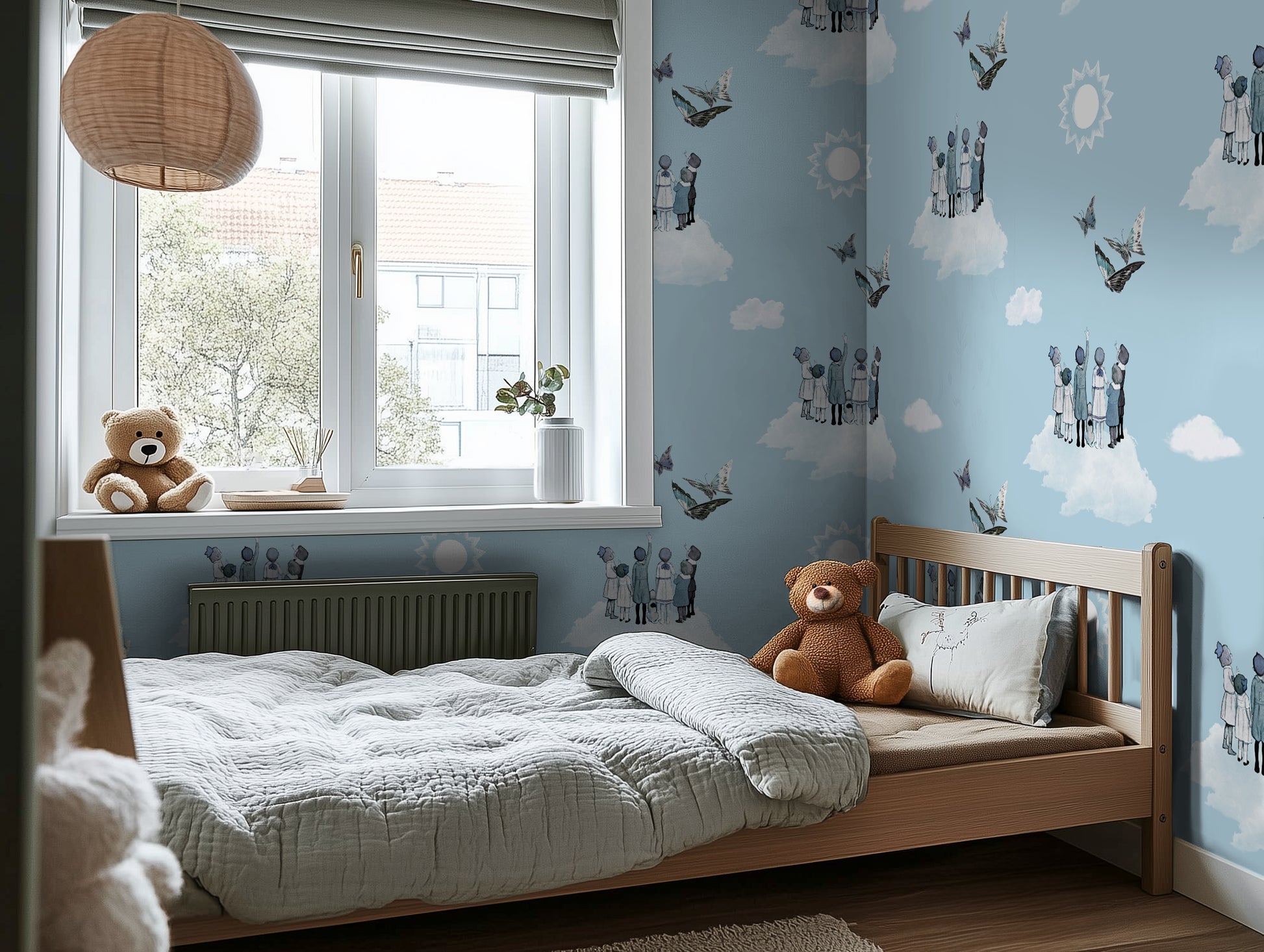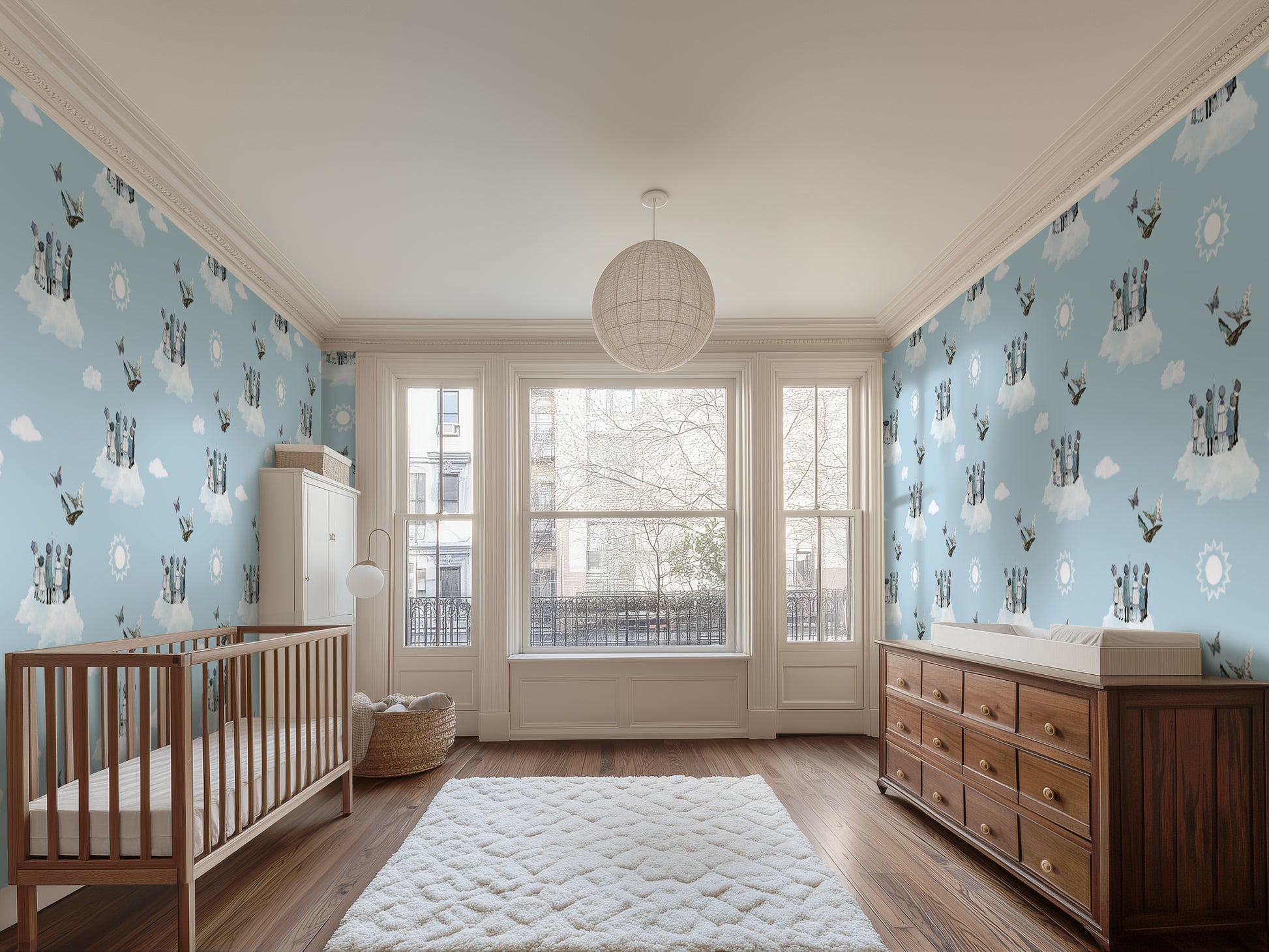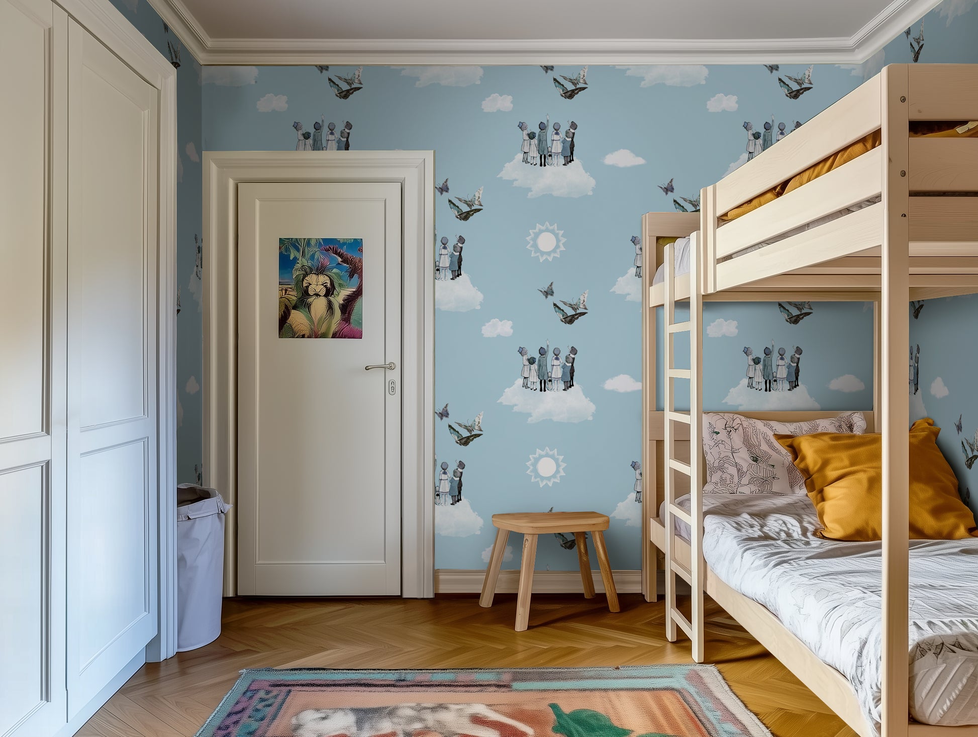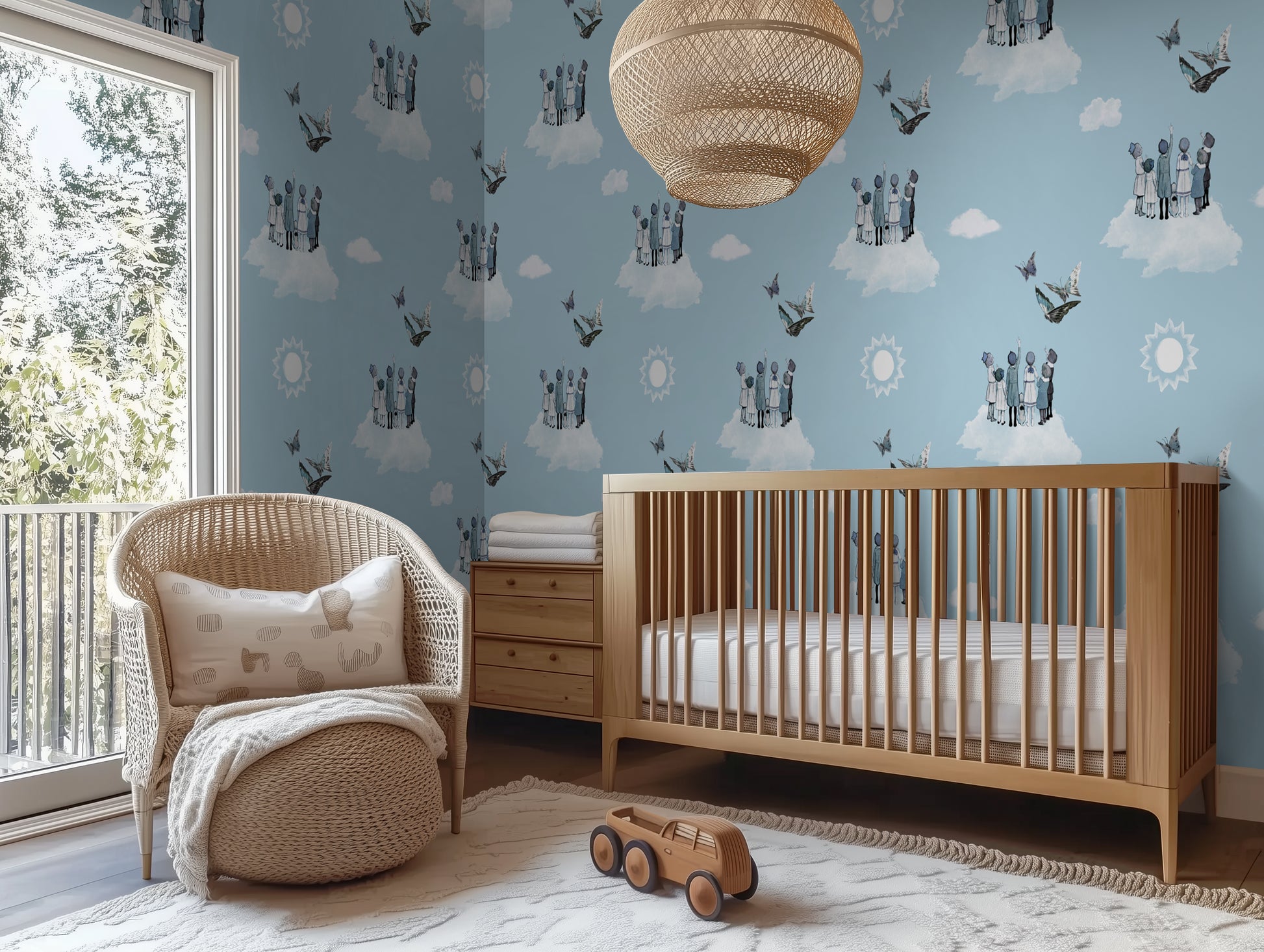 There’s a growing love for vintage-inspired children’s decor—especially designs that feel more illustrated than manufactured. Cloud Watchers channels that aesthetic, combining soft storytelling with soft palettes. It sits perfectly at the intersection of dreamy maximalism and minimalist illustration, offering just enough detail to enchant without overwhelming. It also supports the rising preference for gender-neutral, slow-design interiors made to grow with your child.
