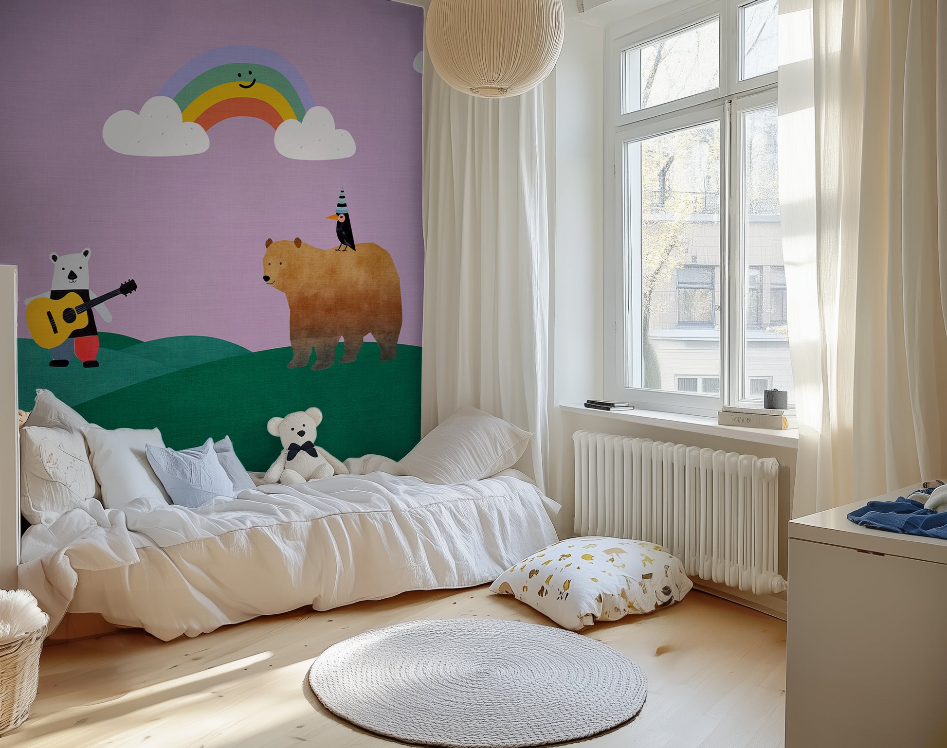This whimsical wall mural is perfect for kids’ bedrooms, nurseries, or playrooms where you want to create a dreamy, imaginative world. The large-scale format brings depth and charm to the room, with just enough storytelling detail to spark a child’s curiosity without overwhelming the space. Both colorways—Sky Blue and Lavender Mist—offer a gentle, gender-neutral palette that works with soft modern or Scandinavian-style interiors.