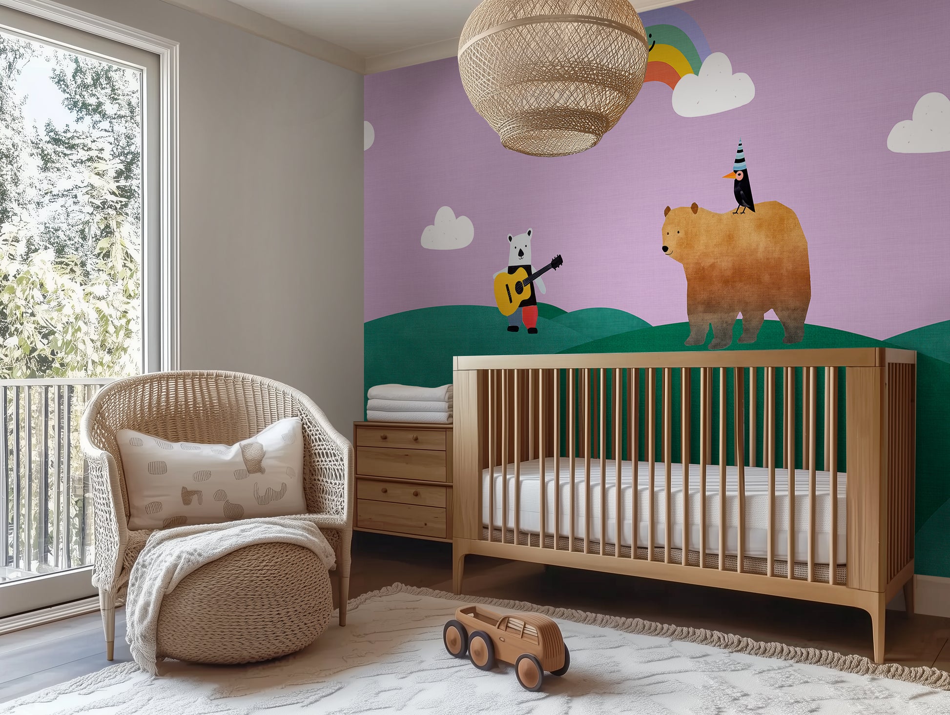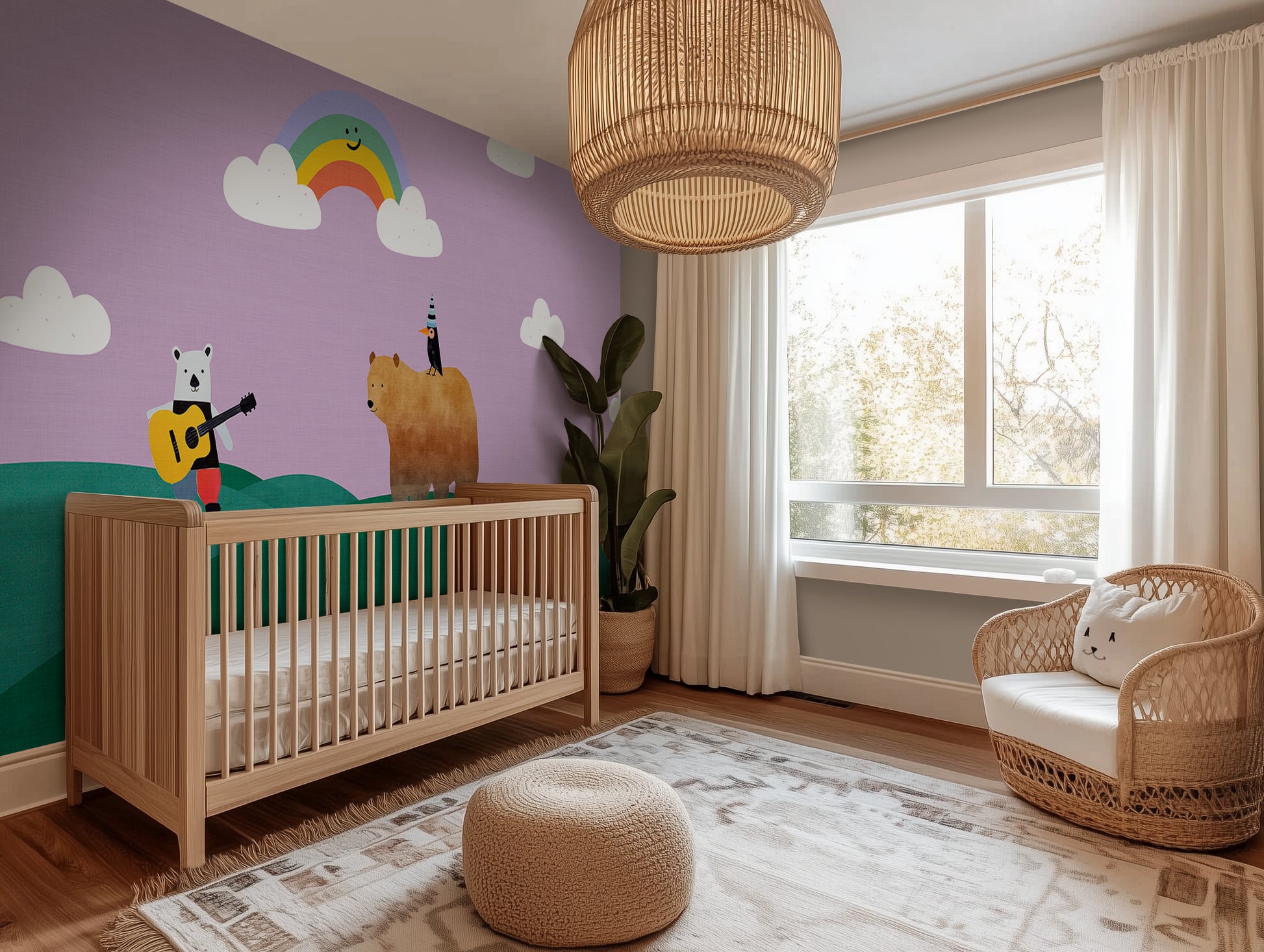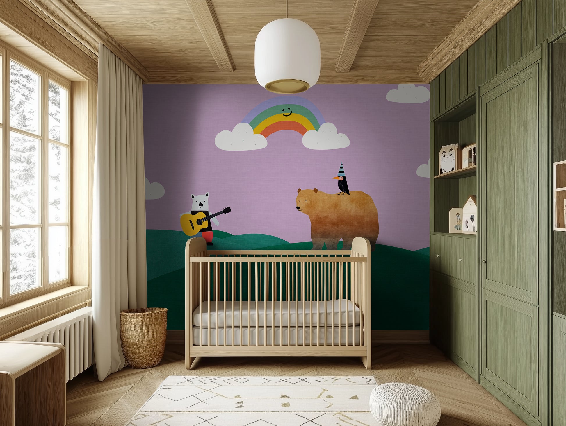 Storybook wallpapers are making a big comeback, with hand-drawn characters, playful scenes, and calming landscapes leading the charge. Rainbow Serenade taps into the trend for child-centric interiors that double as design-forward spaces—where wall art isn’t just for grownups. Its soft tones, whimsical figures, and layered landscape also align beautifully with biophilic design principles and the current love for murals that tell a story.