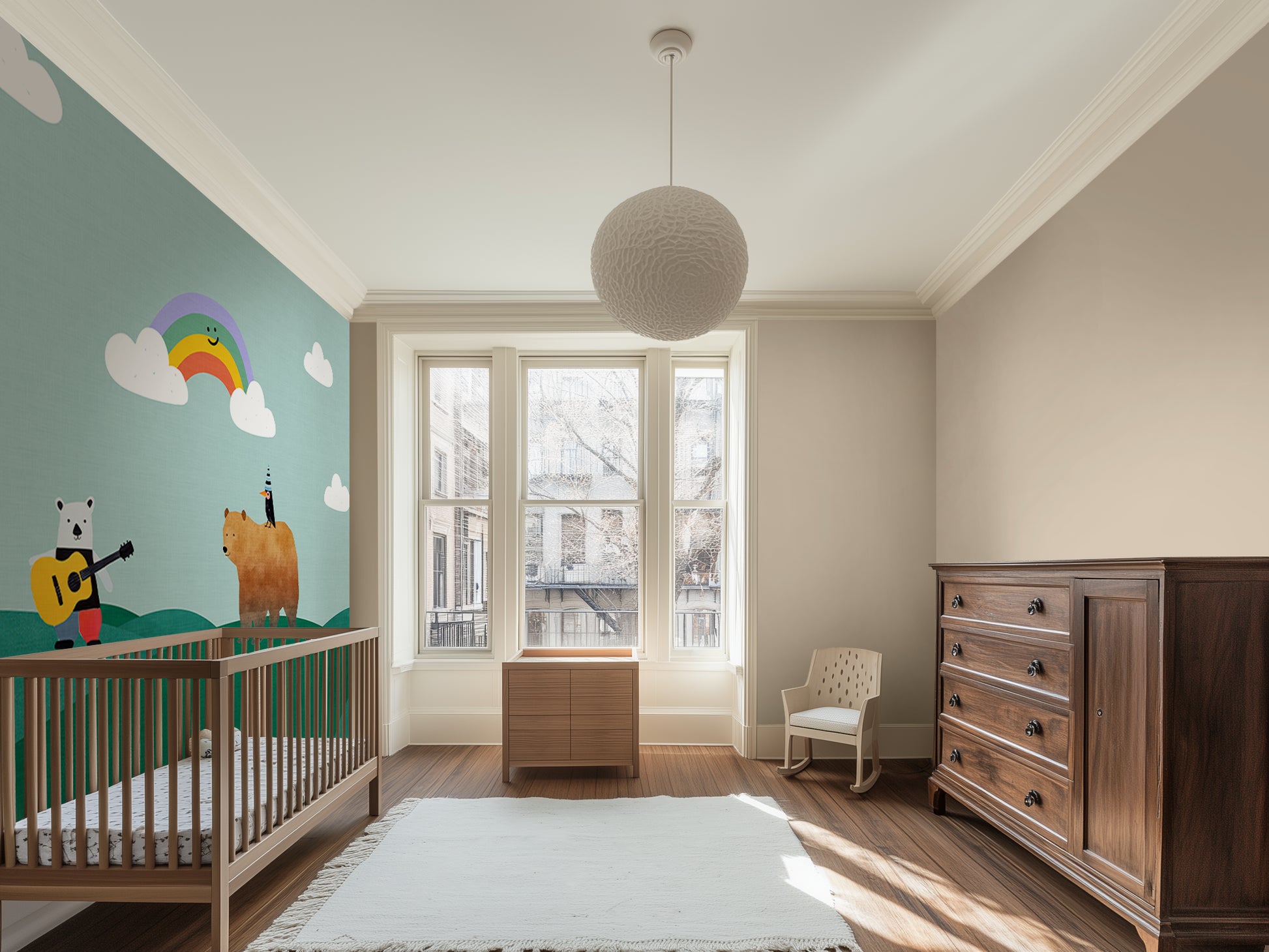 Storybook wallpapers are making a big comeback, with hand-drawn characters, playful scenes, and calming landscapes leading the charge. Rainbow Serenade taps into the trend for child-centric interiors that double as design-forward spaces—where wall art isn’t just for grownups. Its soft tones, whimsical figures, and layered landscape also align beautifully with biophilic design principles and the current love for murals that tell a story.