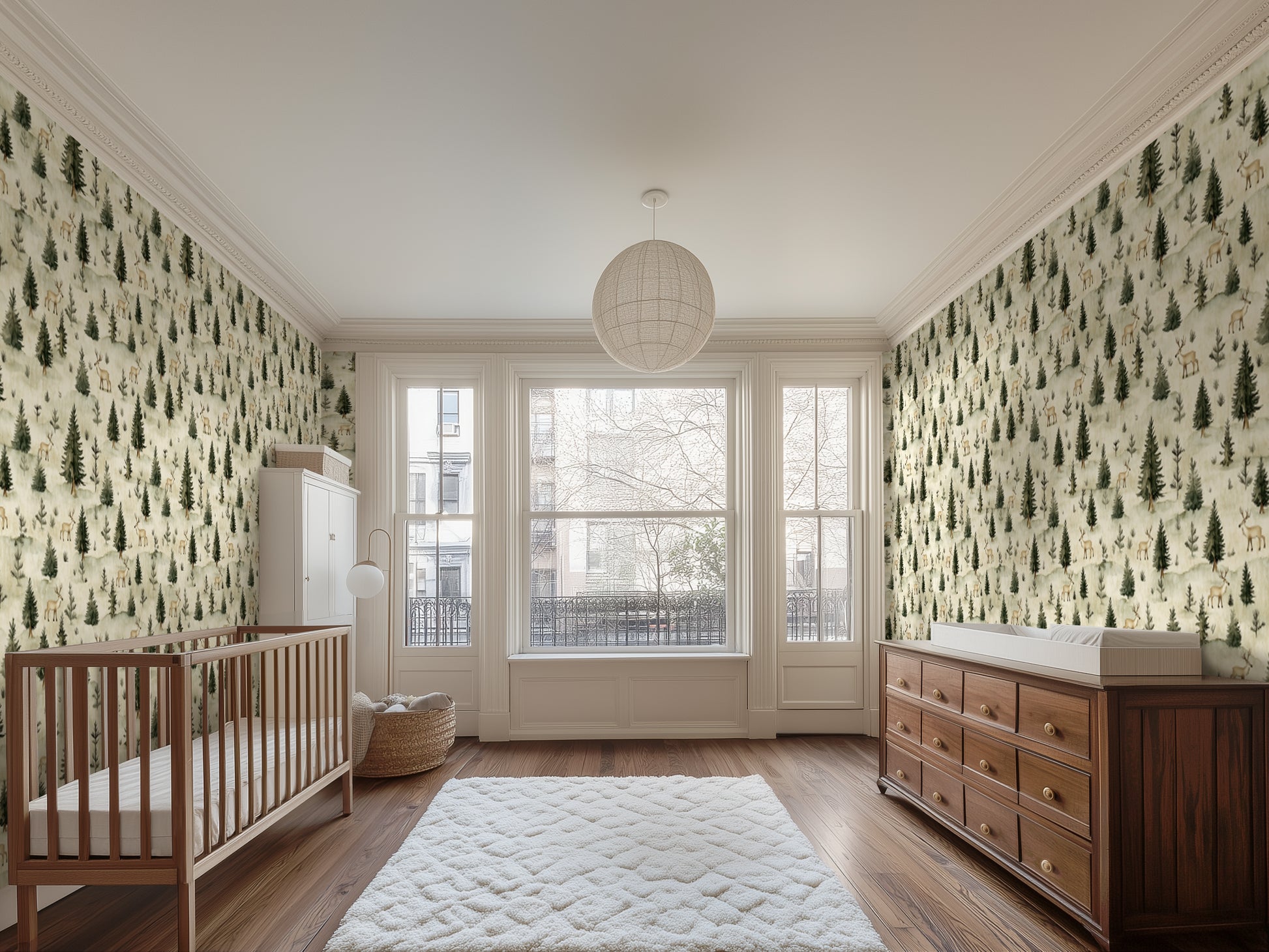 Scandinavian simplicity and seasonal forest themes are dominating kids’ interiors. This wallpaper captures both, with a snowy palette and peaceful woodland creatures that feel modern, not cliché.