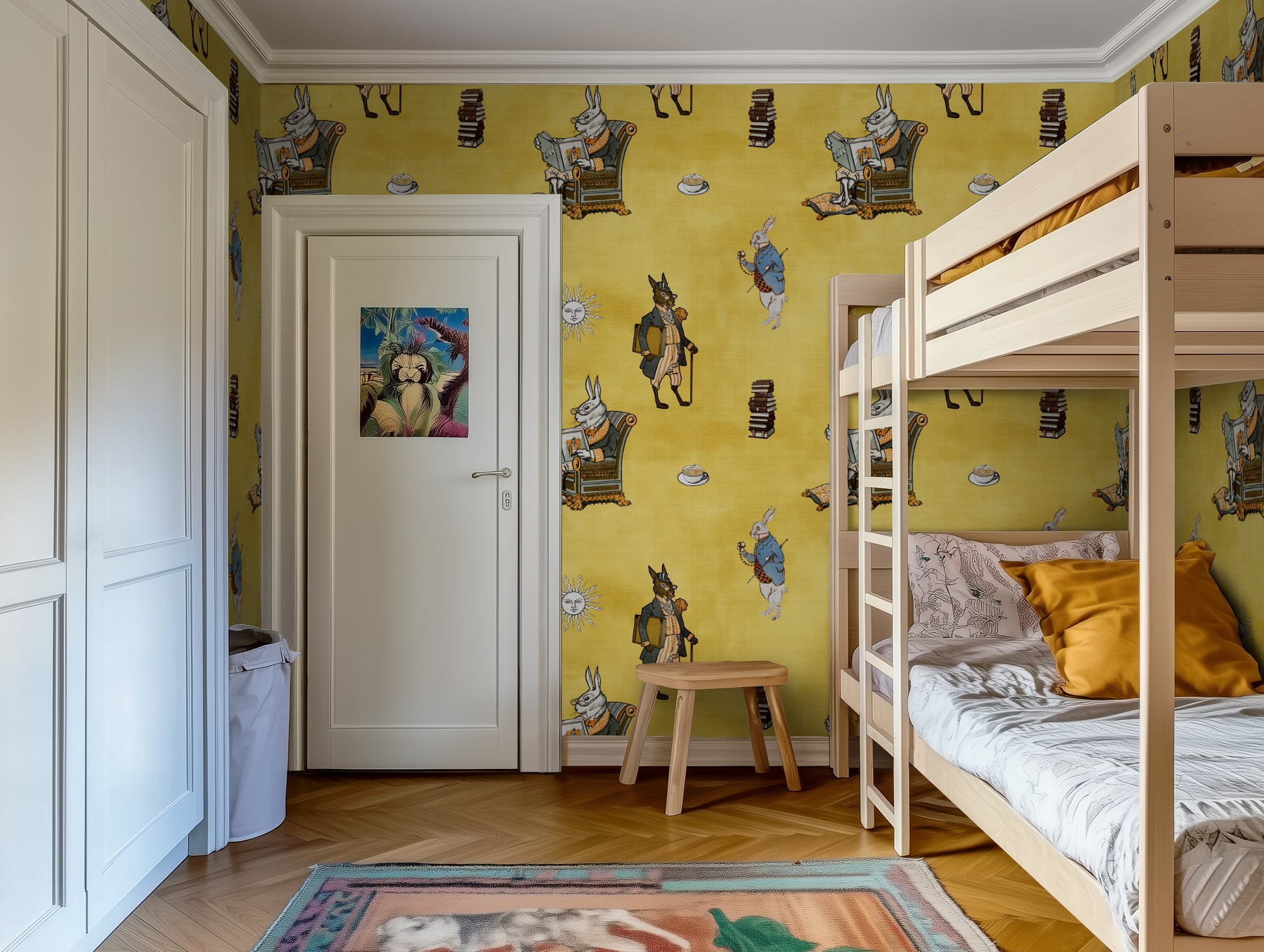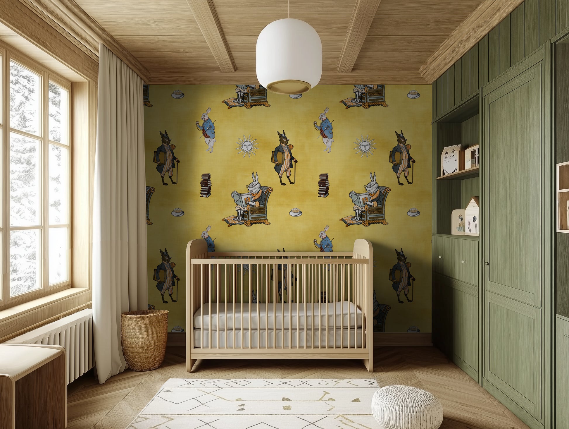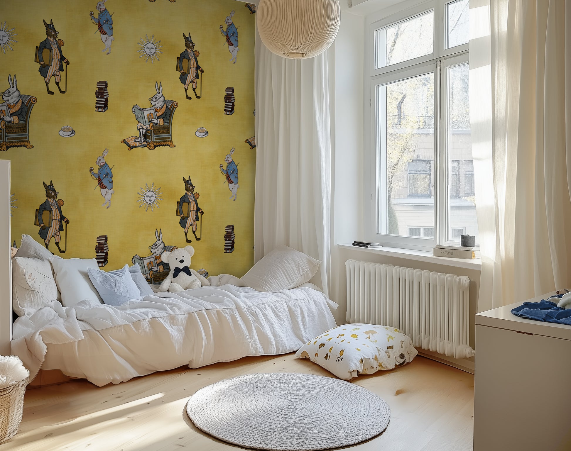 This wallpaper is pure storybook nostalgia, wrapped in golden tones and Victoriana charm. Perfect for kids’ rooms, reading corners, or play spaces where a bit of oddity is welcome. The classic characters are reimagined in a seamless pattern that balances whimsy with sophistication, making it just as suitable for whimsical grown-up interiors or eclectic guest rooms. The “Golden Hour” colorway adds warmth and vintage flair to any space.