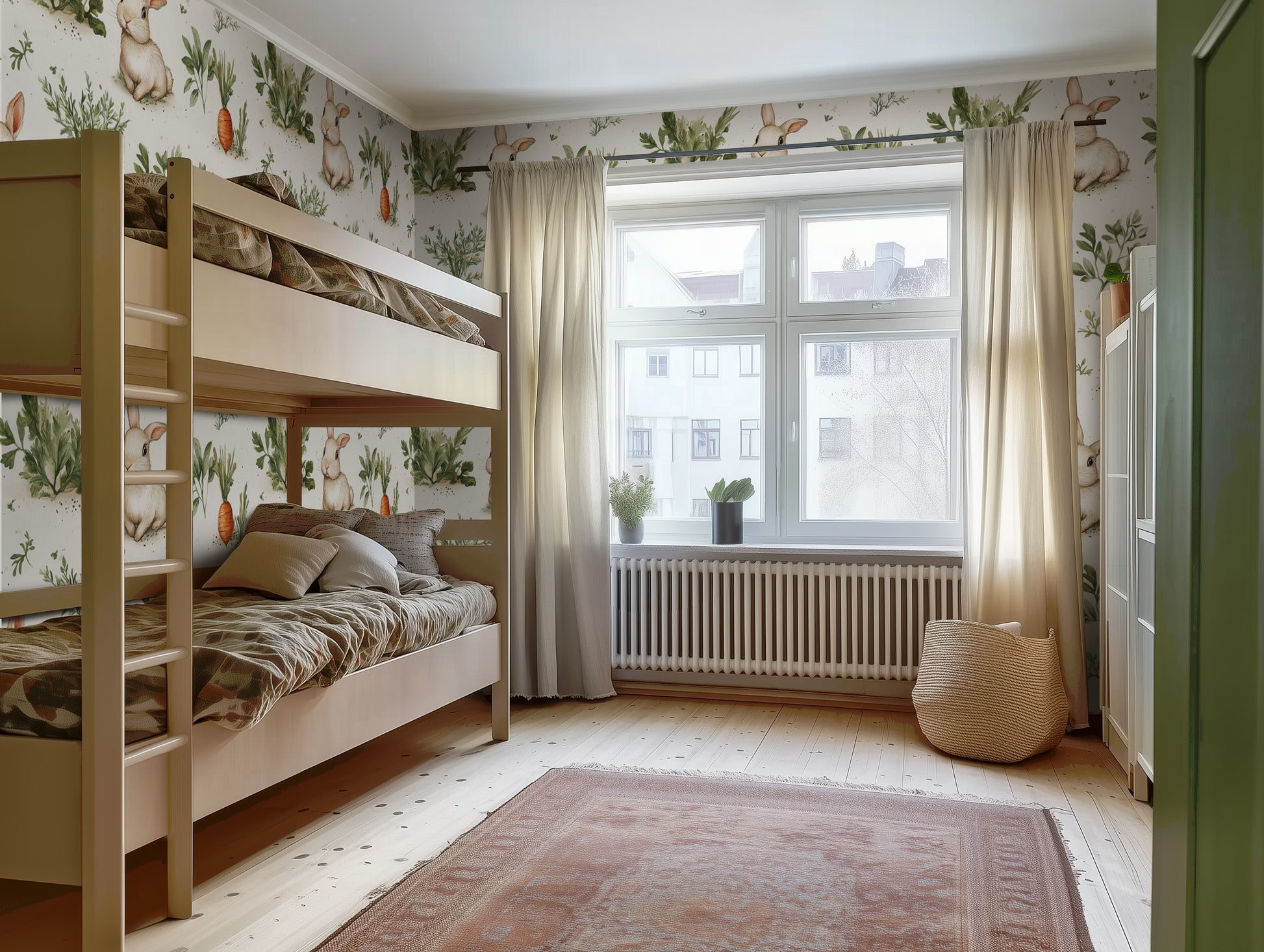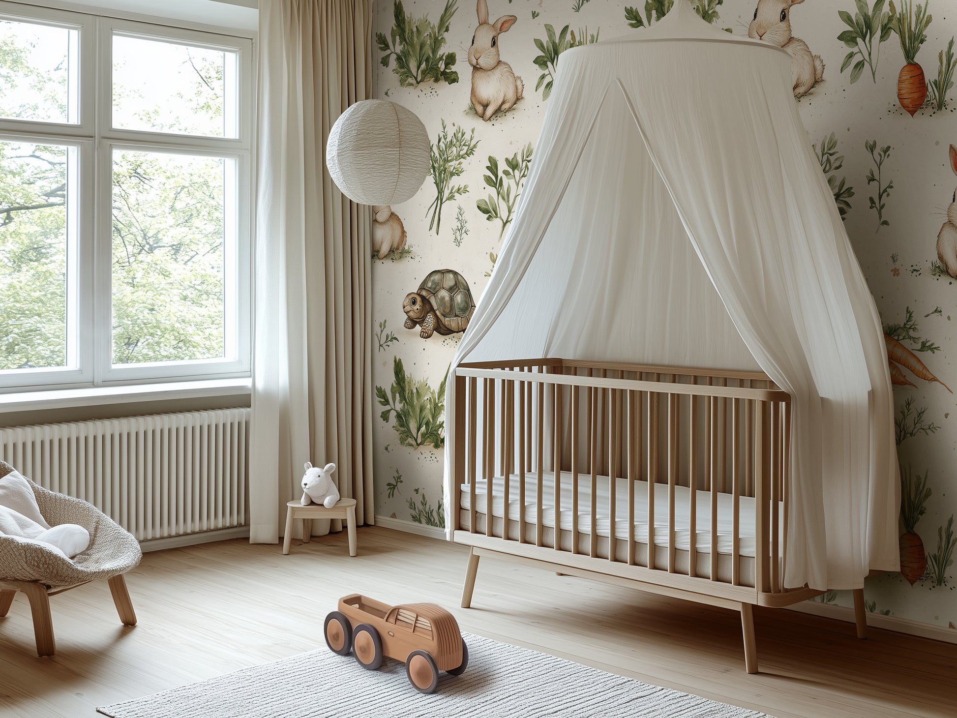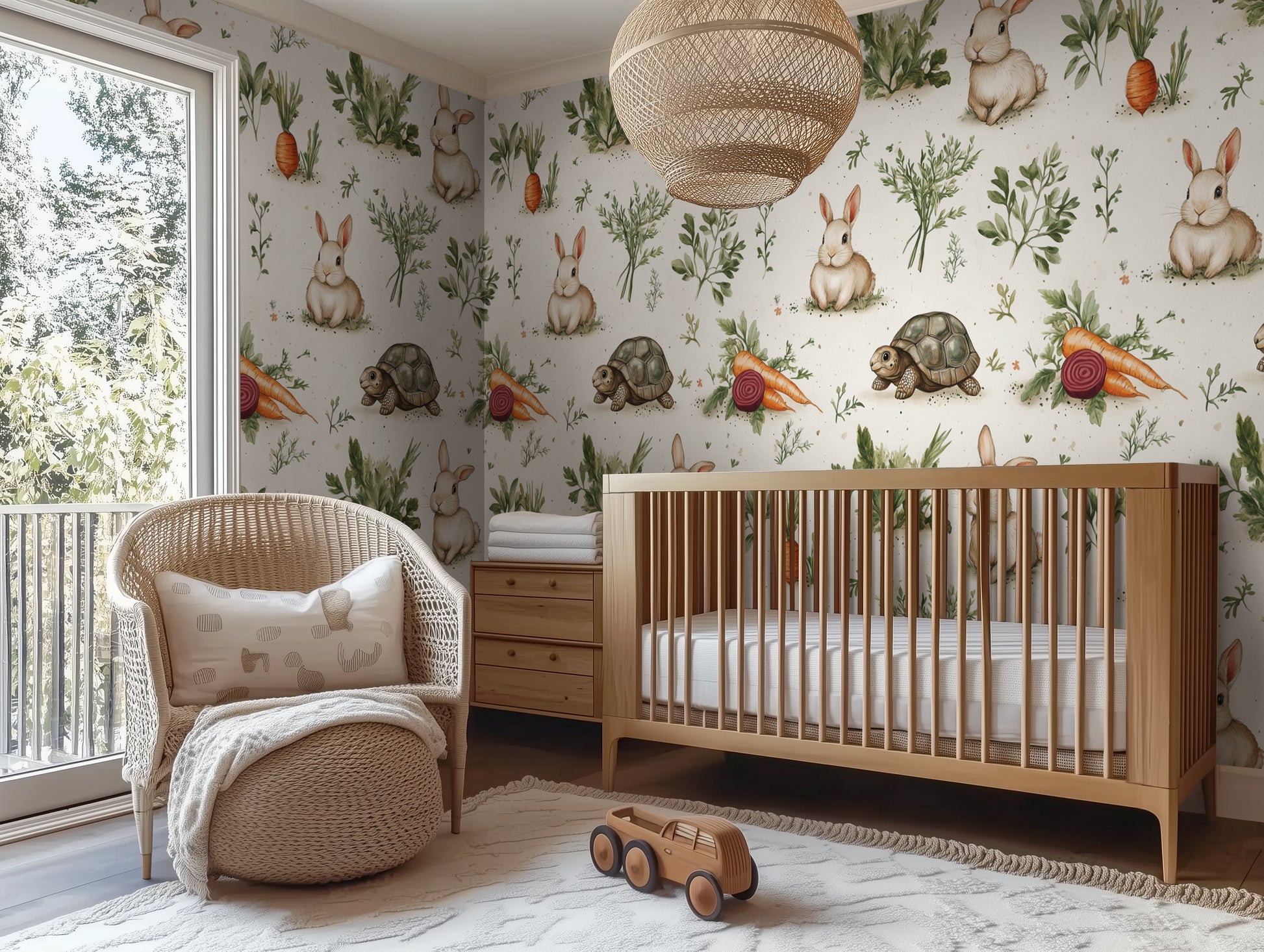 Botanical calm meets vintage animal charm—just right for the rise of biophilic kids interiors. It taps into the trend of natural materials, muted tones, and imaginative play without visual overload.