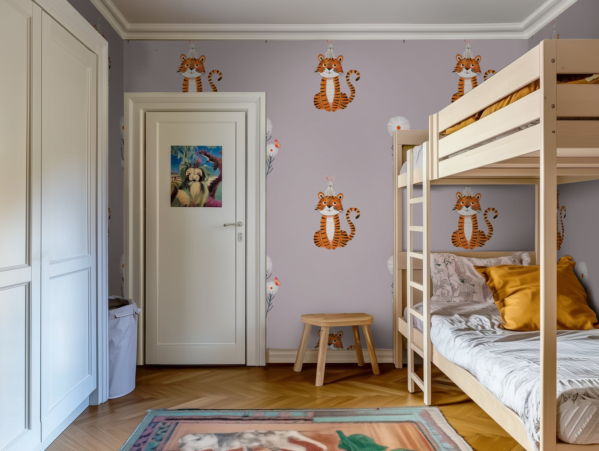 This repeating pattern brings both symmetry and surprise to a child’s space. The soft florals add a soothing, decorative rhythm, while the tiger-rabbit duo brings just the right amount of whimsy. Perfect for nurseries, toddler bedrooms, or playrooms, it’s the kind of wallpaper that grows with your child—cute but not cloying, playful but never too loud. The five colorways—Marigold, Lilac Haze, Skybell Blue, Plum Dust, and Garden Green—offer versatile options for both vibrant and calming interiors.