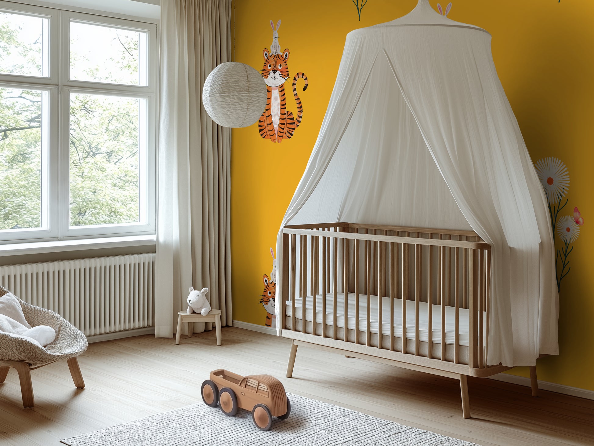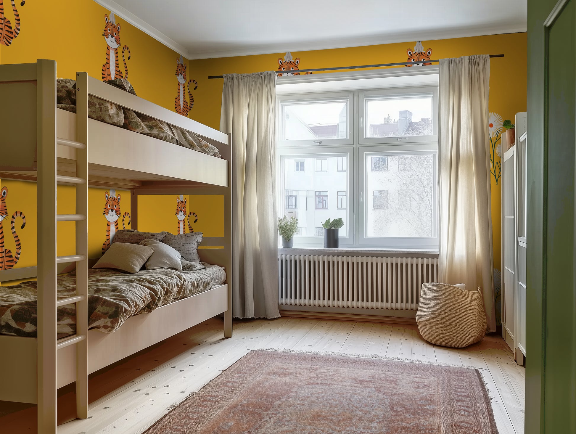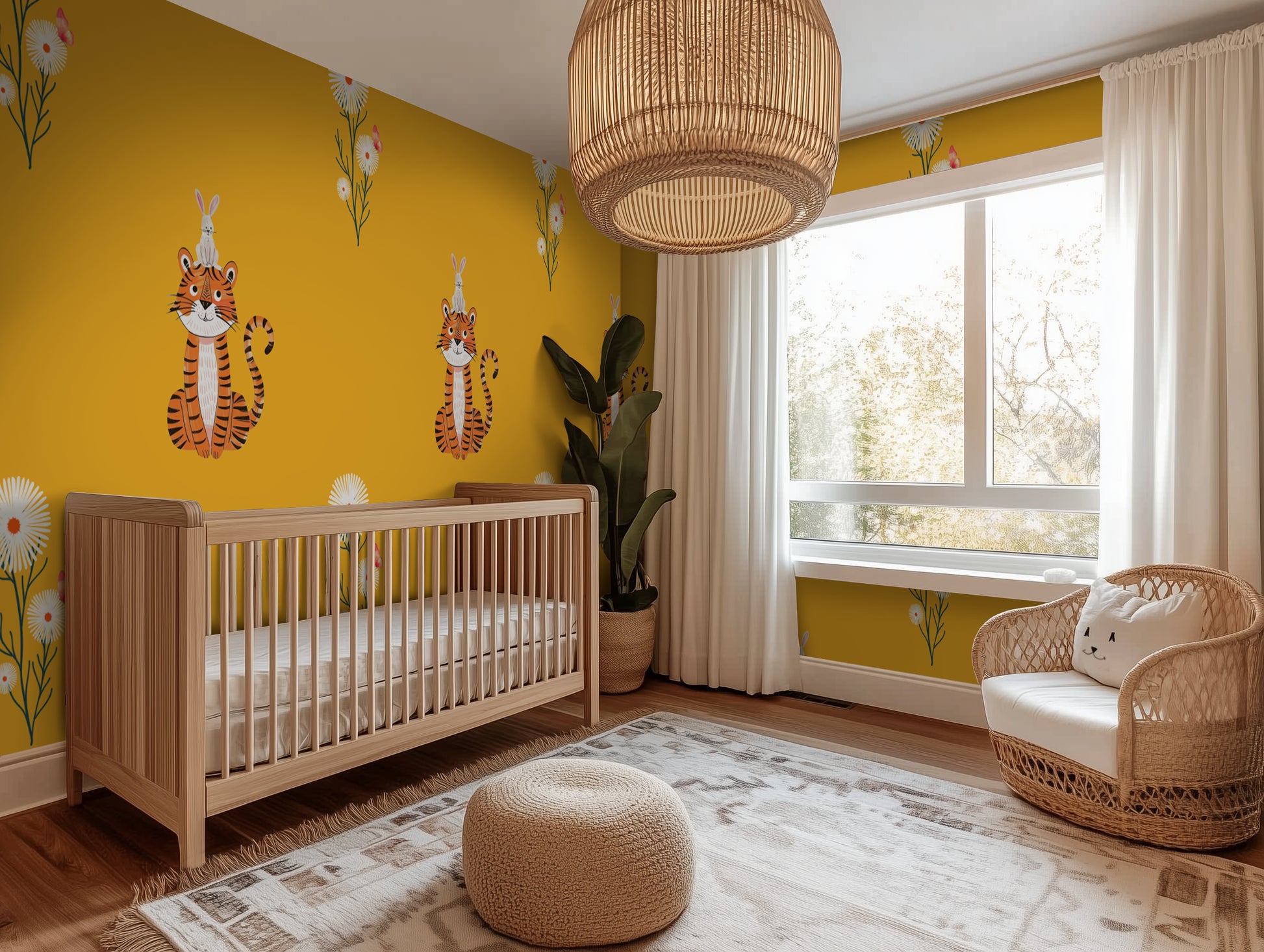 Animal motifs and botanical prints are staples of modern kids’ design, but The Tiger and The Hare blends them with a surreal twist. This seamless wallpaper leans into the maximalist-minimalist mix: quirky characters and clean composition, soft hues and bold personalities. It also complements the rising trend of gender-neutral kids decor and imaginative wall art that feels handmade and personal.