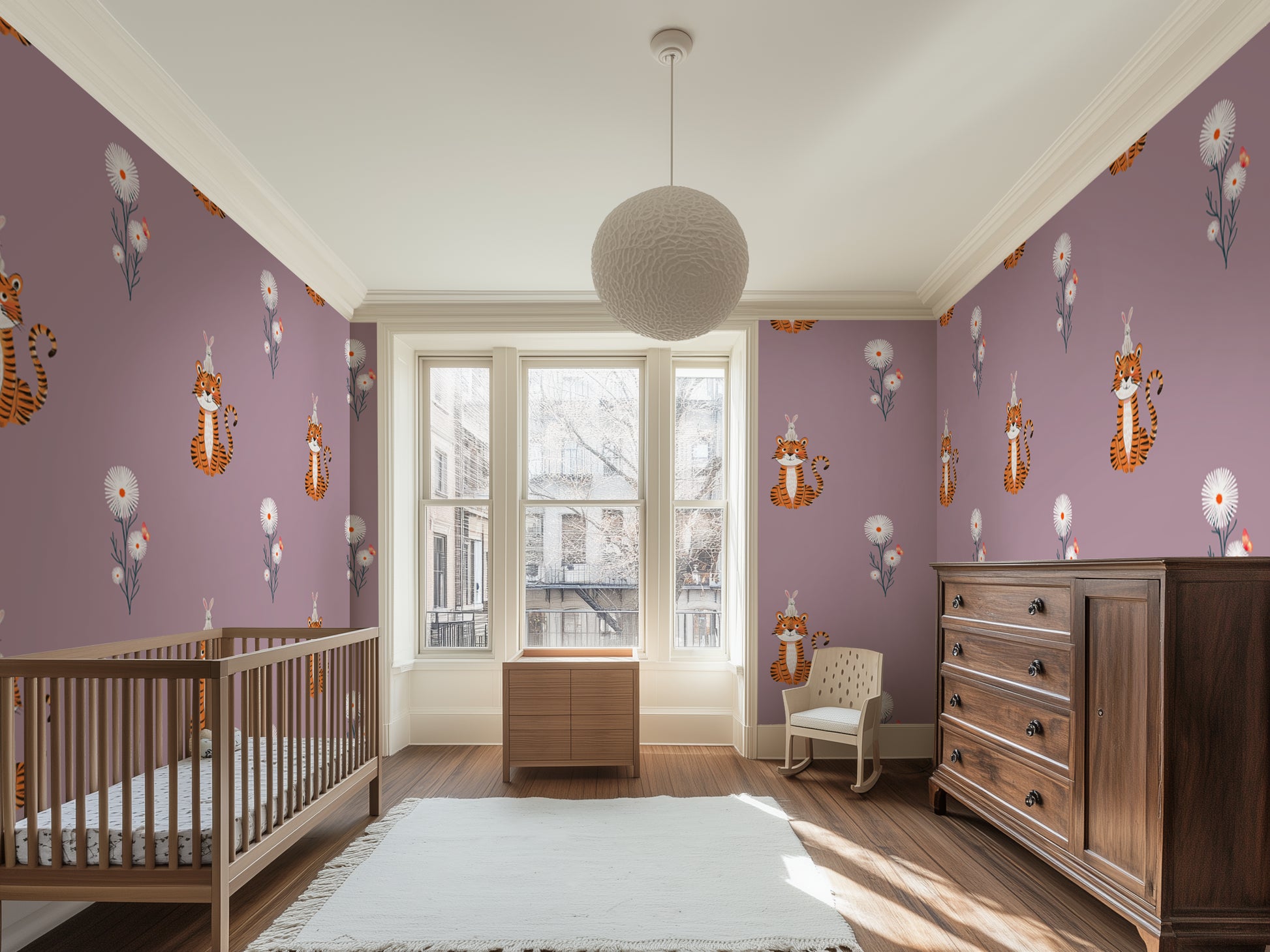 This repeating pattern brings both symmetry and surprise to a child’s space. The soft florals add a soothing, decorative rhythm, while the tiger-rabbit duo brings just the right amount of whimsy. Perfect for nurseries, toddler bedrooms, or playrooms, it’s the kind of wallpaper that grows with your child—cute but not cloying, playful but never too loud. The five colorways—Marigold, Lilac Haze, Skybell Blue, Plum Dust, and Garden Green—offer versatile options for both vibrant and calming interiors.