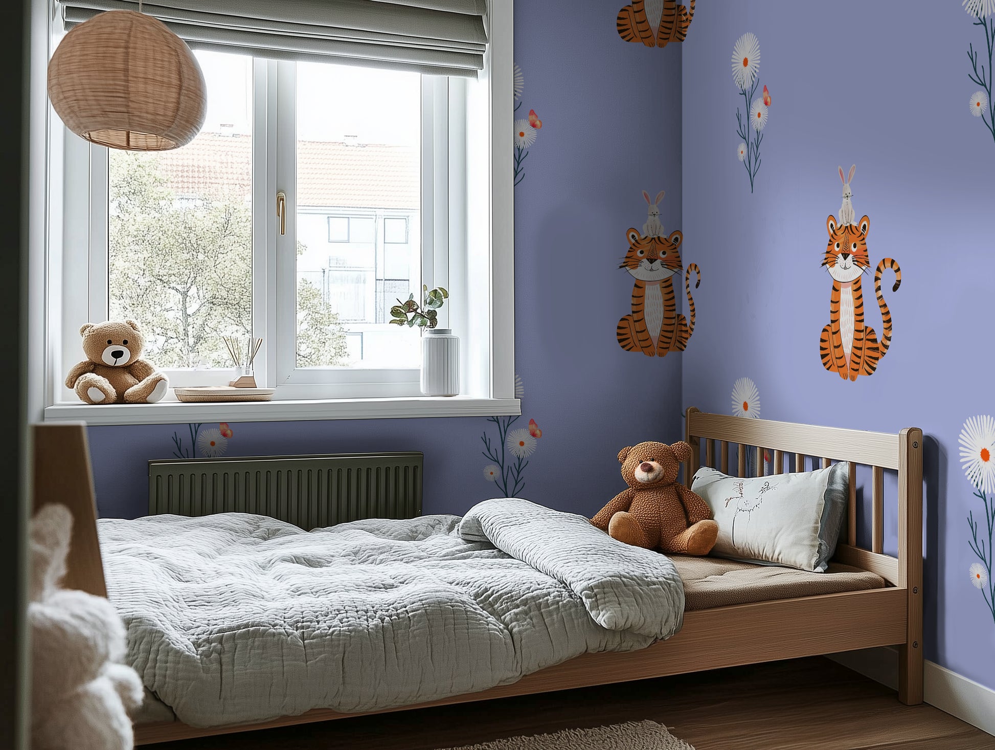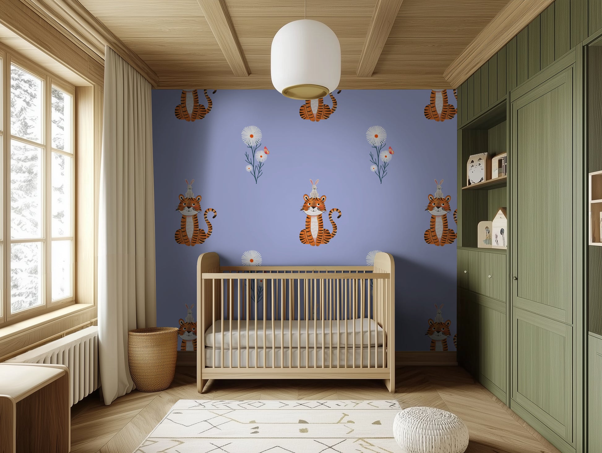 This repeating pattern brings both symmetry and surprise to a child’s space. The soft florals add a soothing, decorative rhythm, while the tiger-rabbit duo brings just the right amount of whimsy. Perfect for nurseries, toddler bedrooms, or playrooms, it’s the kind of wallpaper that grows with your child—cute but not cloying, playful but never too loud. The five colorways—Marigold, Lilac Haze, Skybell Blue, Plum Dust, and Garden Green—offer versatile options for both vibrant and calming interiors.