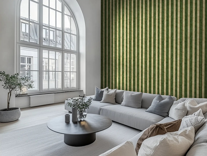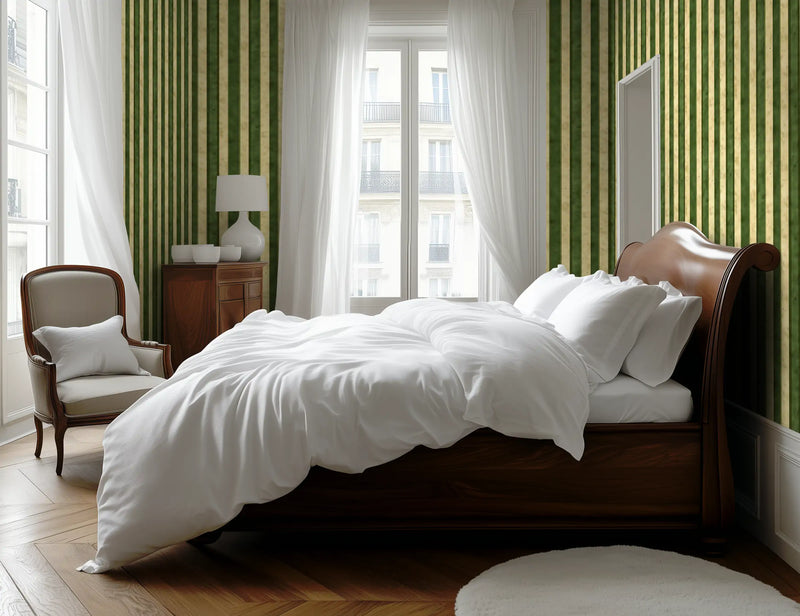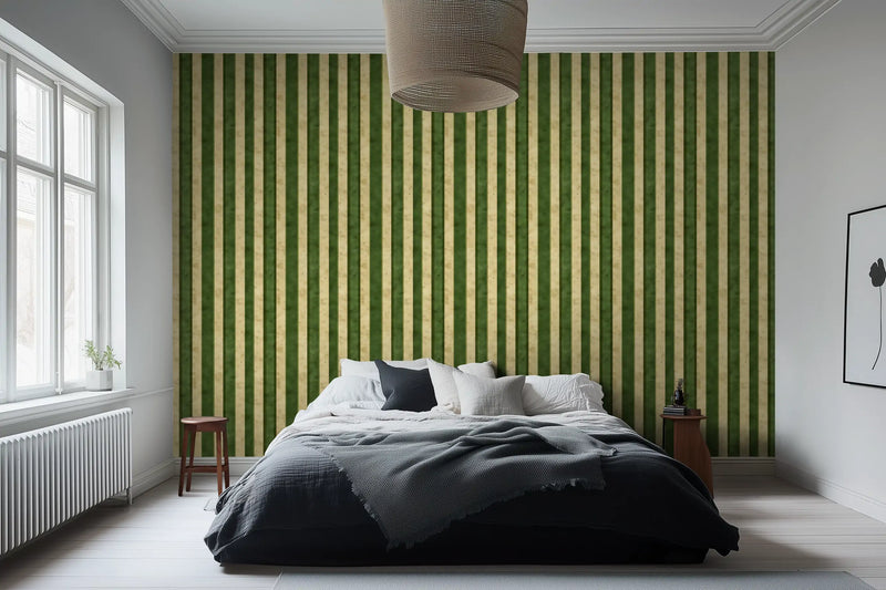 A nod to classic European taverns, countryside kitchens, and well-loved farmhouse textiles, Tavern Stripes is a timeless striped wallpaper with rustic stripe design that feels both heritage-rich and endlessly versatile. The interplay of deep forest green and warm golden hues makes it perfect for cozy, character-filled interiors.