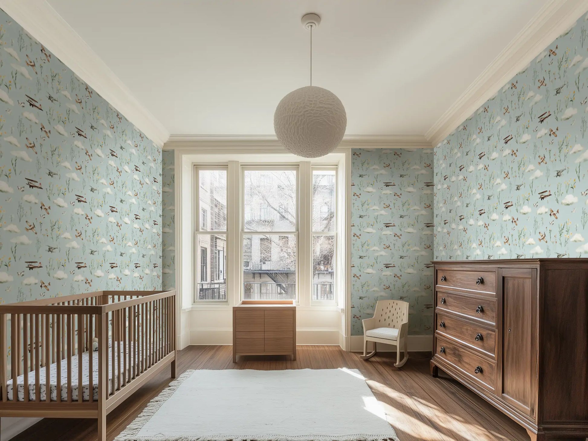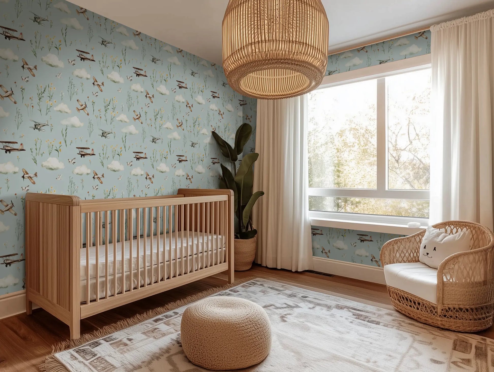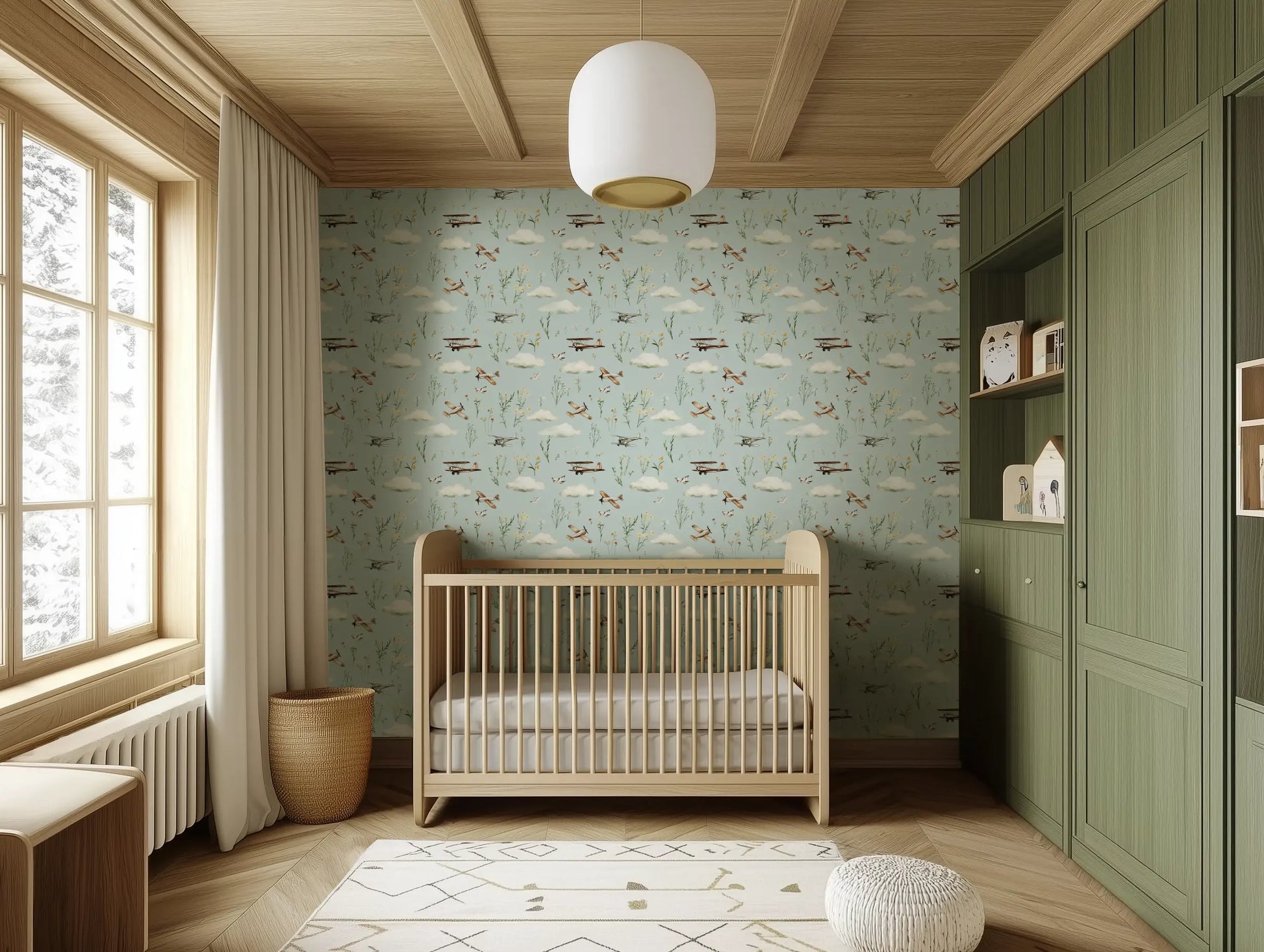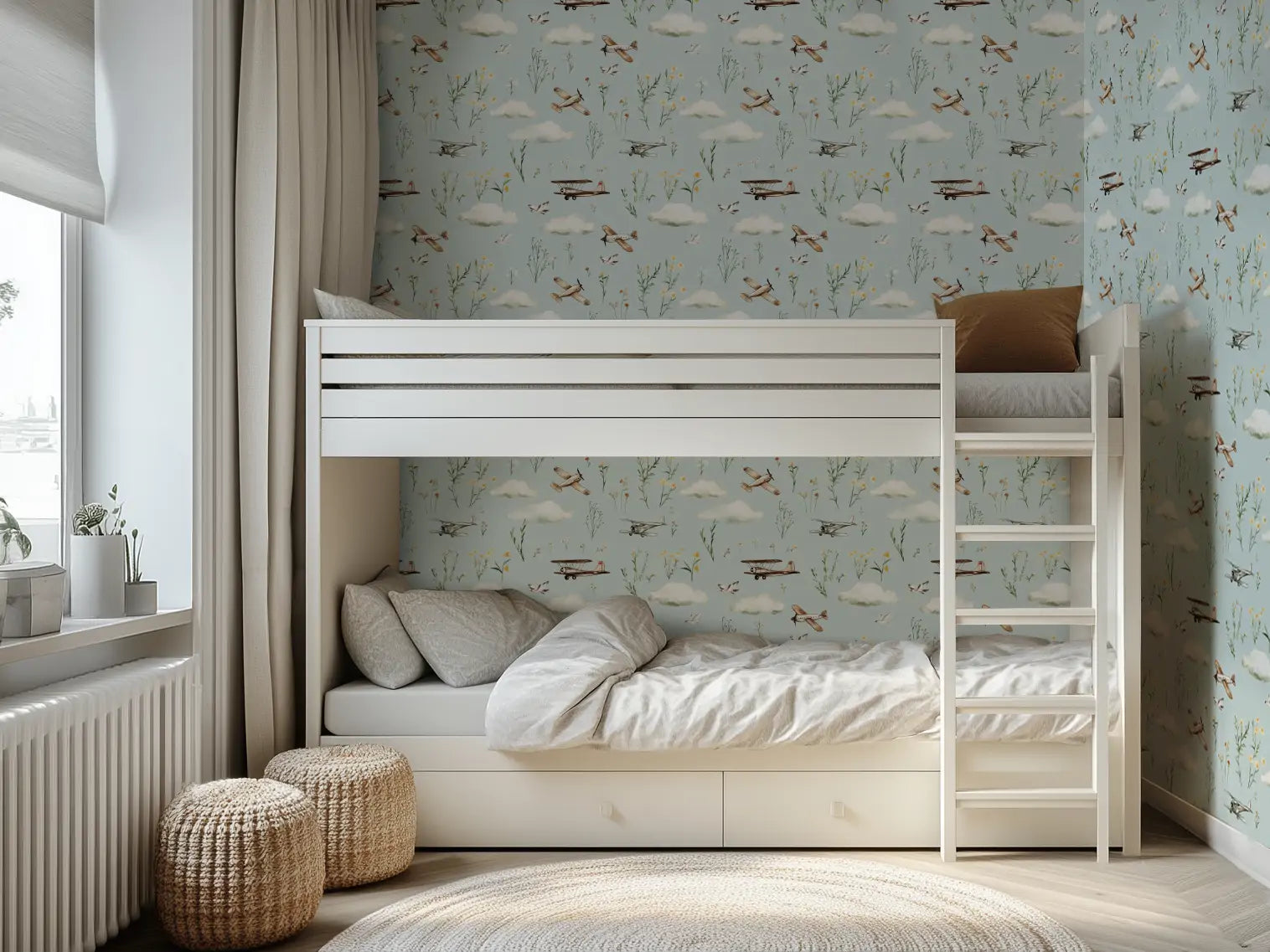Perfect for nurseries, dreamy bedrooms, or whimsical reading corners, this soft aviation wallpaper mural pairs effortlessly with muted pastels, light woods, and soft linen fabrics, creating a space that feels fresh, modern, and endlessly serene.
