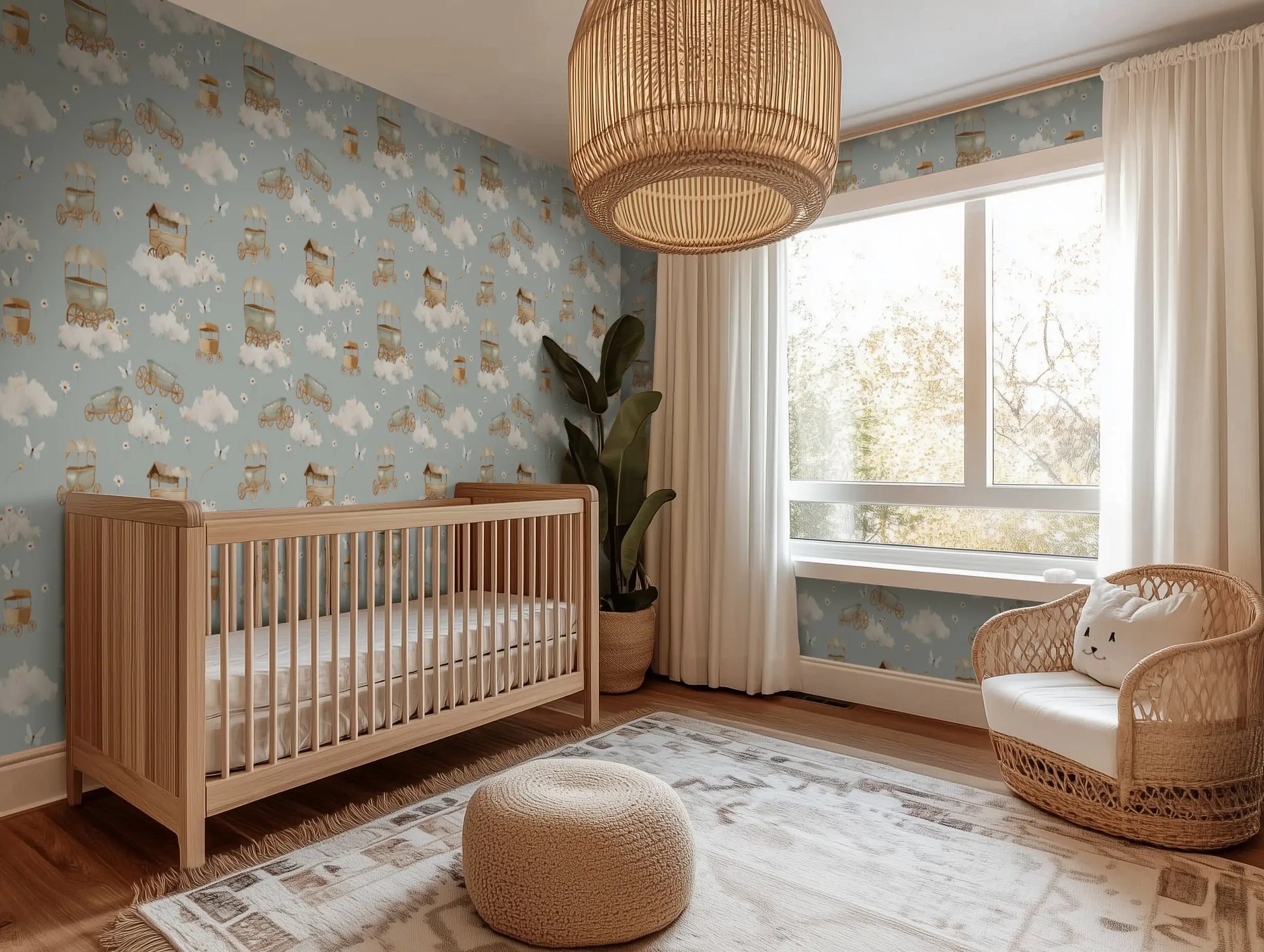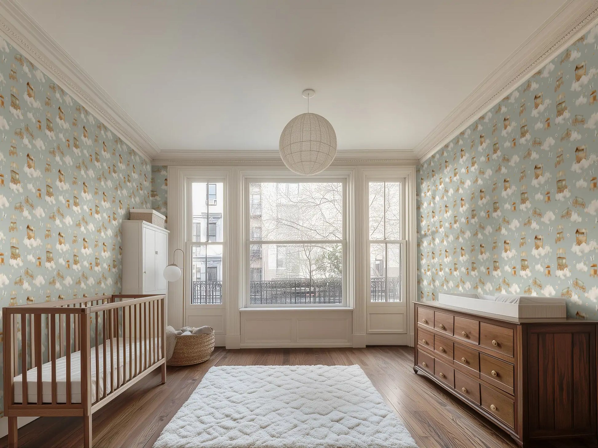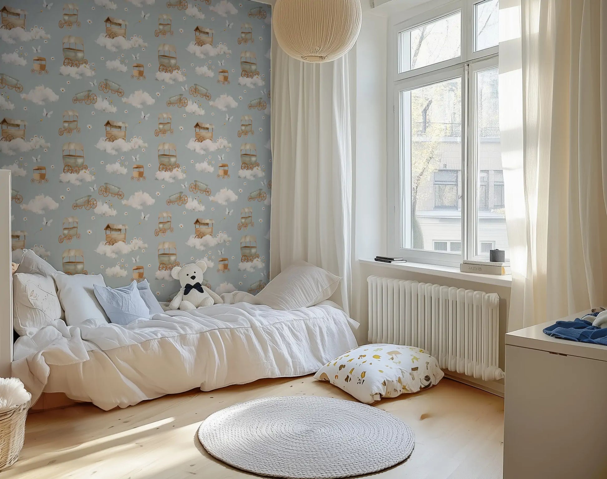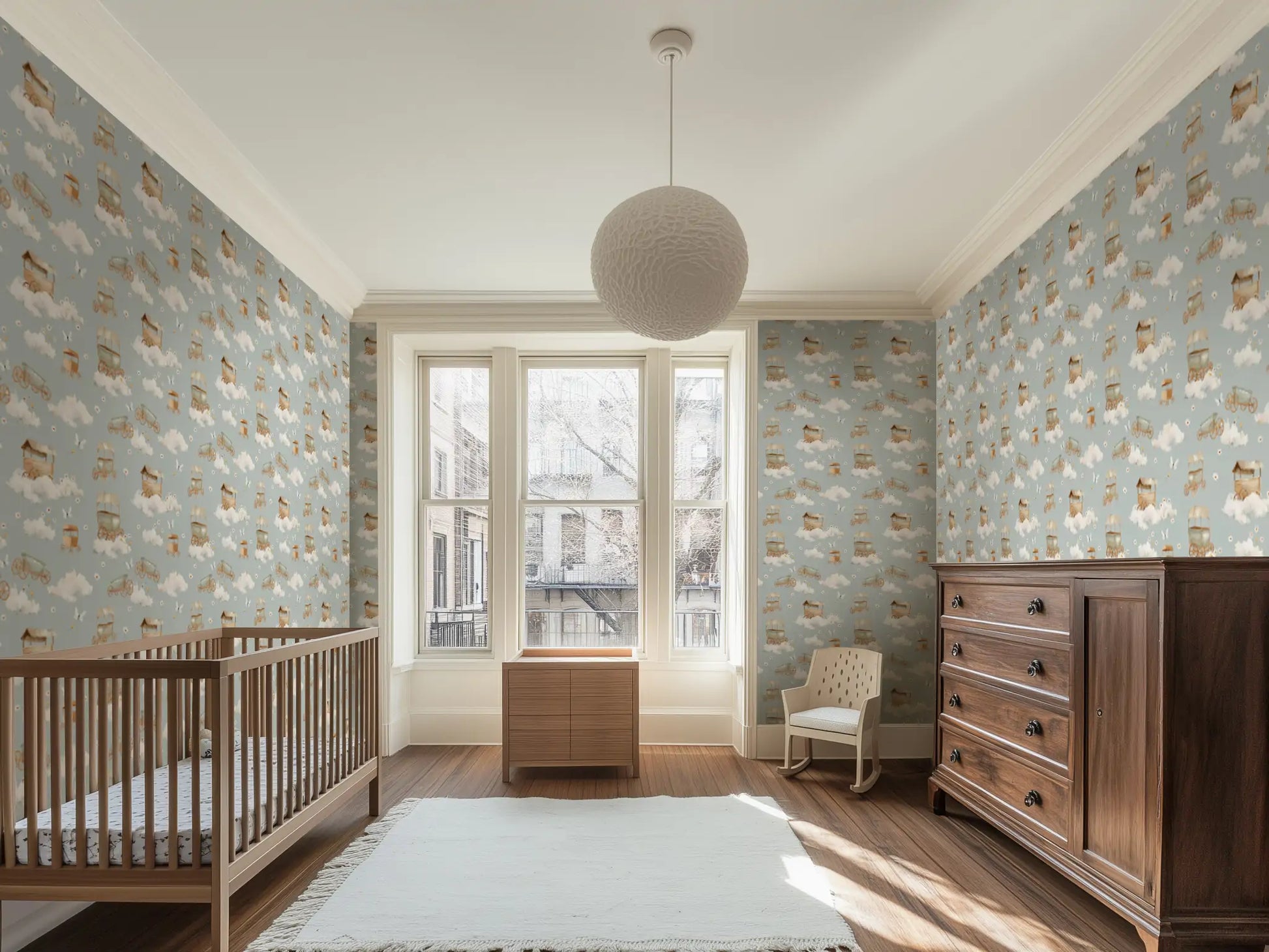 Perfect for nurseries, reading nooks, or soft, nostalgic interiors, this cloudscape wallpaper mural pairs beautifully with antique woods, warm neutrals, and classic decor, creating a space that feels like the beginning of something magical.