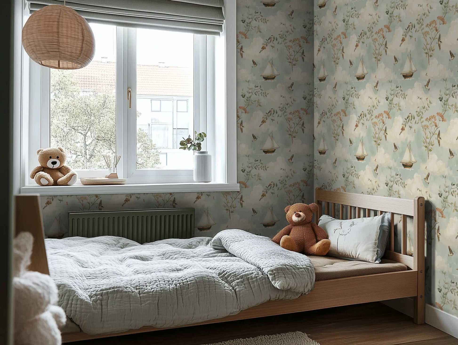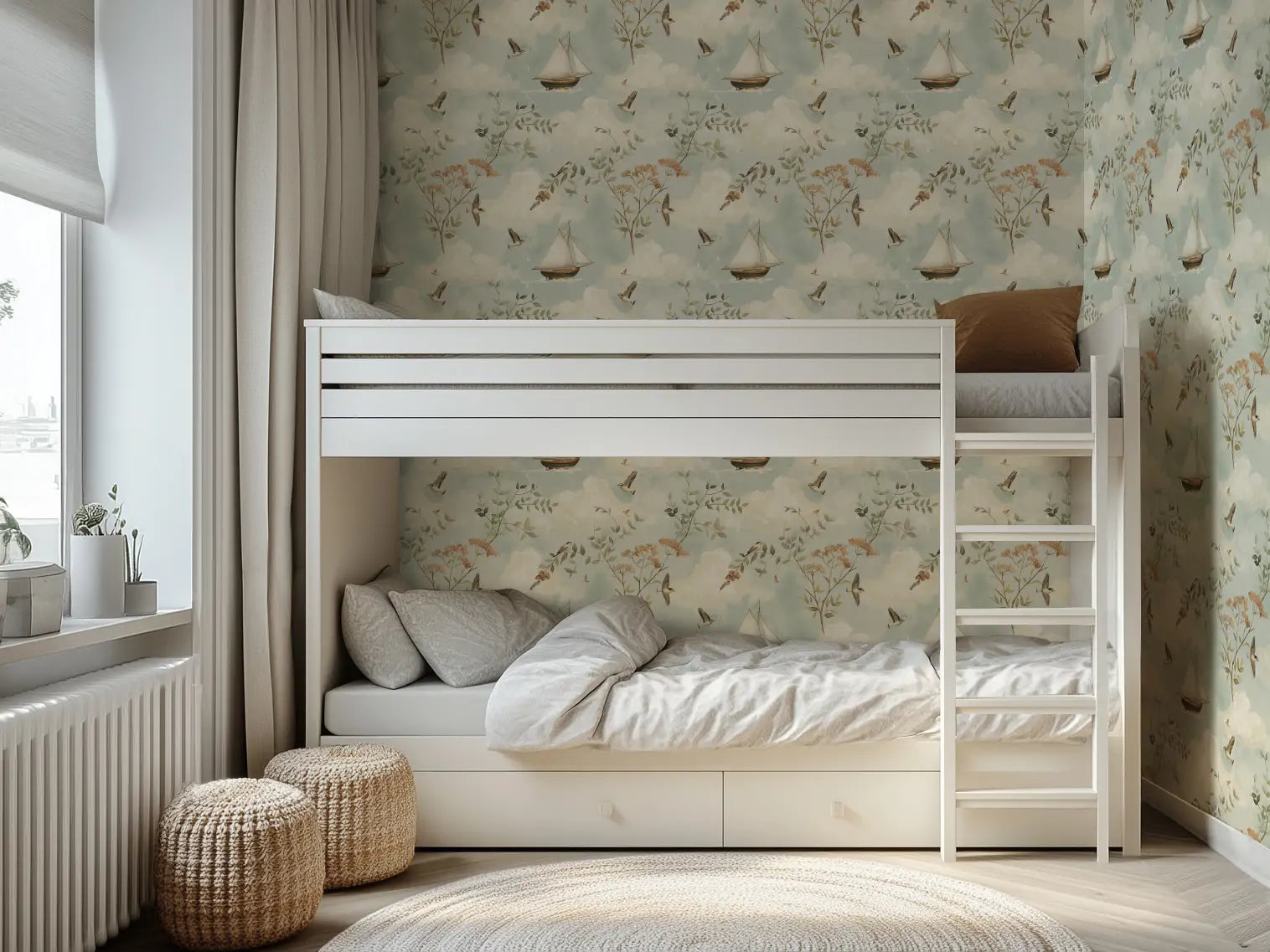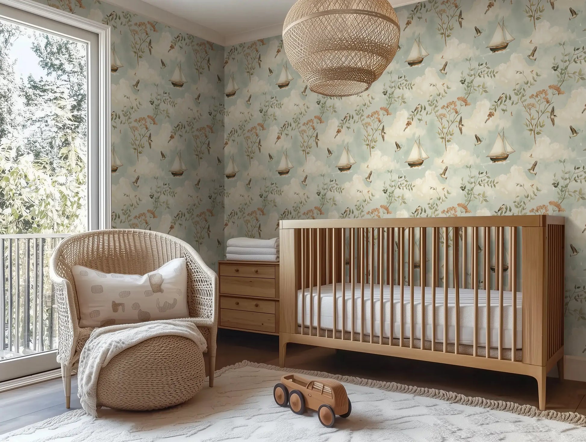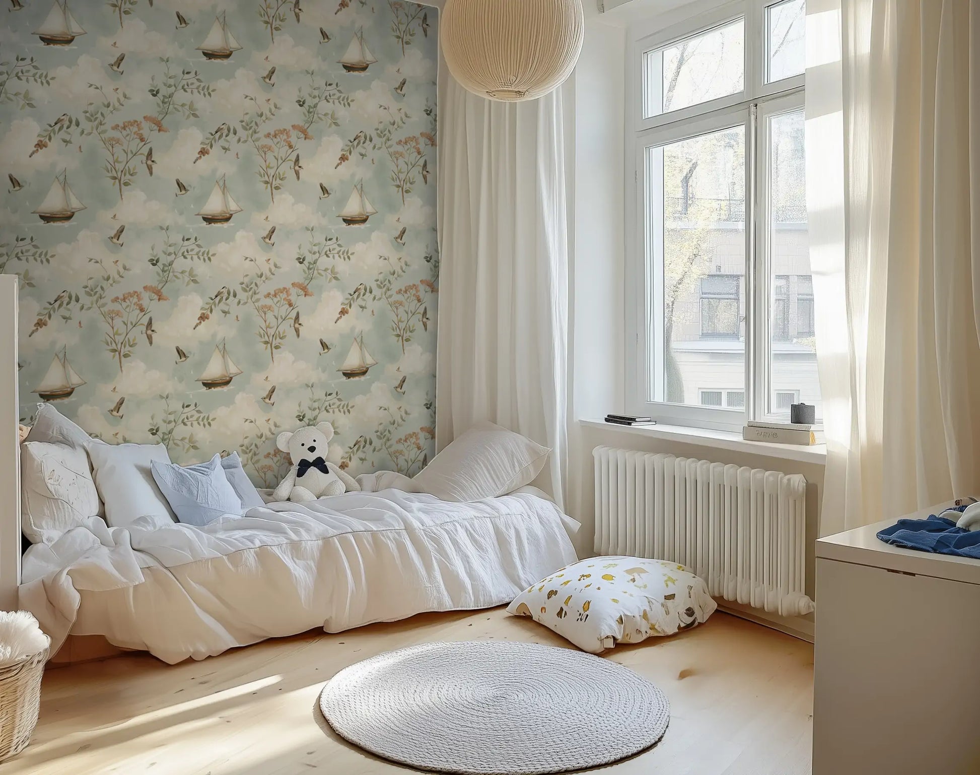 Part of the I Travel In My Dreams collection, this whimsical sailboat wallpaper mural is perfect for nurseries, kids' bedrooms, or play spaces that inspire exploration. Pair it with soft blues, natural wood, and airy linen textiles to create a calming, dreamlike retreat that feels like an endless voyage into the unknown."
