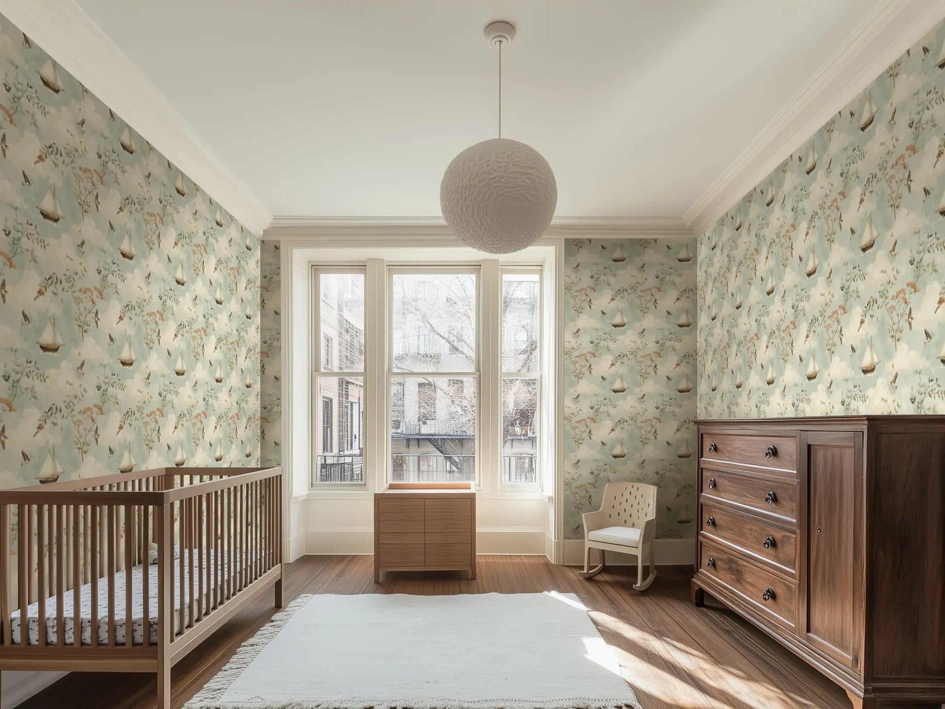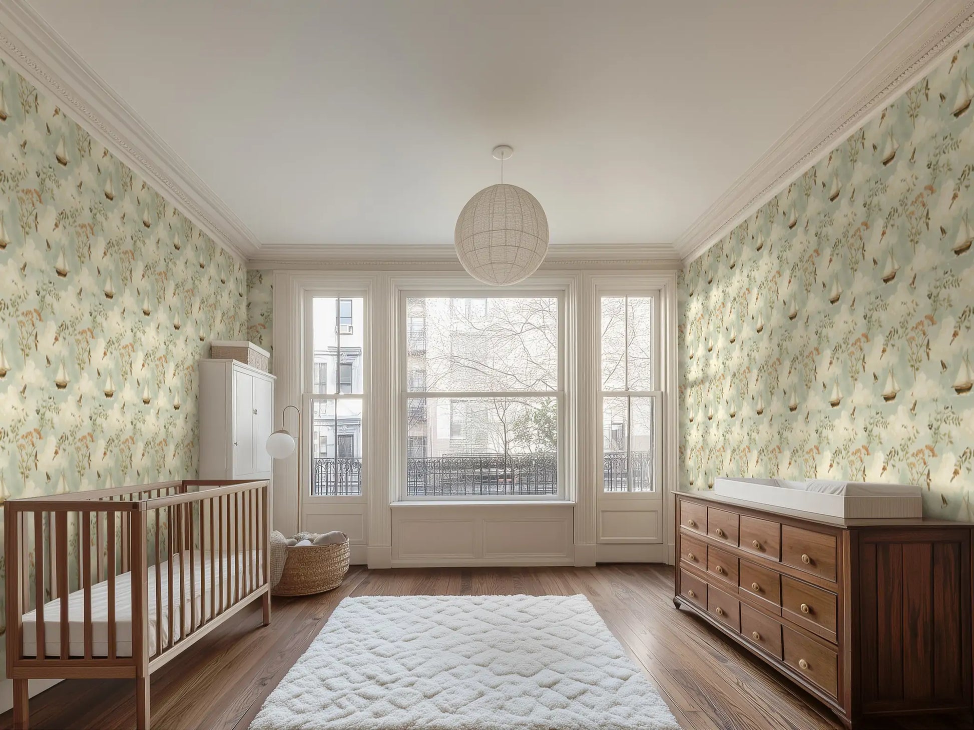 "Where the sea meets the sky, ships drift weightlessly through the clouds, carried by the winds of imagination. Sailing the Northern Sky is a storybook-inspired nautical wallpaper, where vintage sailboats glide past painterly clouds and soaring birds, evoking the magic of seafaring adventures beyond the horizon.