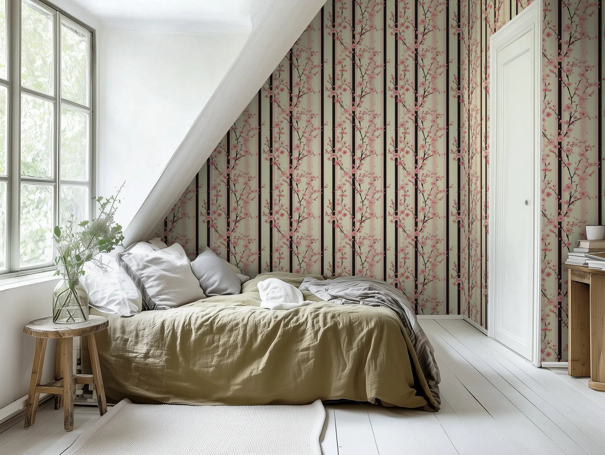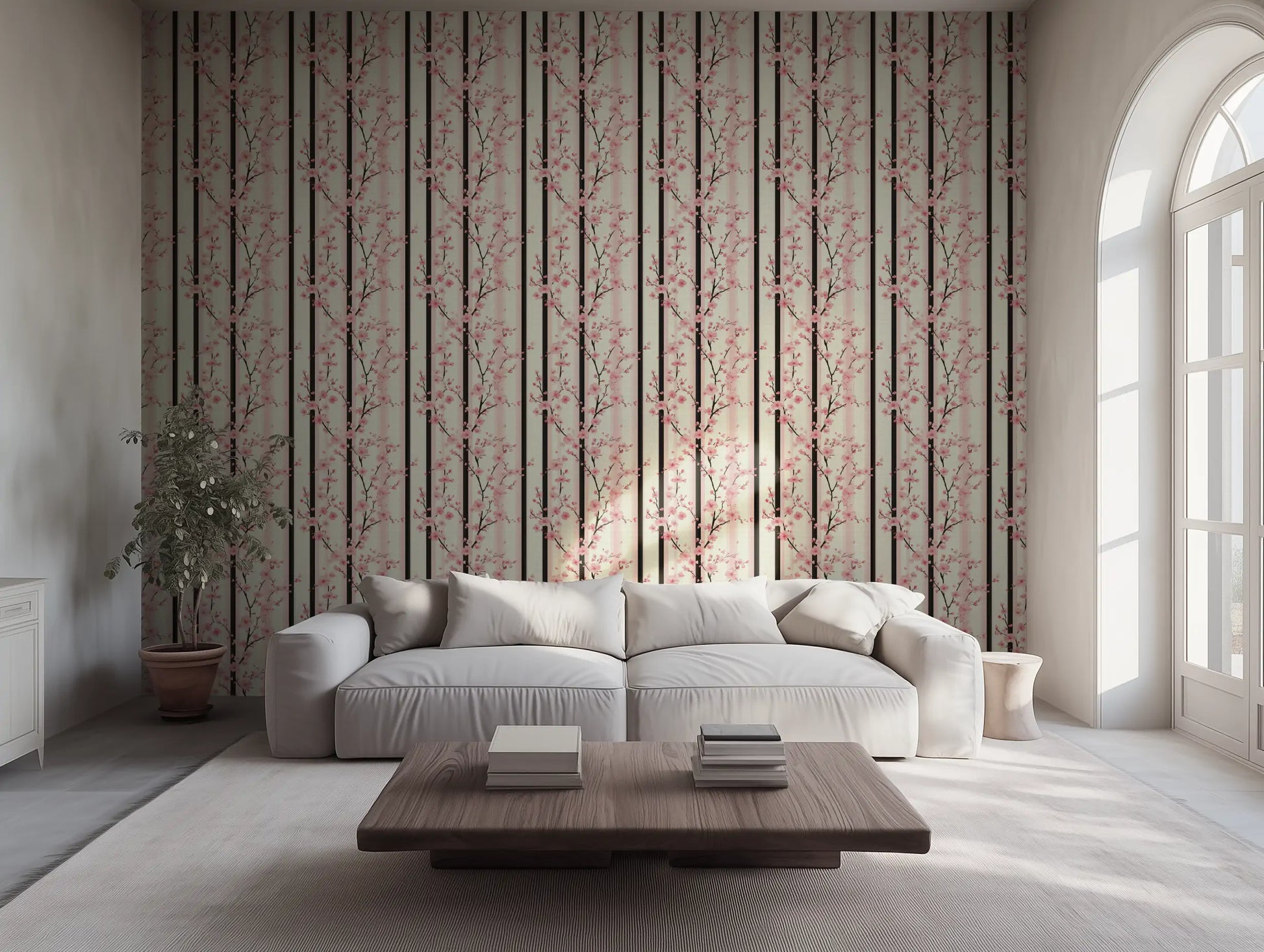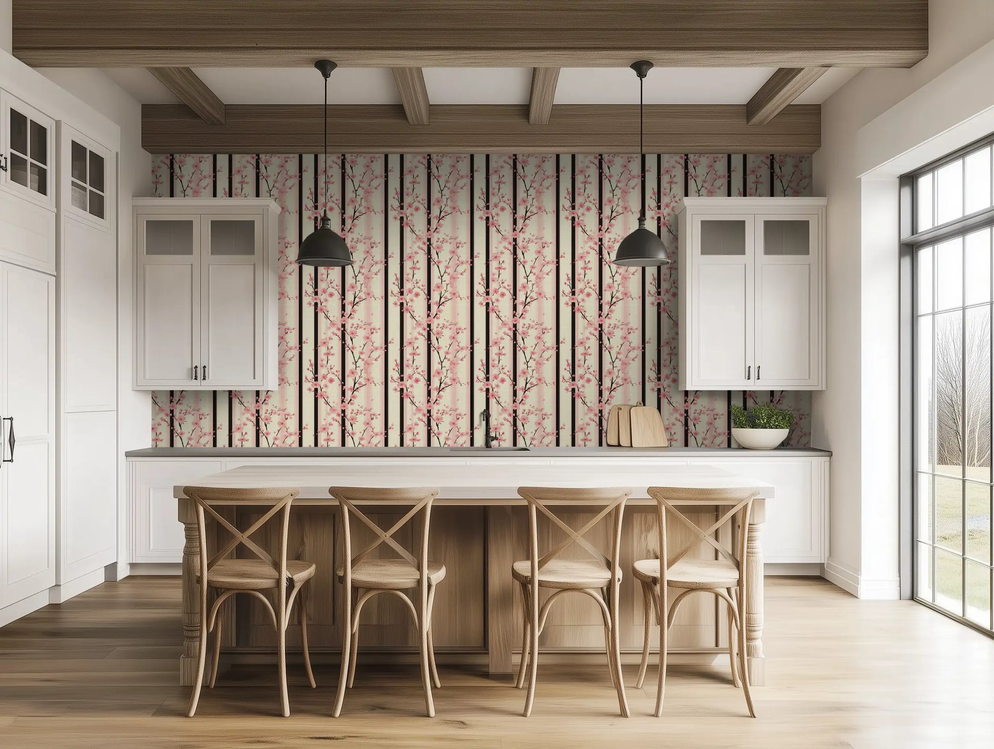 This isn’t a floral pattern—it’s a story in motion. Designed for art-driven interiors, dim-lit hideaways, or the kind of home that looks better after dark, this Japanese-inspired wallpaper pairs with bronze, black marble, and just the right amount of rebellion.