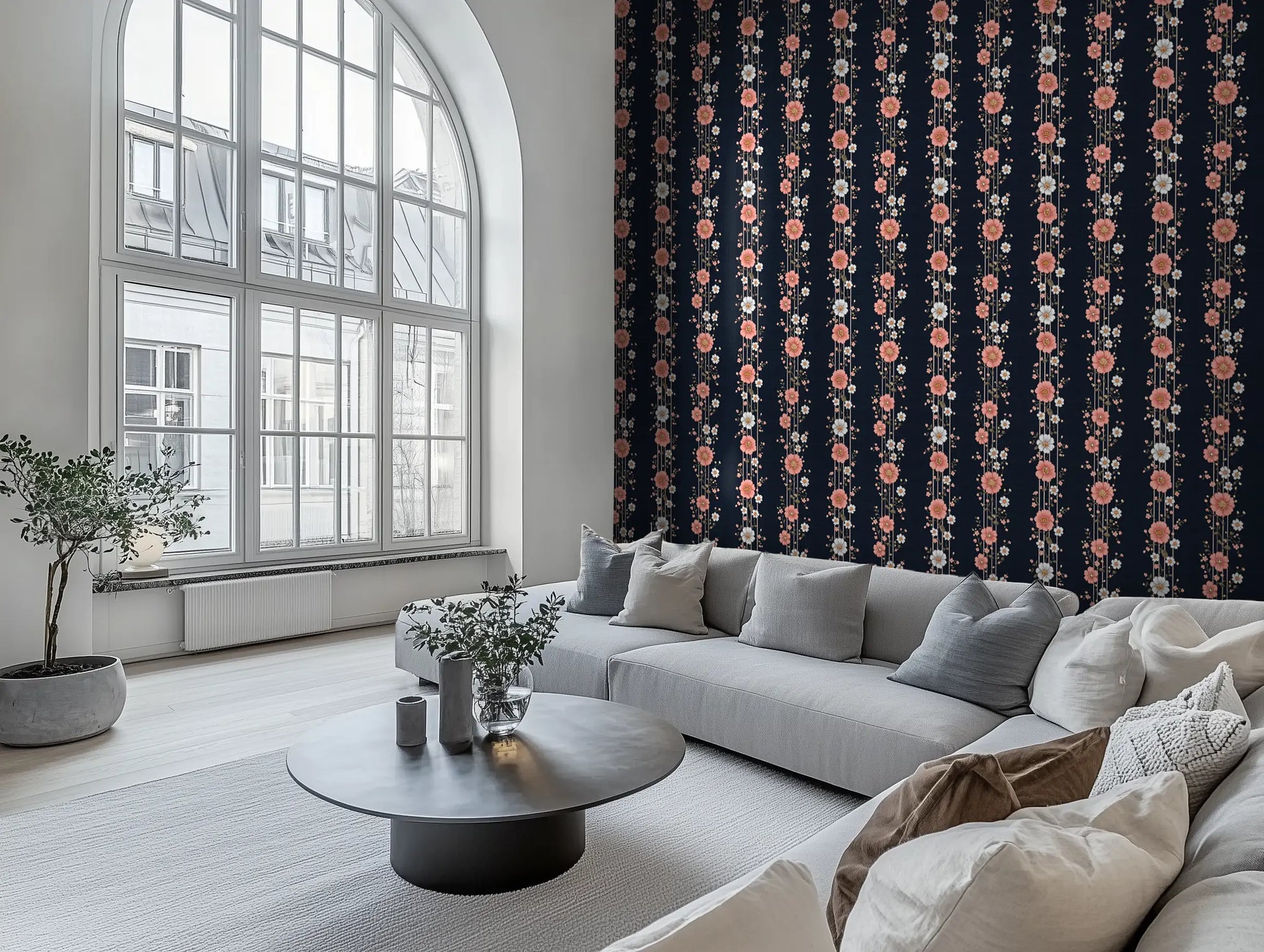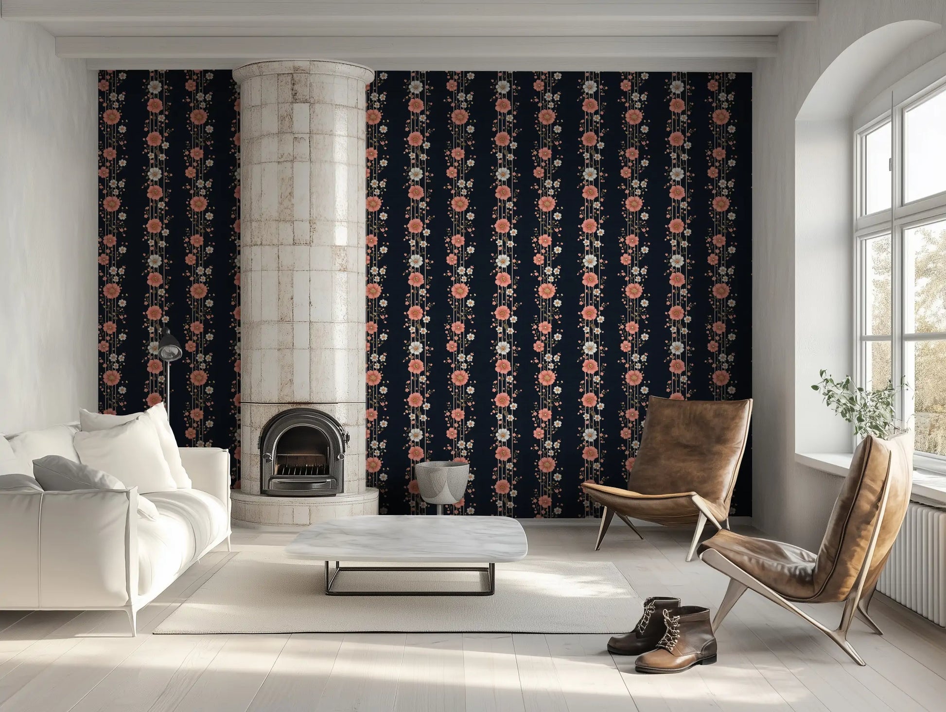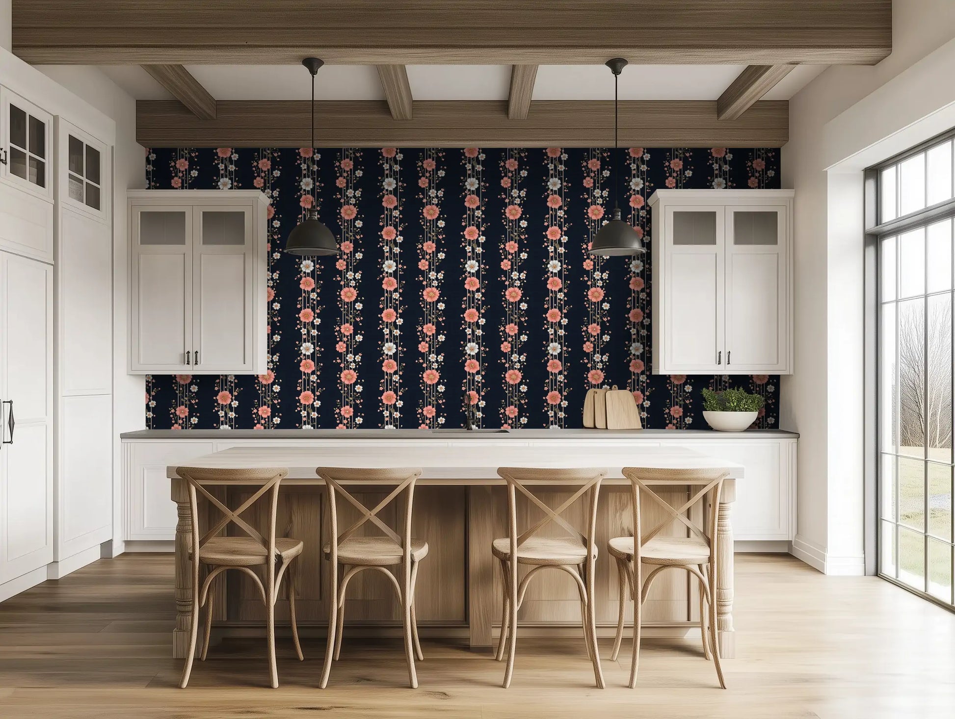 Set against a rich midnight blue, this Japanese floral wallpaper carries an air of timeless mystery, perfect for moody bedrooms, atmospheric dining spaces, or a lounge where the light is always soft and the stories never quite end. Pair it with brushed brass, dark lacquered furniture, and the kind of ambiance that lingers long after the last guests have left.