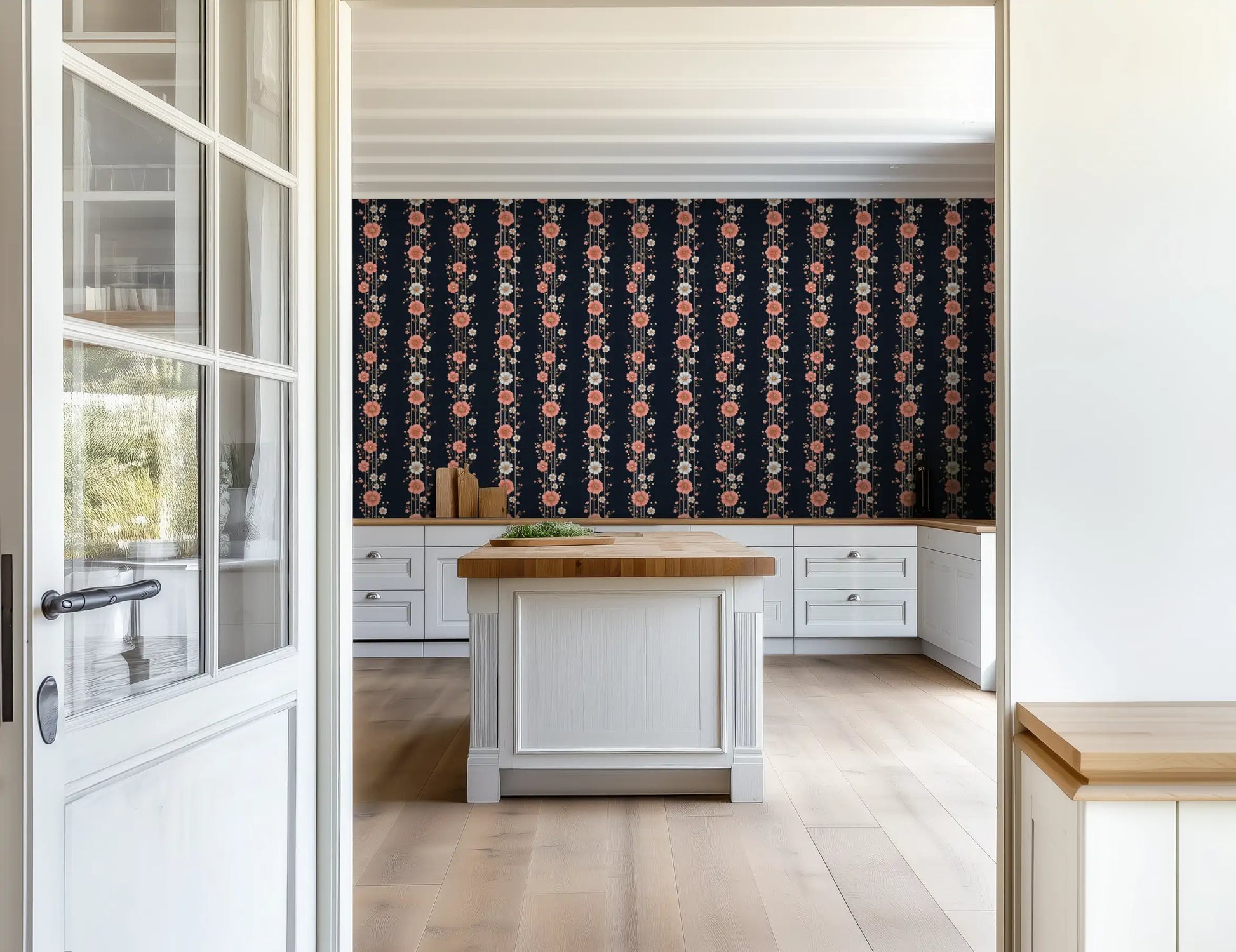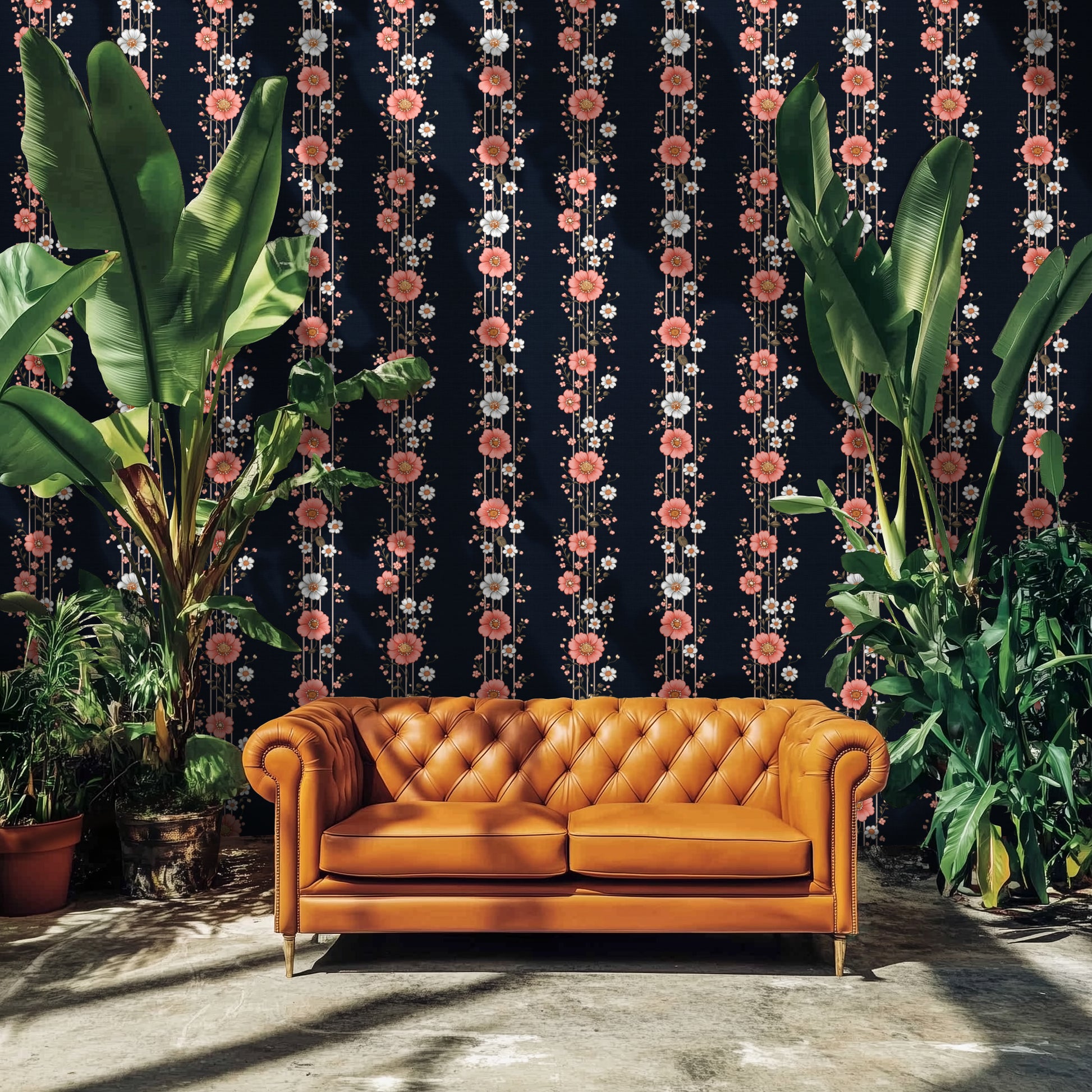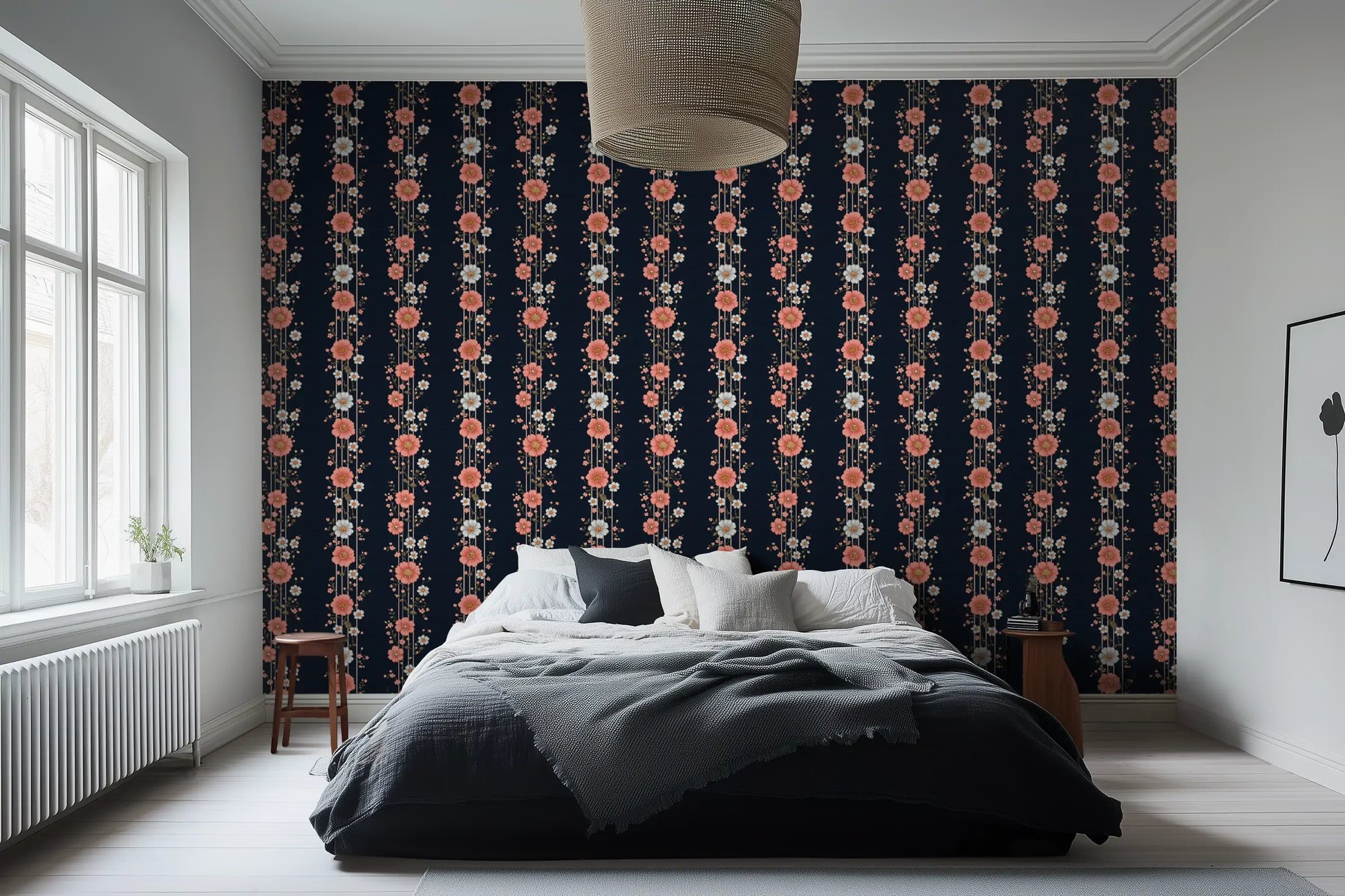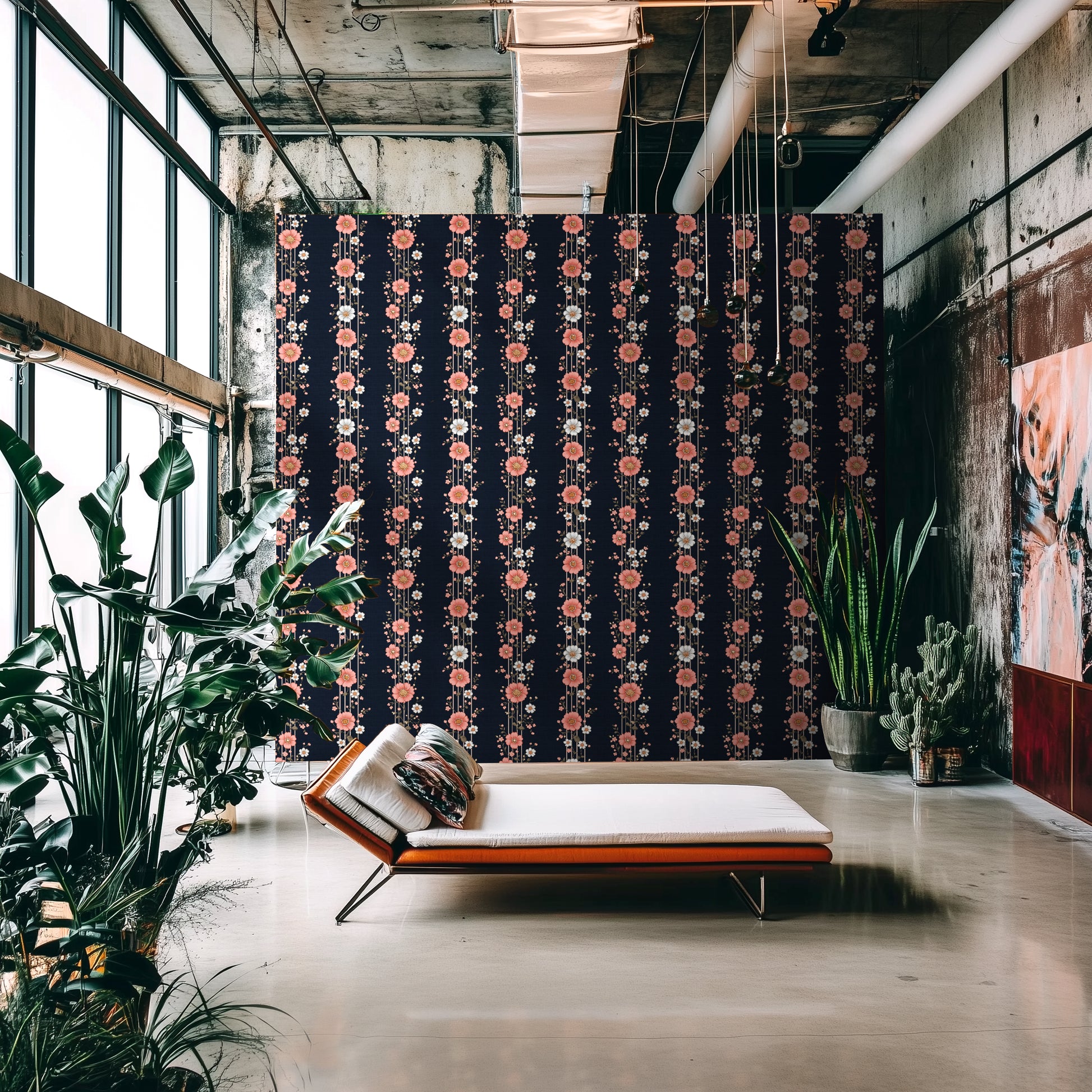 Set against a rich midnight blue, this Japanese floral wallpaper carries an air of timeless mystery, perfect for moody bedrooms, atmospheric dining spaces, or a lounge where the light is always soft and the stories never quite end. Pair it with brushed brass, dark lacquered furniture, and the kind of ambiance that lingers long after the last guests have left.