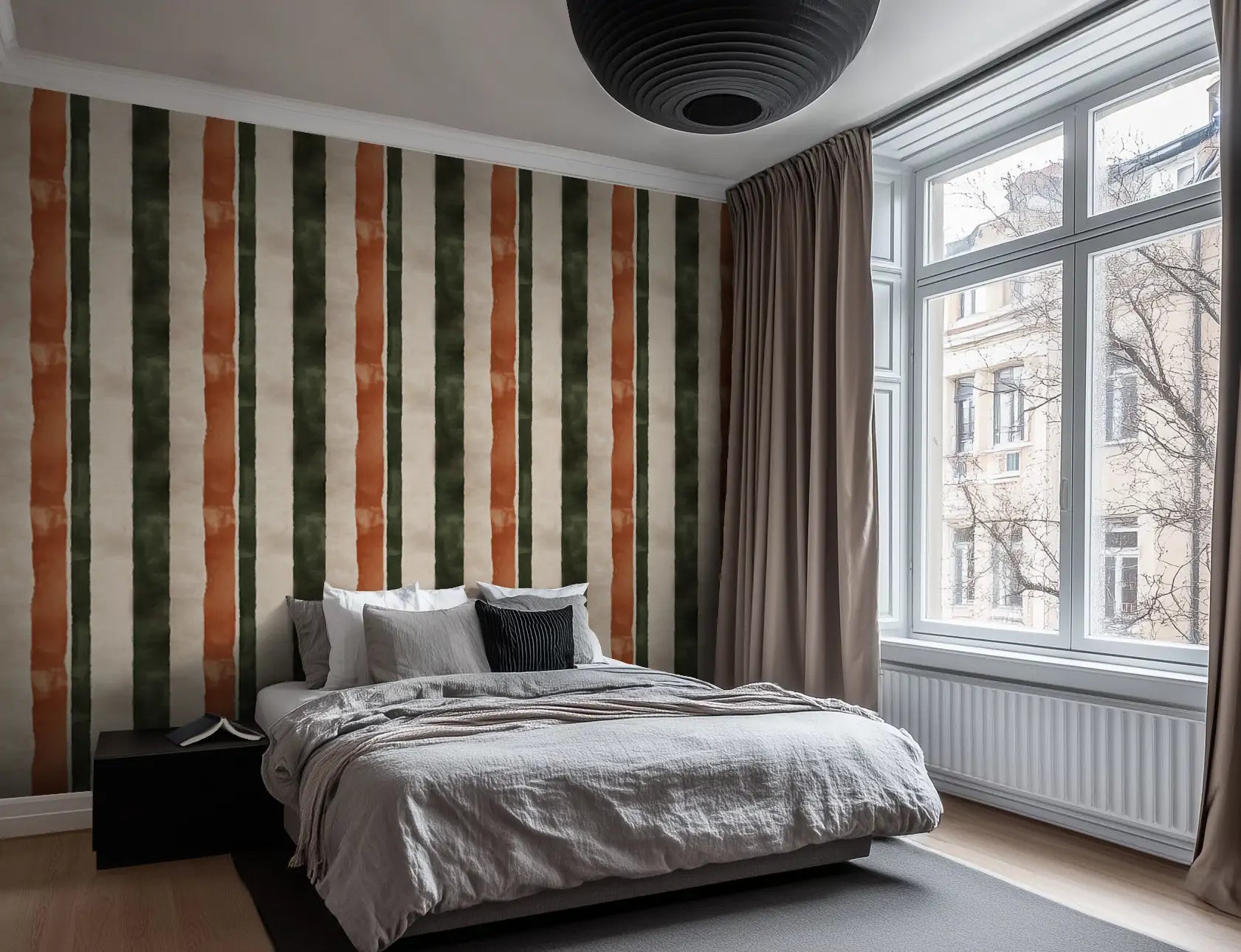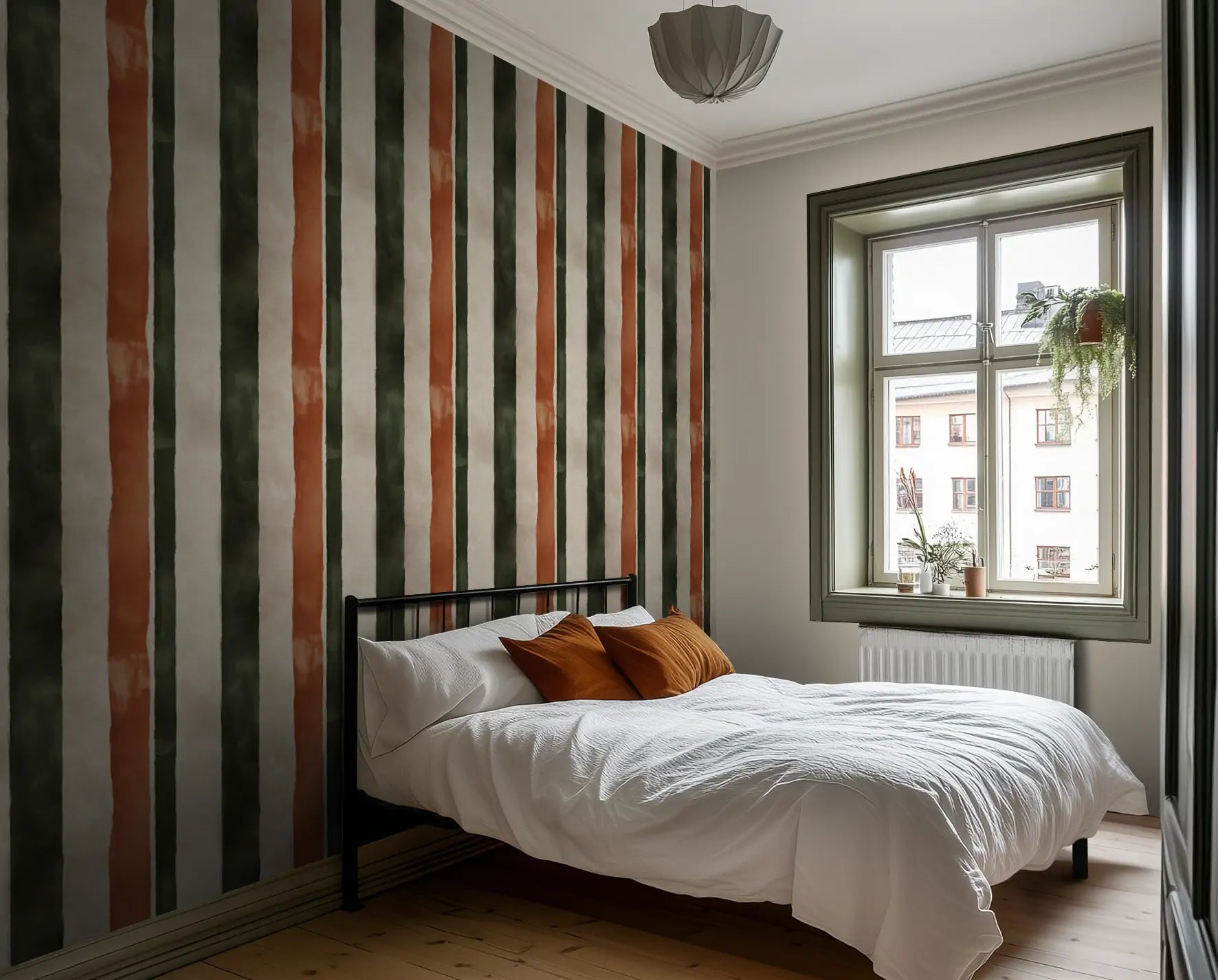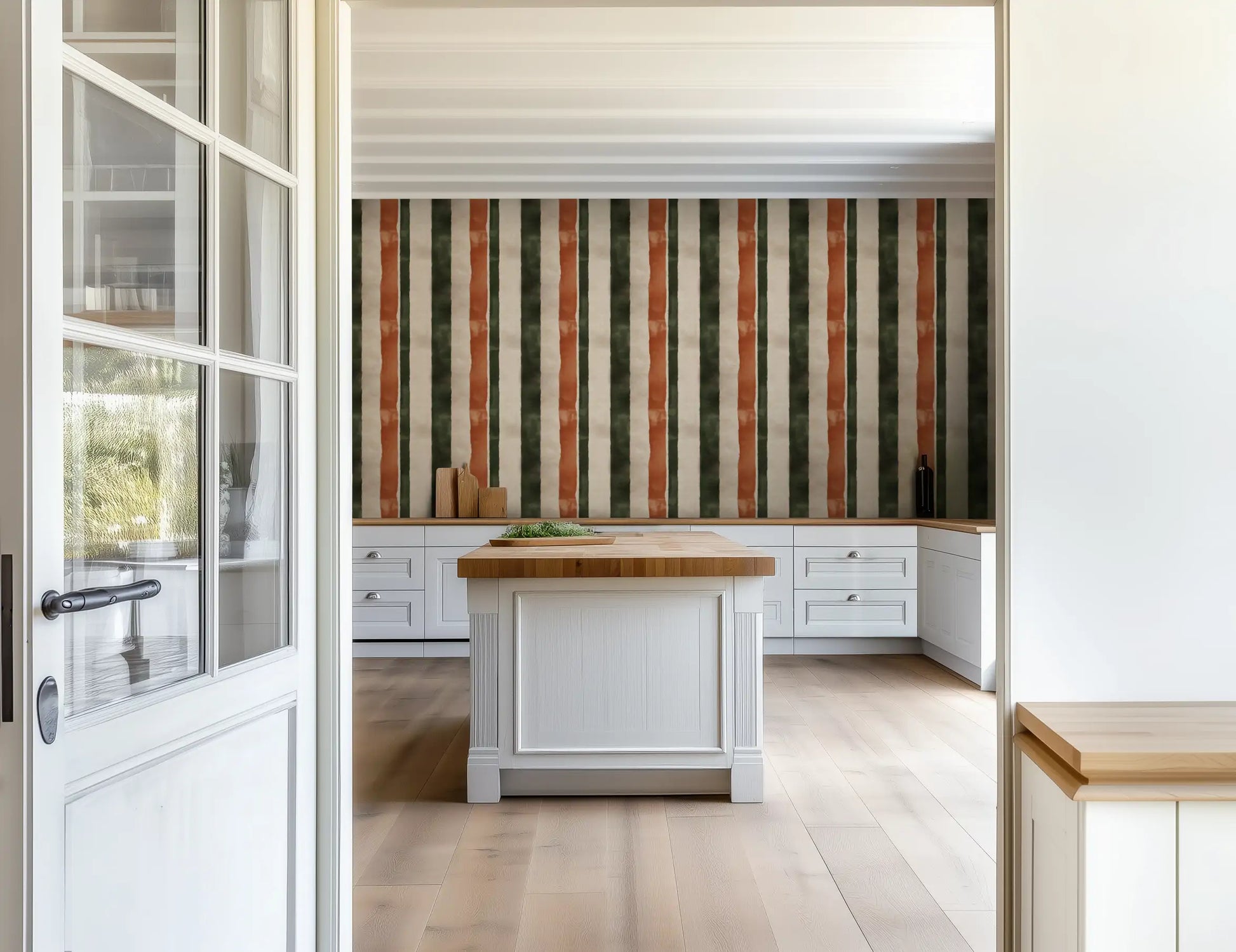 In the winding streets of Marrakech’s old medina, walls of sun-dried clay shift from rich ochre to deep terracotta with the changing light. Berber Clay reflects this natural gradient, featuring wide, hand-painted stripes of terracotta, earthy olive, and soft parchment.