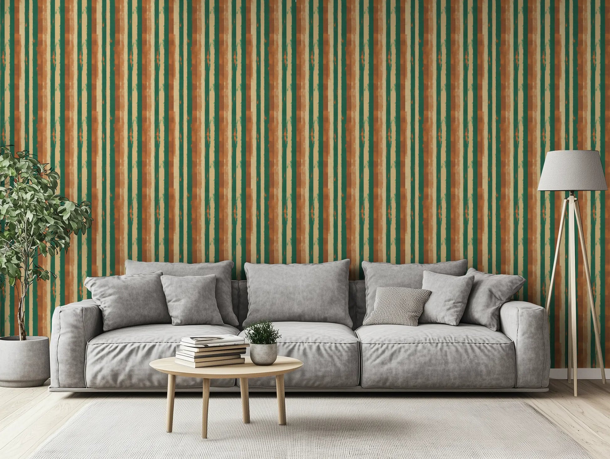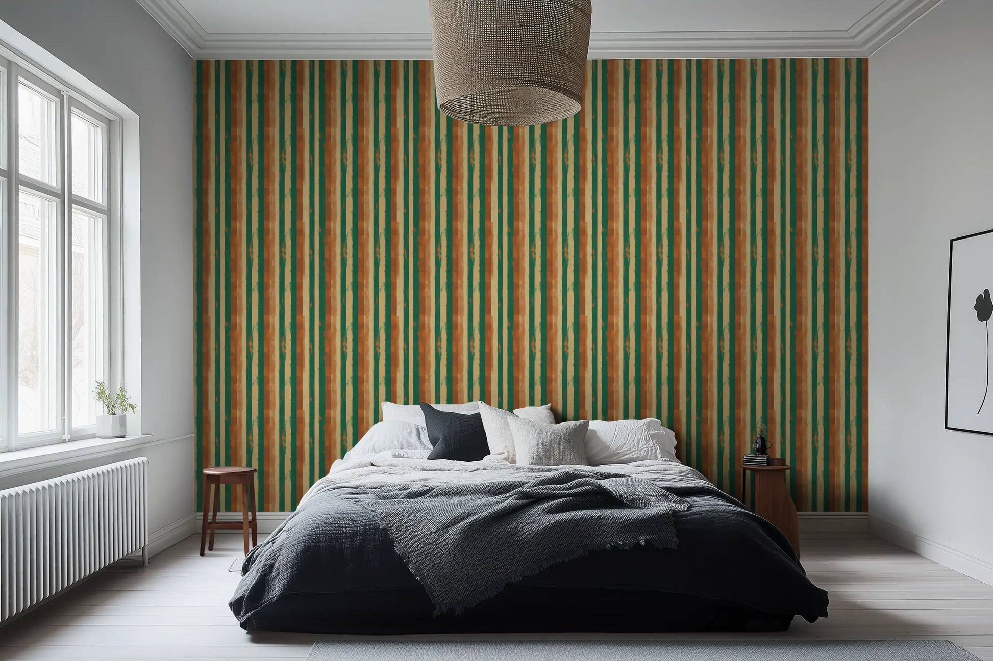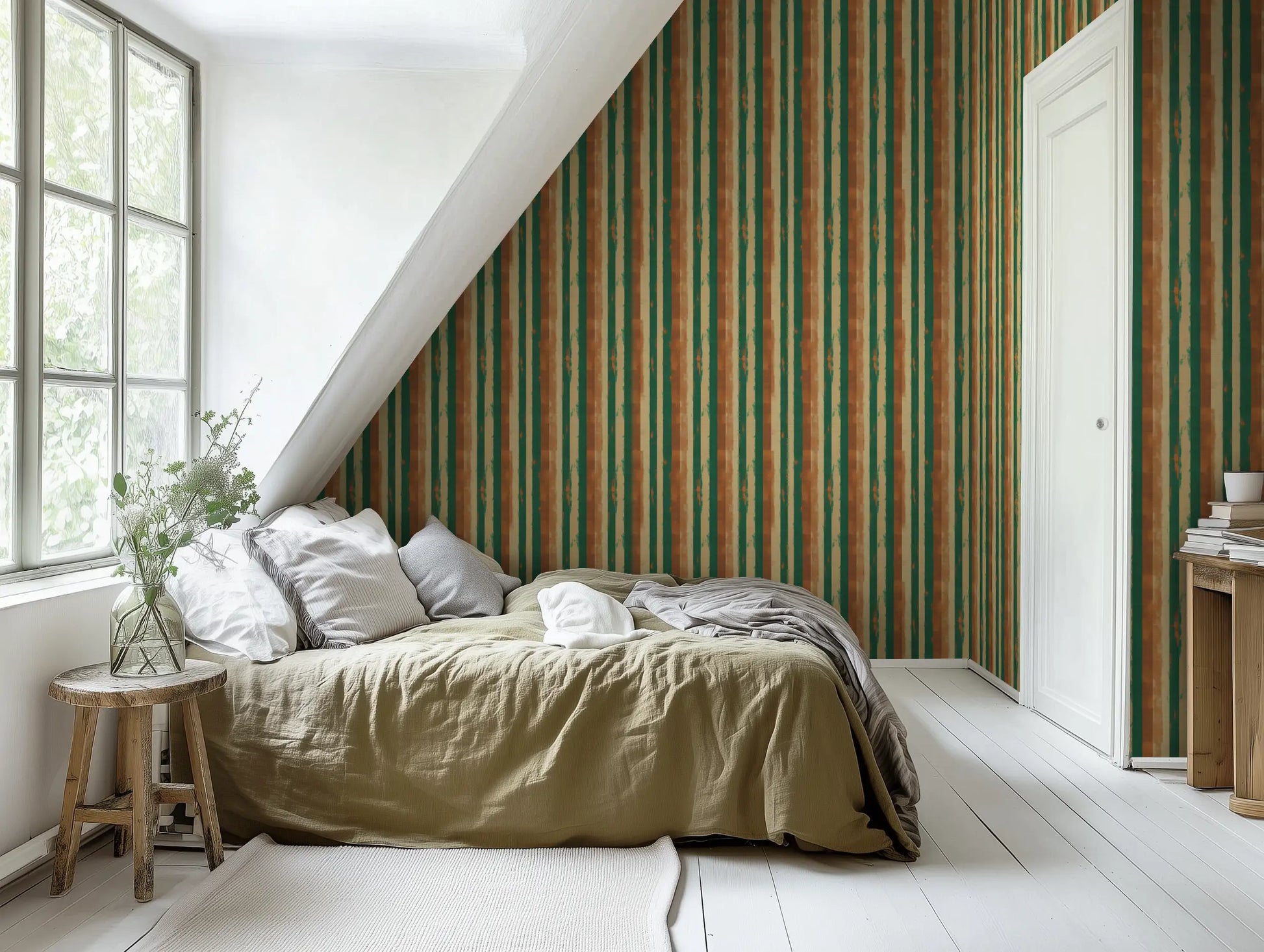 Inspired by the textured, sun-washed walls of Marrakech’s riads, Berber Earth blends natural pigments, woven textile aesthetics, and organic brushstroke stripes into a wallpaper that feels both grounded and artistic. The deep green and warm terracotta tones add a bold yet soothing balance, perfect for modern rustic and Mediterranean-inspired interiors.