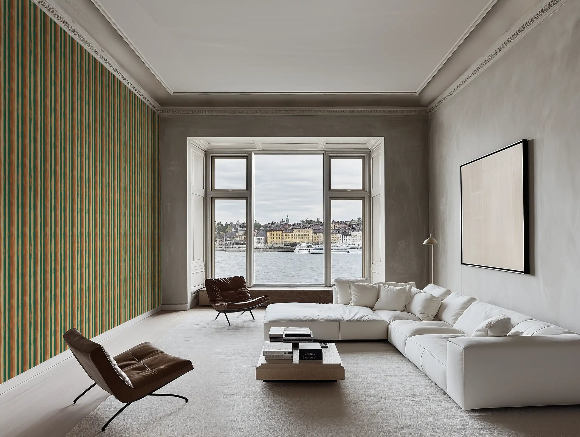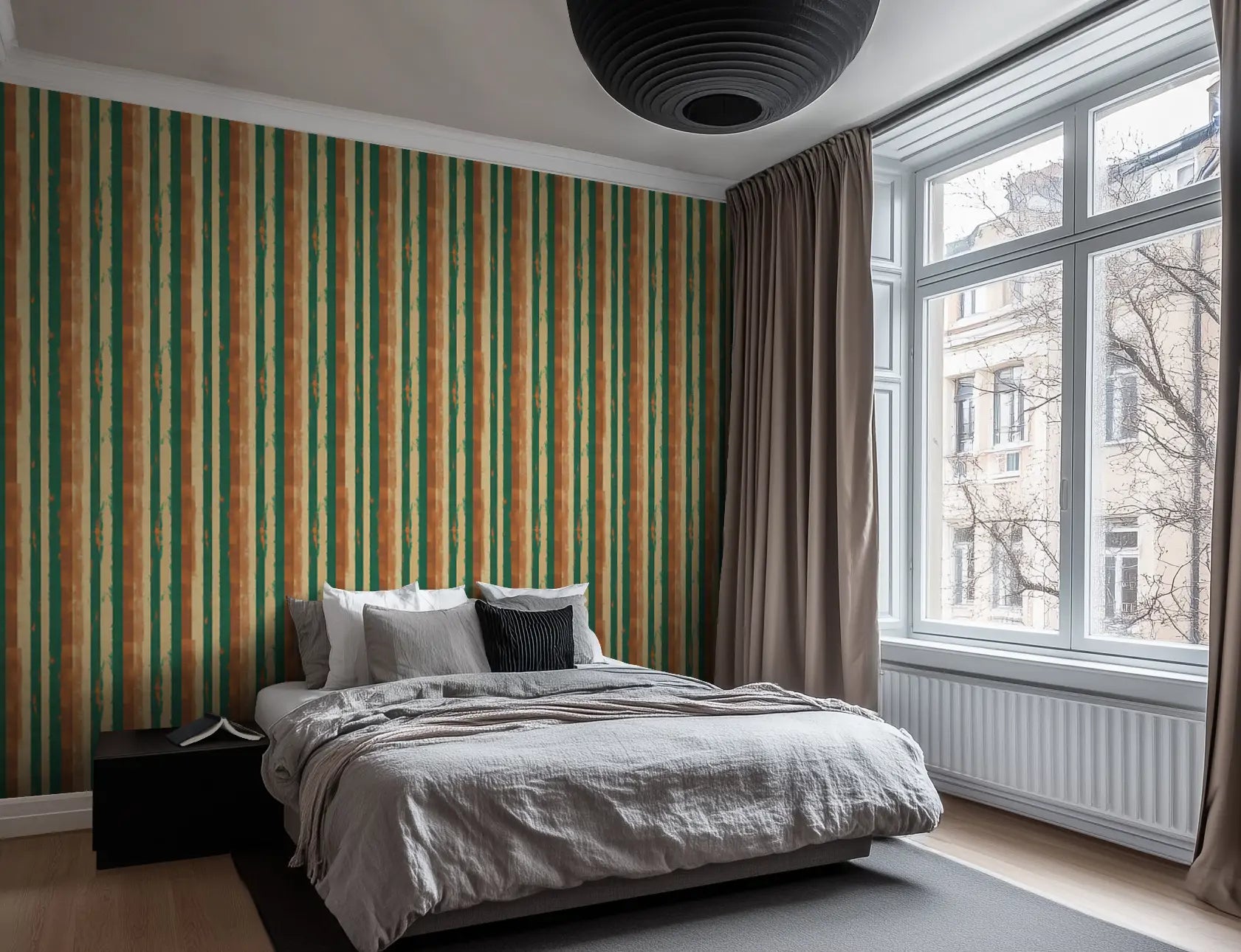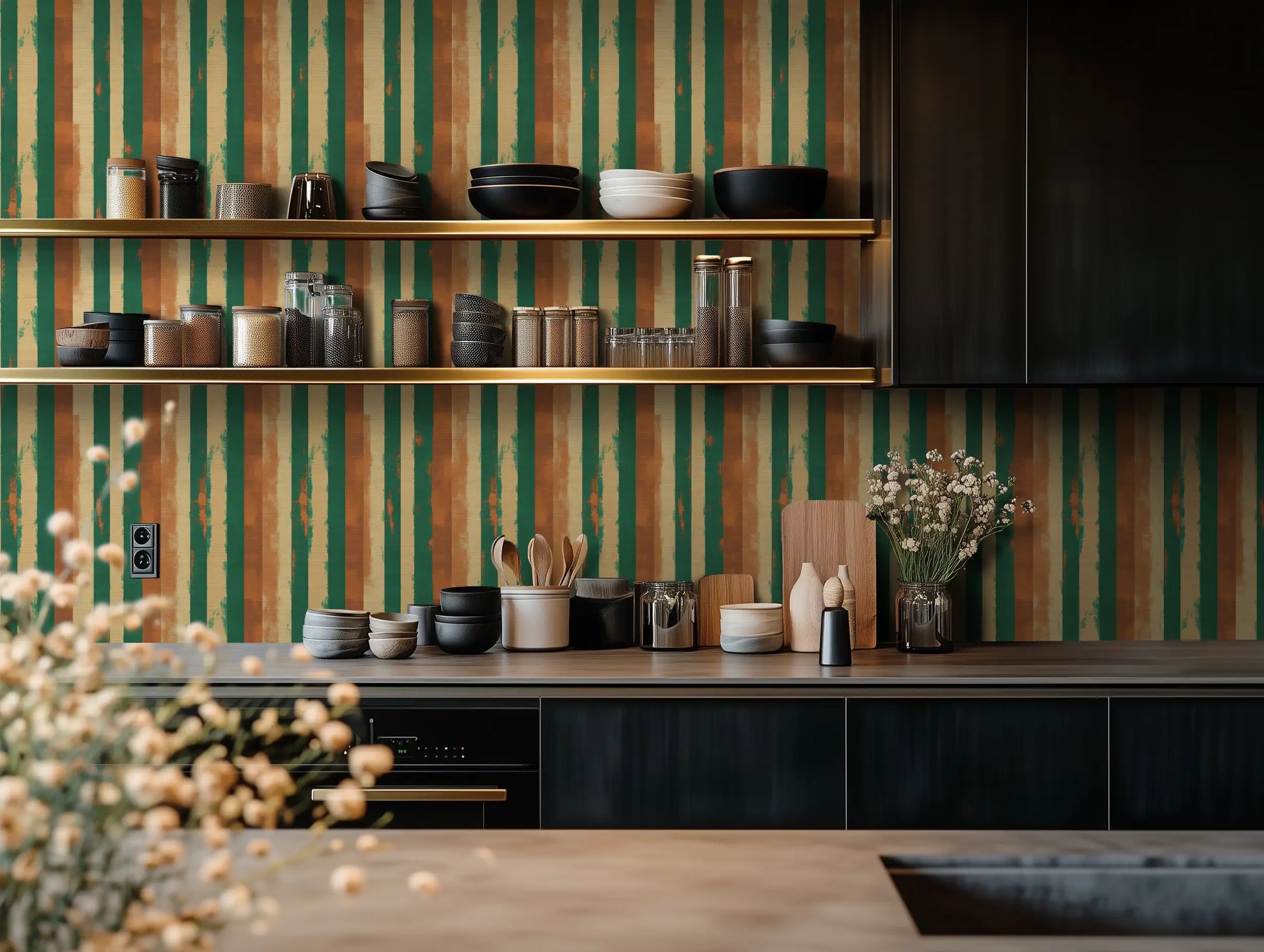 Inspired by the textured, sun-washed walls of Marrakech’s riads, Berber Earth blends natural pigments, woven textile aesthetics, and organic brushstroke stripes into a wallpaper that feels both grounded and artistic. The deep green and warm terracotta tones add a bold yet soothing balance, perfect for modern rustic and Mediterranean-inspired interiors.