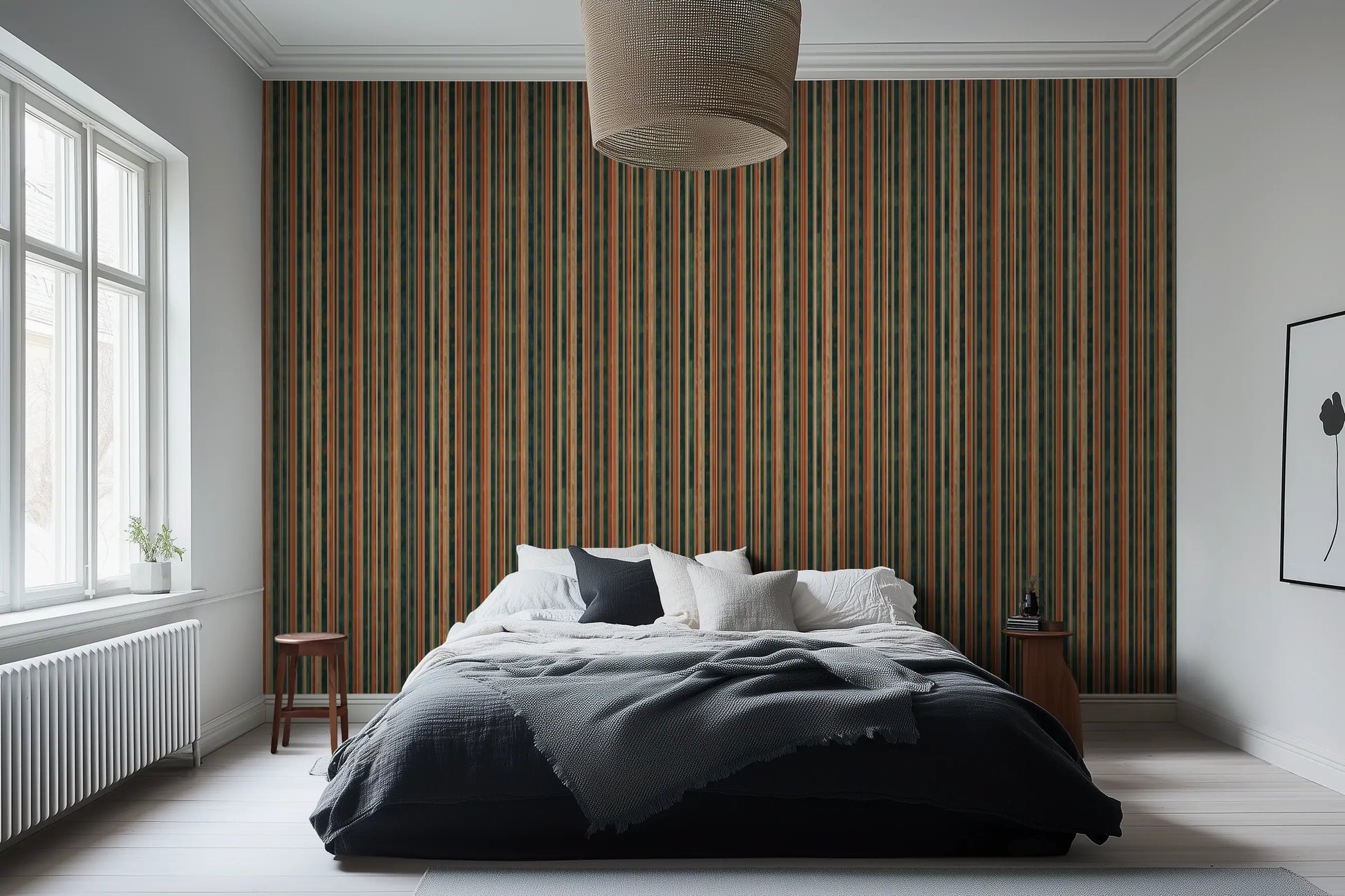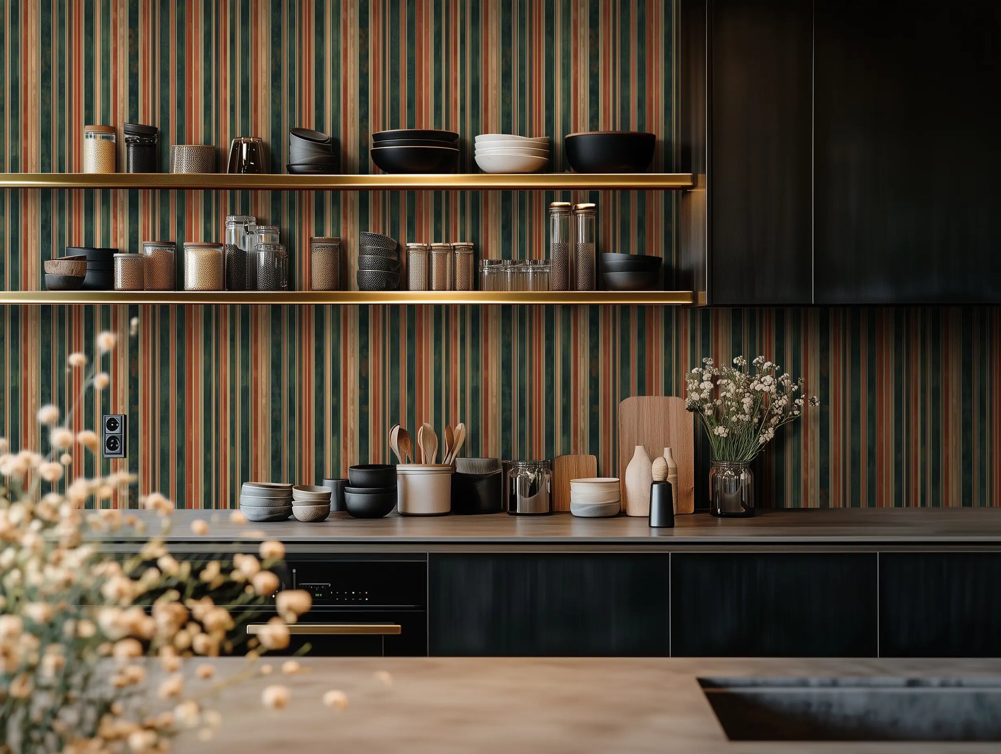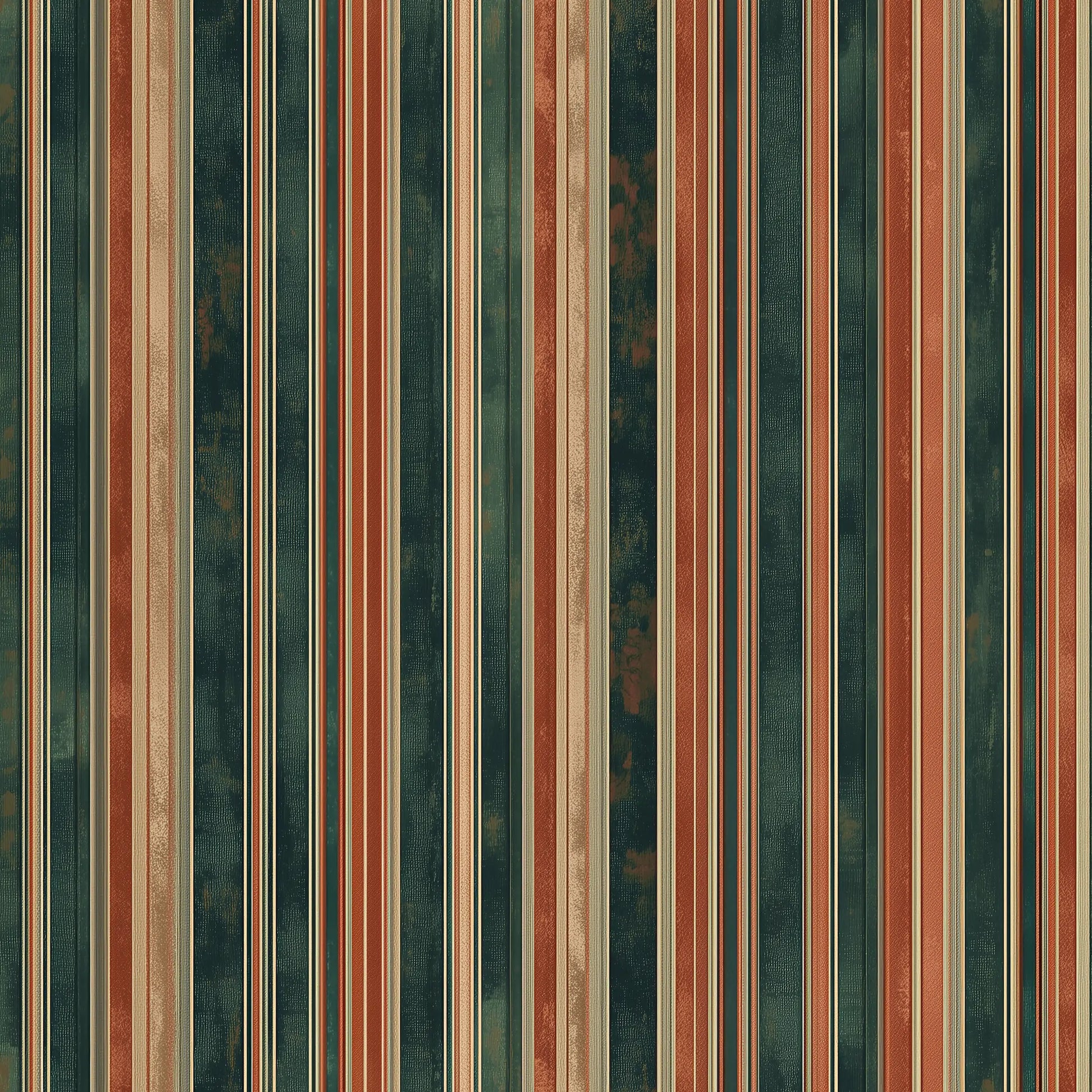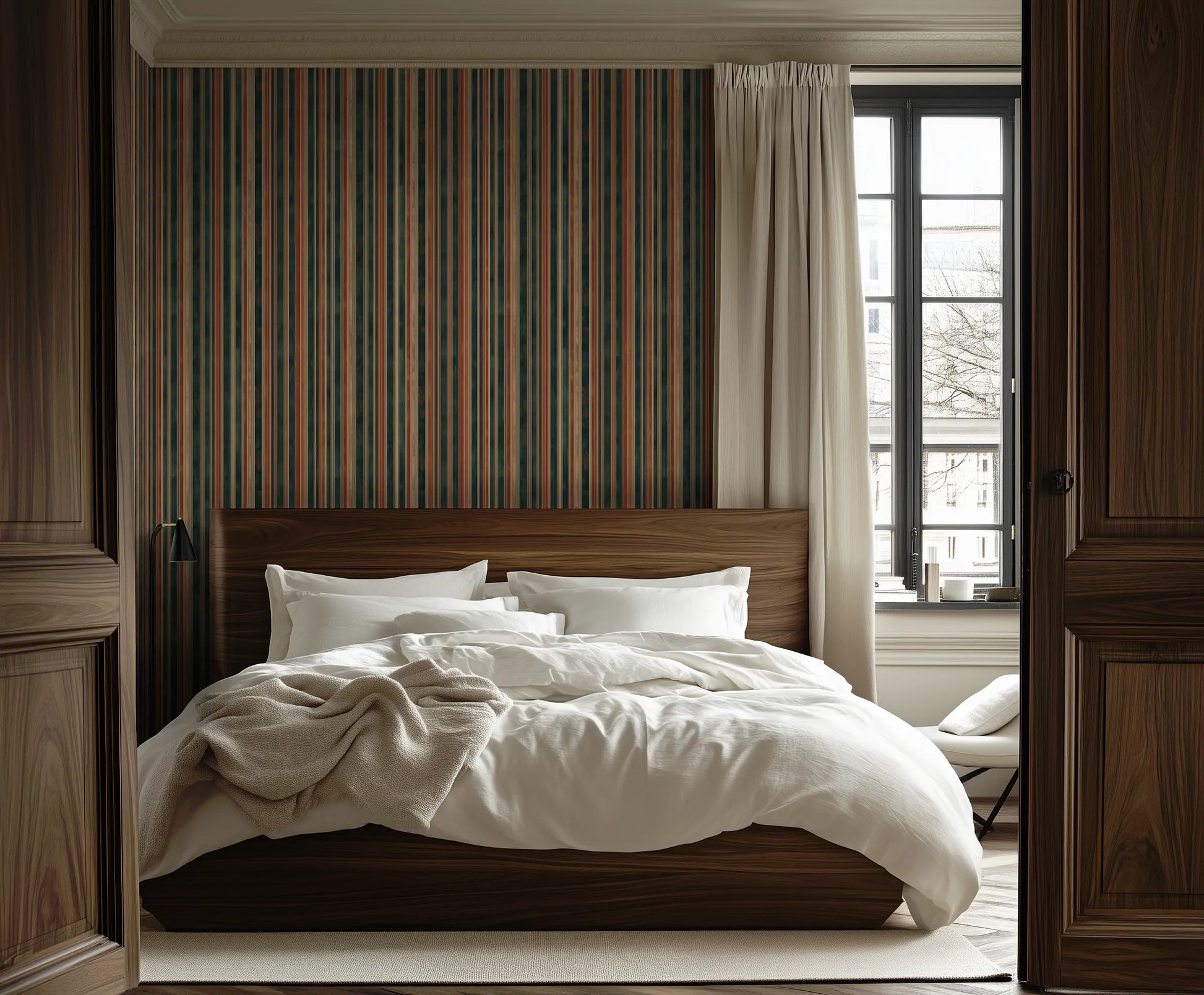 A walk through the spice souks—rows of saffron, paprika, cinnamon, and cumin piled high in brass bowls, their colors rich and intoxicating. Spice Souk takes this vibrant, well-traveled palette and transforms it into a classic, vintage-inspired striped wallpaper, with deep teal, burnt sienna, and faded gold hues.