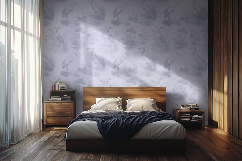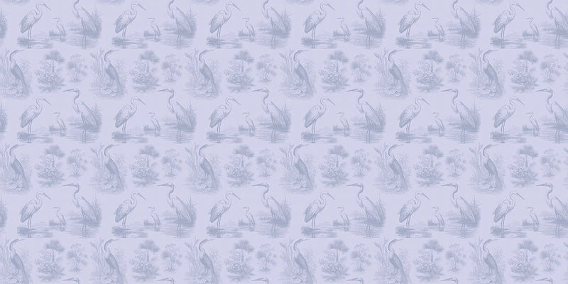 Light, serene, and dreamlike, Morning Chorus – Dusty Periwinkle on Soft Lavender Grey evokes the quiet of daybreak when soft mist hangs low over the water and herons begin to stir. The pale grey ground with periwinkle accents creates an atmosphere that’s calm, elegant, and quietly romantic.