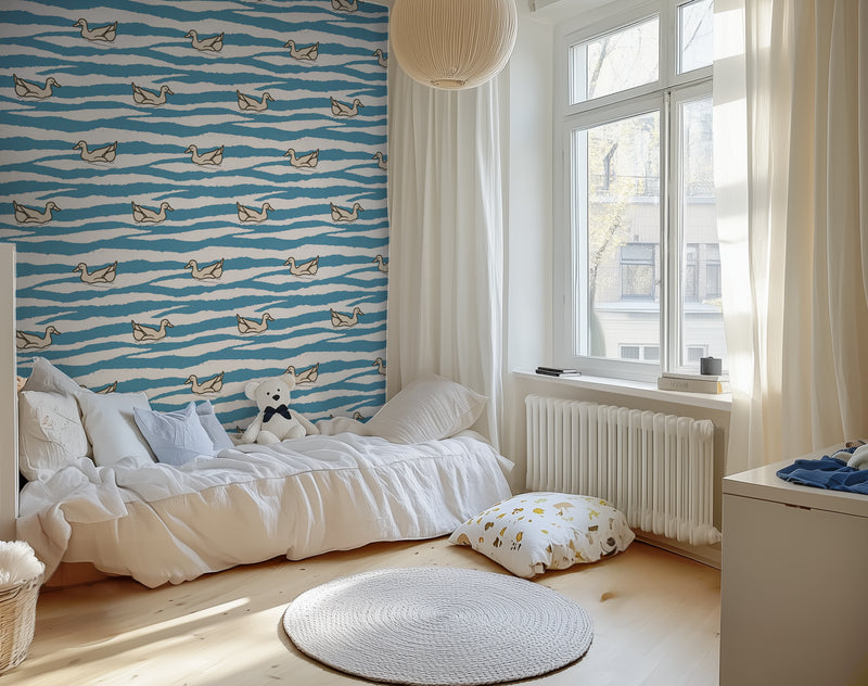 SEO Keywords: duck wallpaper, nursery wallpaper, kids bathroom wallpaper, blue and white kids wallpaper, repeating pattern wallpaper, peel and stick wallpaper, Scandinavian wallpaper for kids, pond wallpaper, duck print nursery, calming wallpaper for toddlers