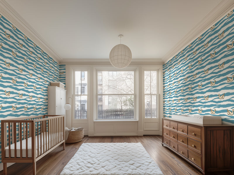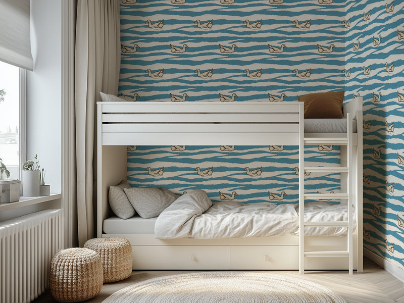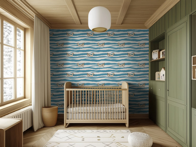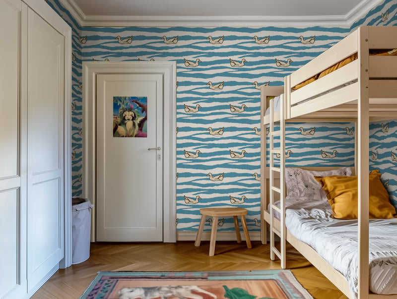 This seamless wallpaper is ideal for nurseries, bathrooms, or serene children’s rooms where you want to create a peaceful, whimsical backdrop. Its organic wave lines and soft duck illustrations strike the perfect balance between pattern and poetry, adding visual movement without overwhelming the space.