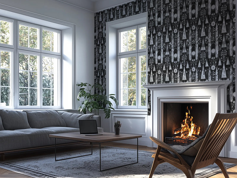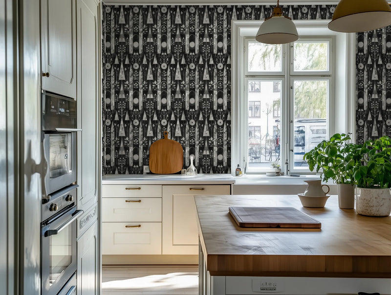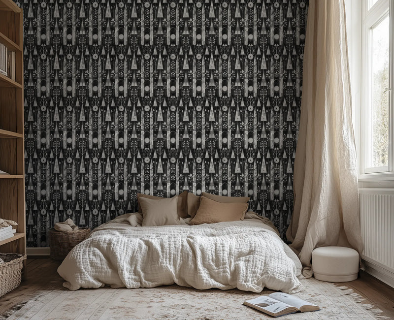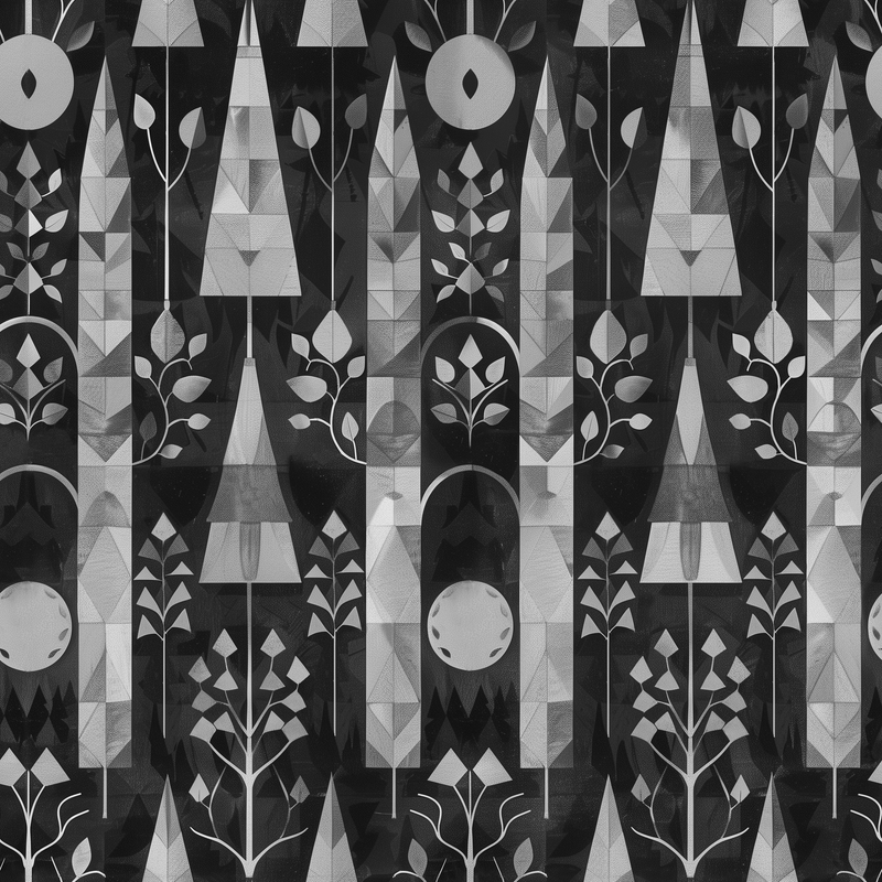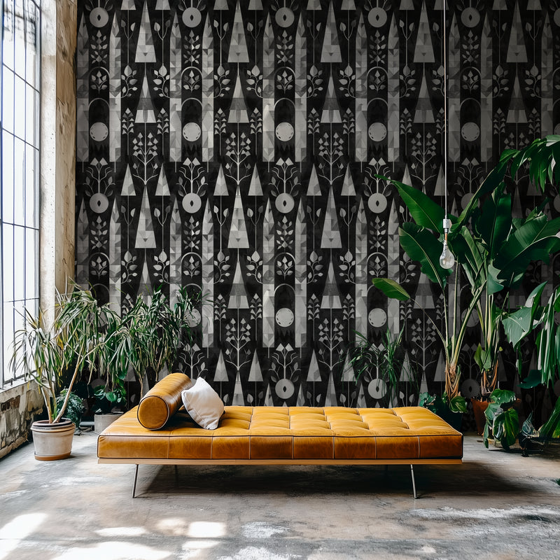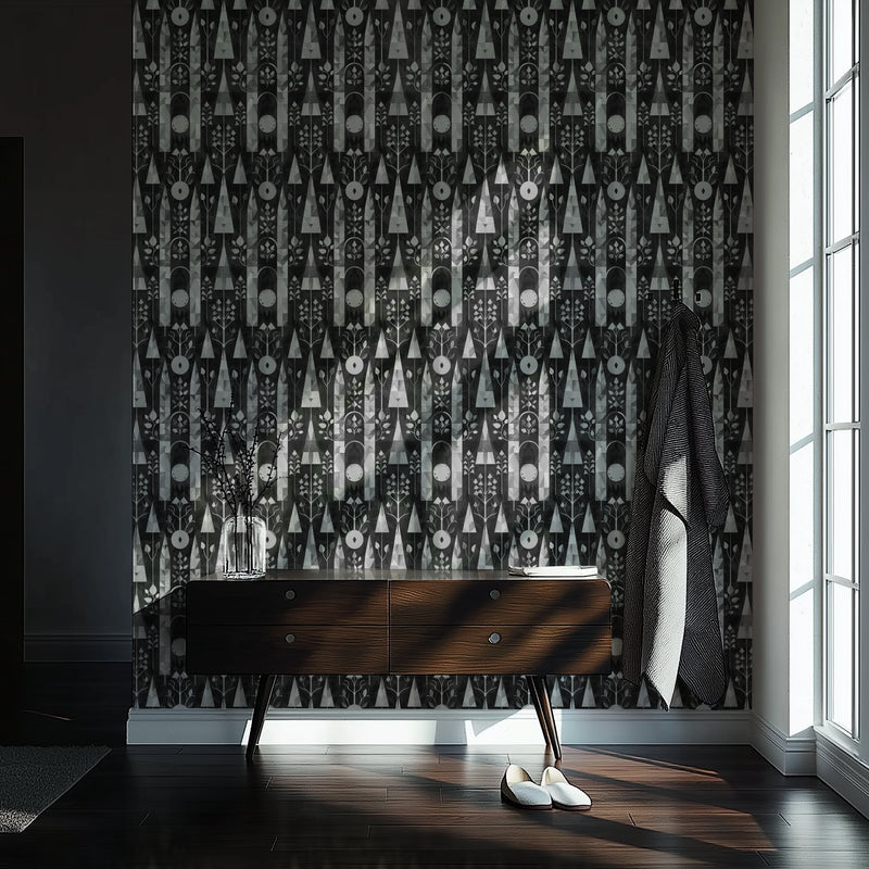 Step into Moonlit Arcadia, where the symmetry of Art Deco meets the mystique of an enchanted forest. This isn’t just wallpaper—it’s a portal to a dreamscape of towering spires, geometric trees, and a moonlit canopy that feels like a forgotten legend whispered through the night. A fusion of midnight blacks, silvery highlights, and angular botanical forms, this design is both architectural and organic, a balance of precision and wonder.