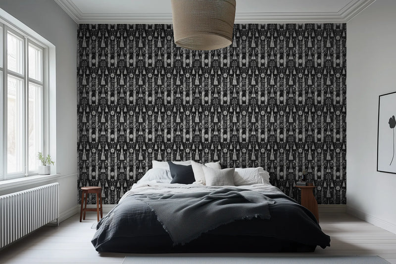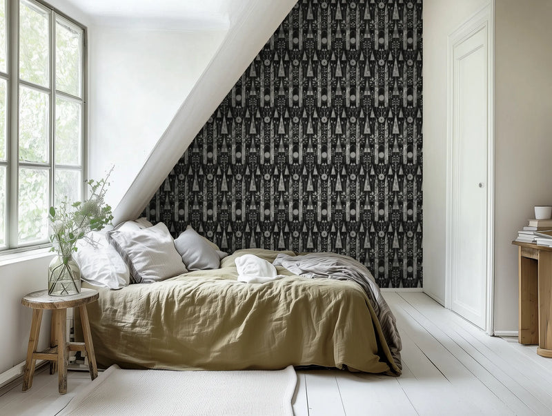 Whether it graces your bedroom, living room, hallway, dining space, or even a statement powder room, Moonlit Arcadia creates an immersive, almost cinematic atmosphere. The structured pattern elongates walls, drawing the eye upward like the gothic silhouettes of ancient trees or the skyline of a lost Art Deco metropolis.