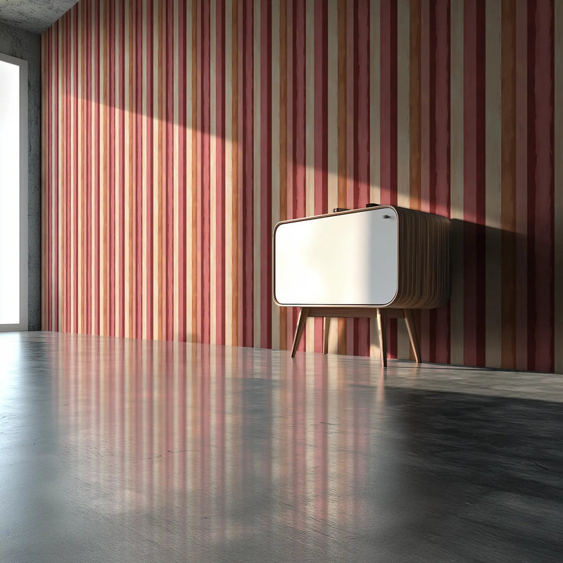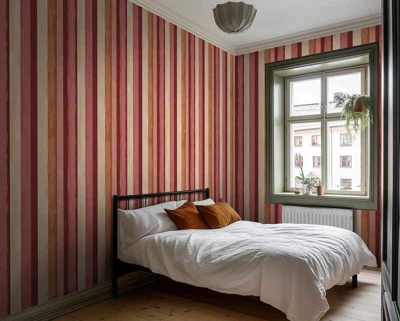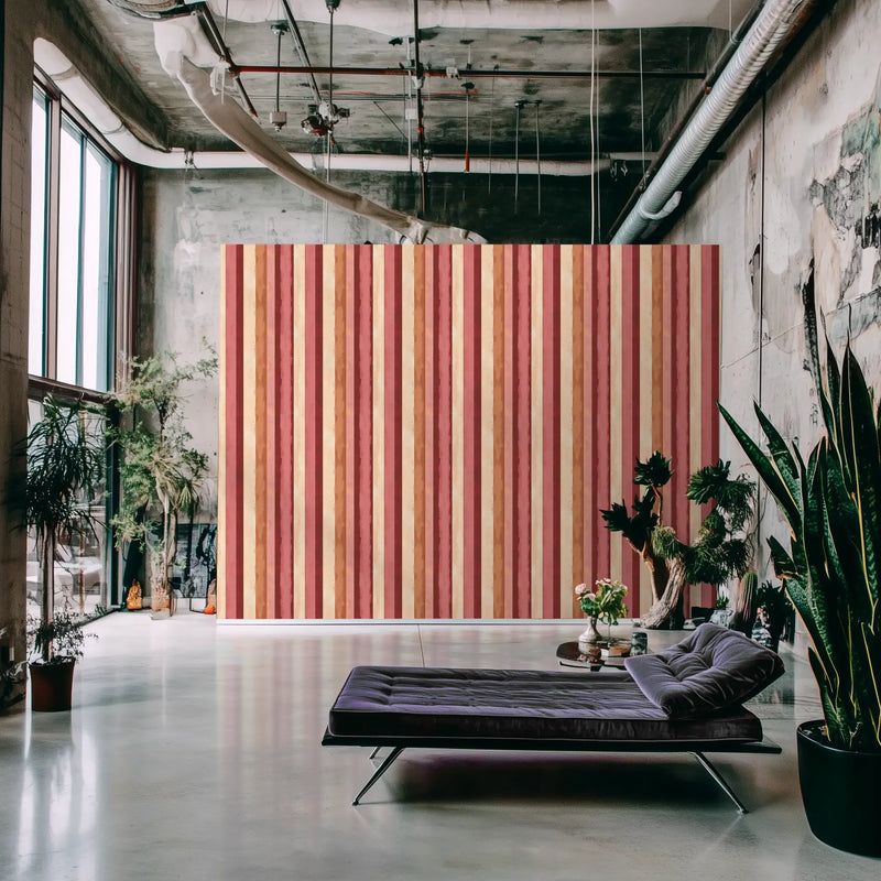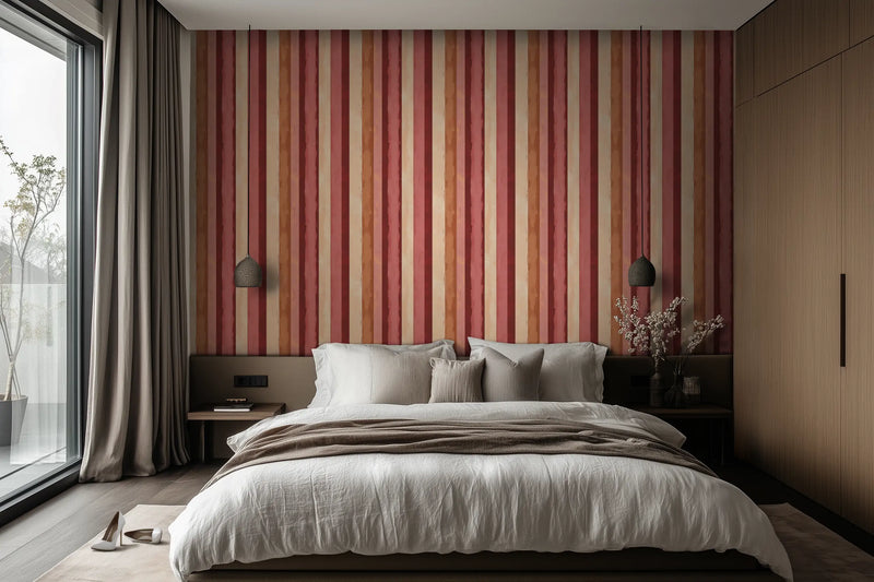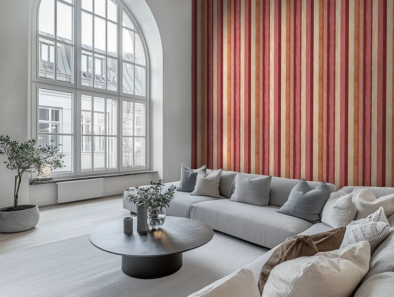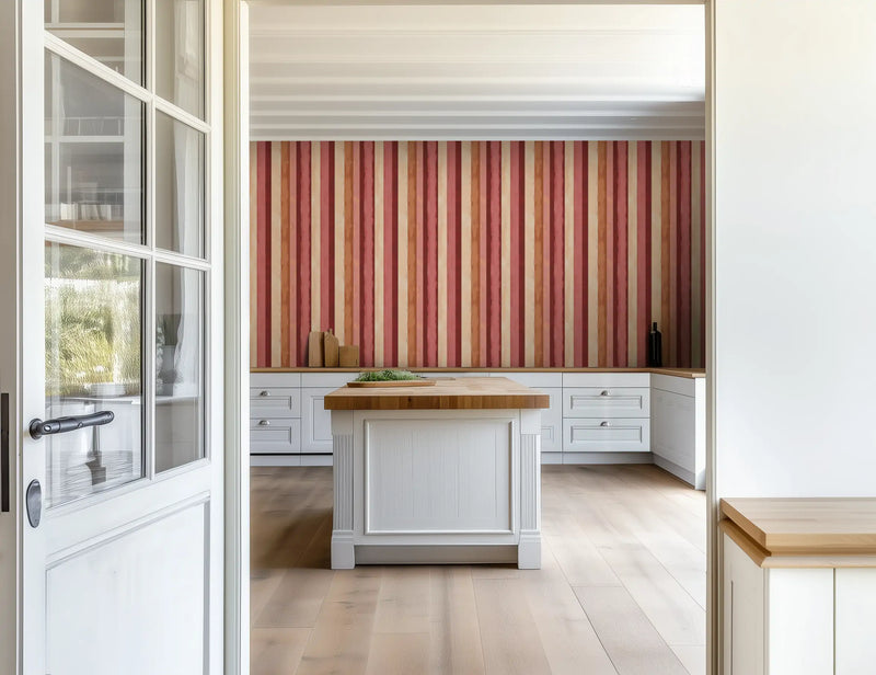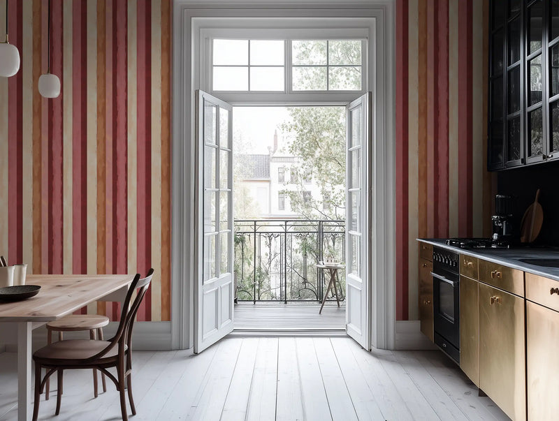 Echoing the aged clay walls of historic Tuscan villas, sunbaked and rich with patina, Terracotta Echo is a bold, yet refined striped wallpaper, where deep russet, muted ochre, and warm sandstone hues blend into a timeless Mediterranean palette.
