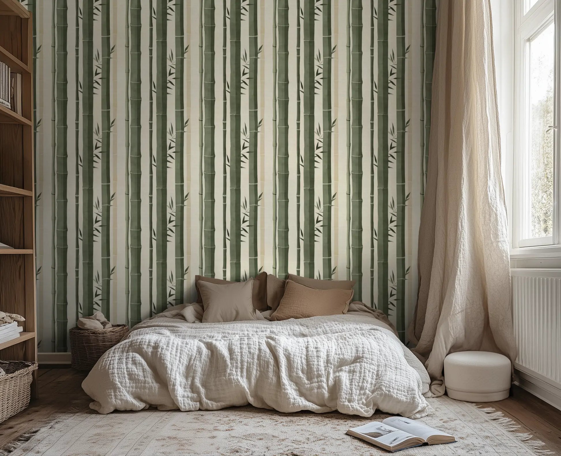 The air is thick with the scent of rain-soaked leaves, the hush of morning settling between towering bamboo stalks. Verdant Sanctuary is a lush escape, where soft green hues and ivory light filter through a dense forest, bringing the tranquility of nature into your space.