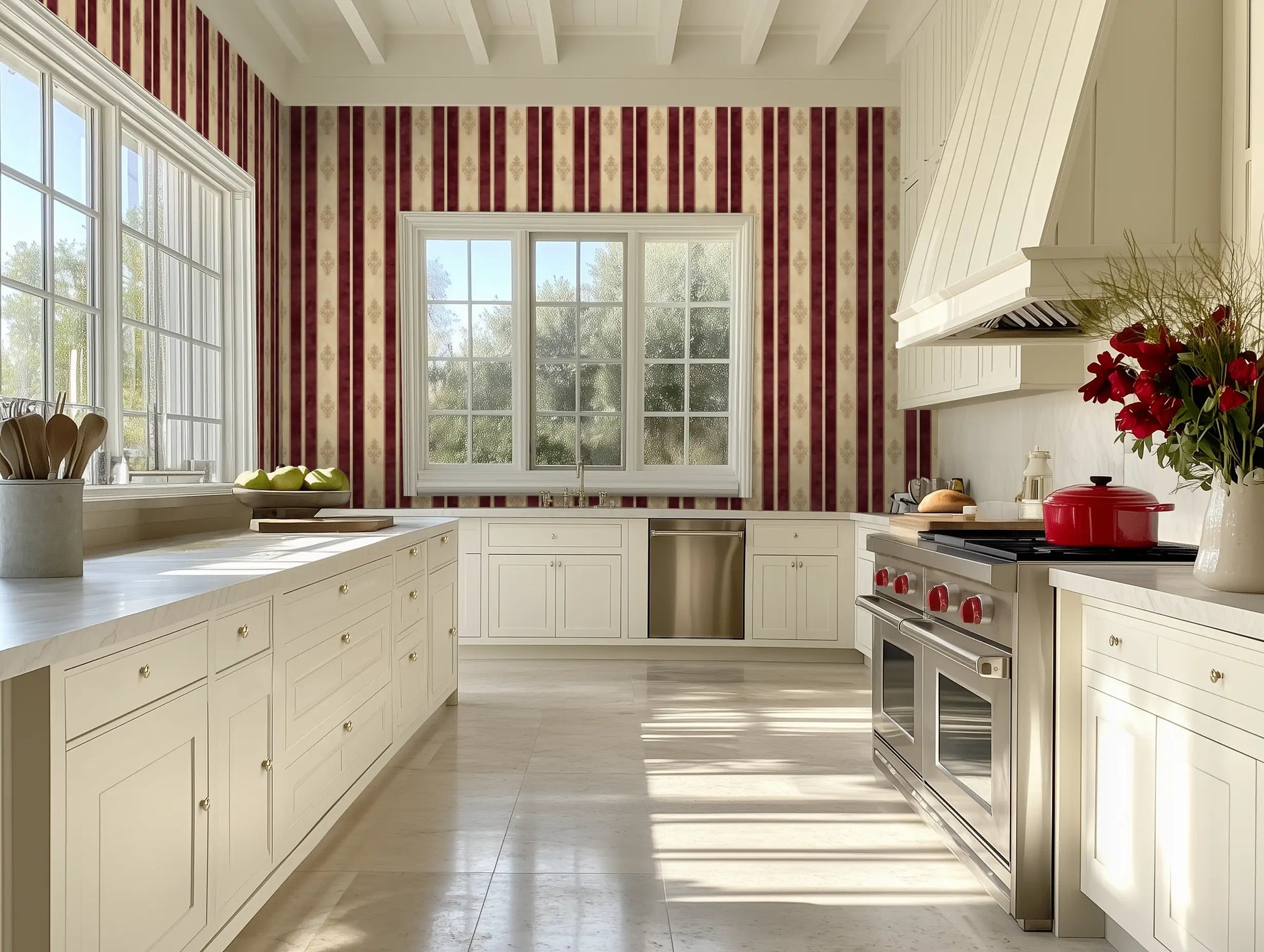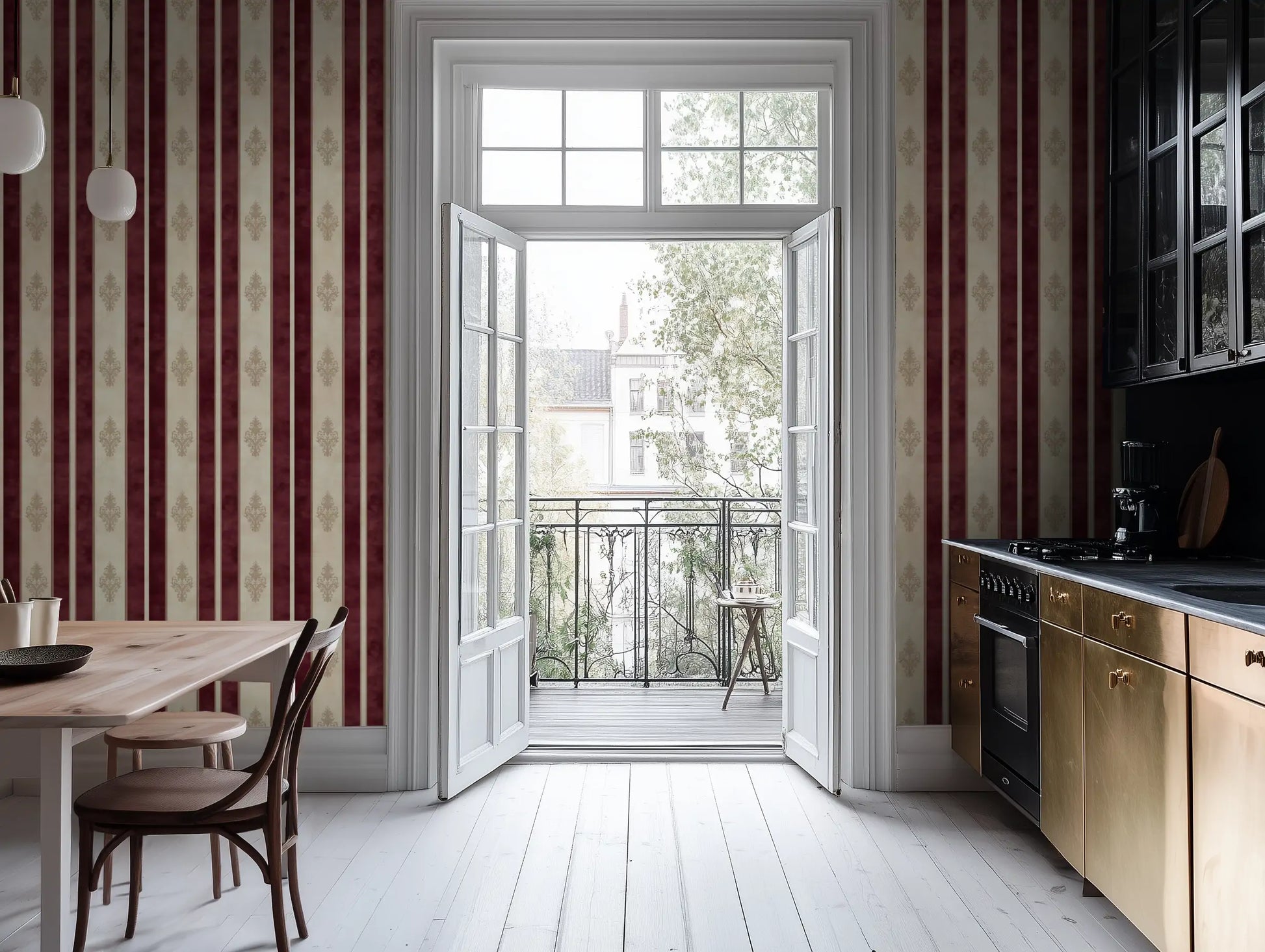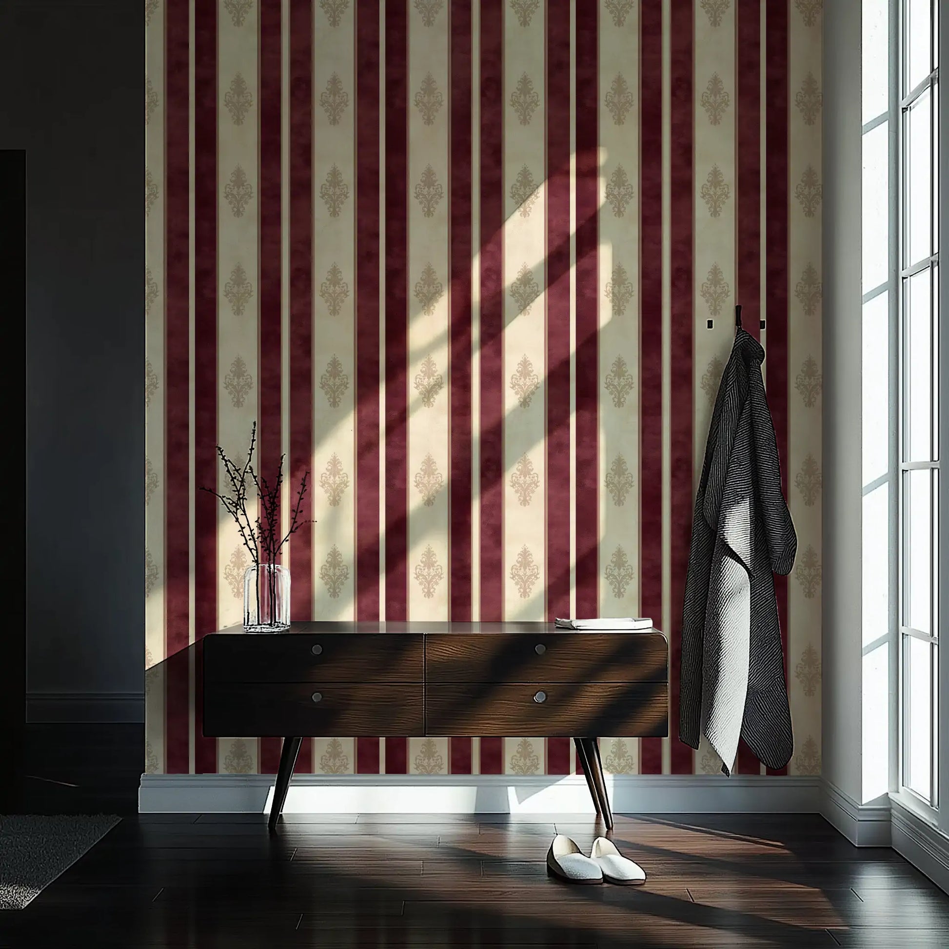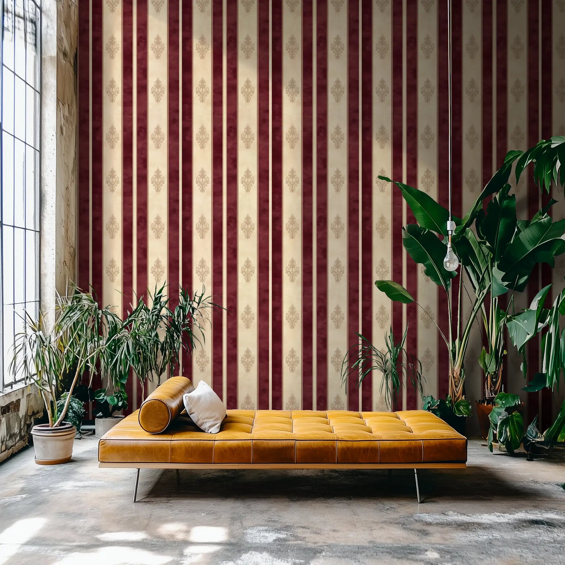Transform your space into a masterpiece of old-world elegance with Grand Hotel Firenze. Inspired by the grandeur of historic Florentine hotels, this wallpaper features bold vertical stripes in rich Bordeaux red and aged ivory, accented with delicate damask motifs for a touch of Renaissance charm. Whether you place it in your bedroom, dining room, hallway, kitchen, living room, office, or even a lavish powder room, this design creates an atmosphere of sophistication and warmth.