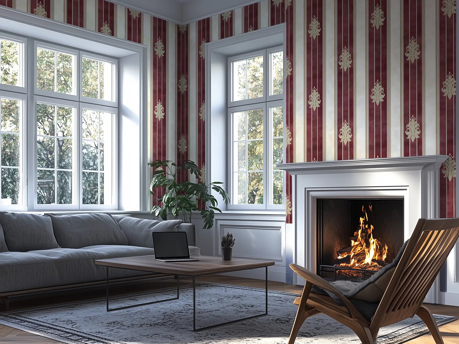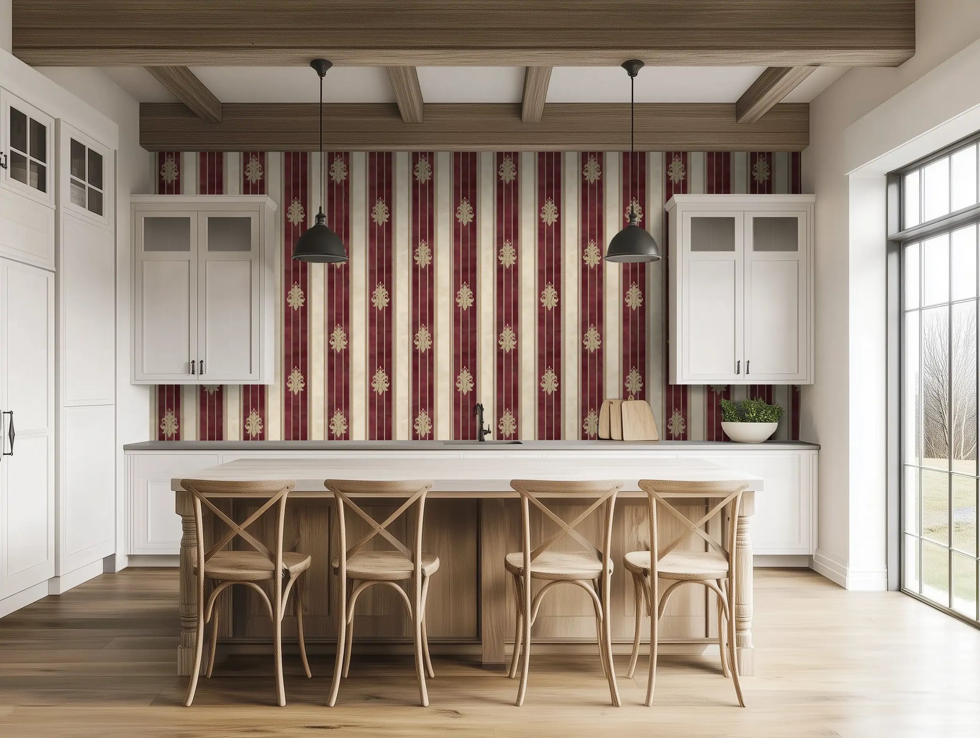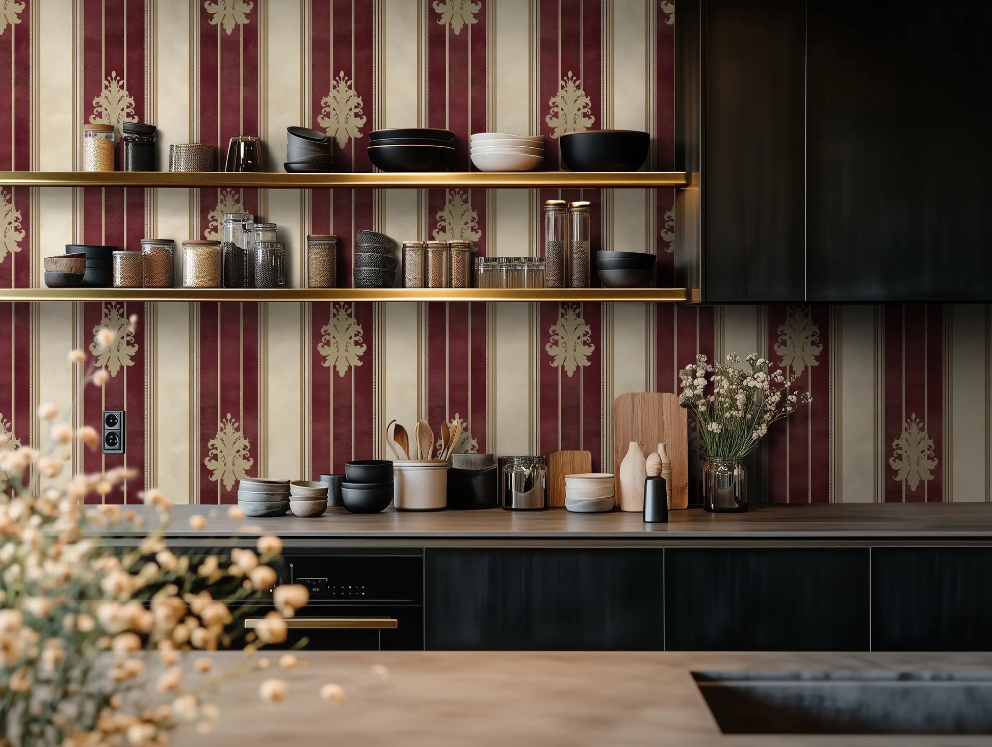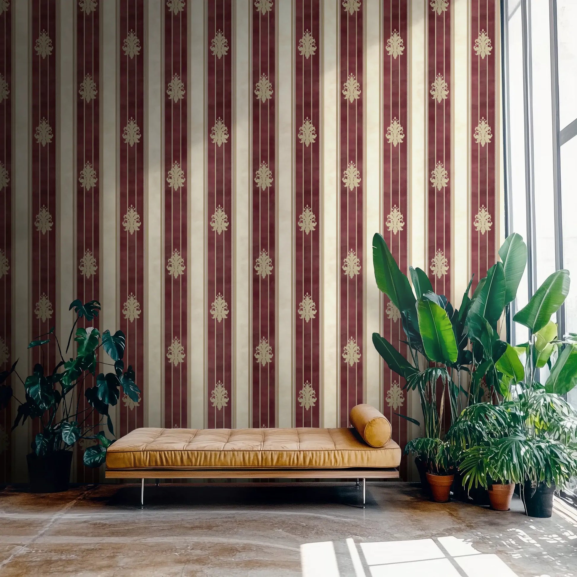 Channel the luxurious grandeur of the Medici dynasty with Medici Chic, a regal striped wallpaper inspired by the rich tapestries and silk-draped walls of Florence’s golden age. Deep Bordeaux red and antique gold stripes evoke the sumptuous textures of Renaissance palaces, while the subtle damask detailing hints at old-world aristocracy.