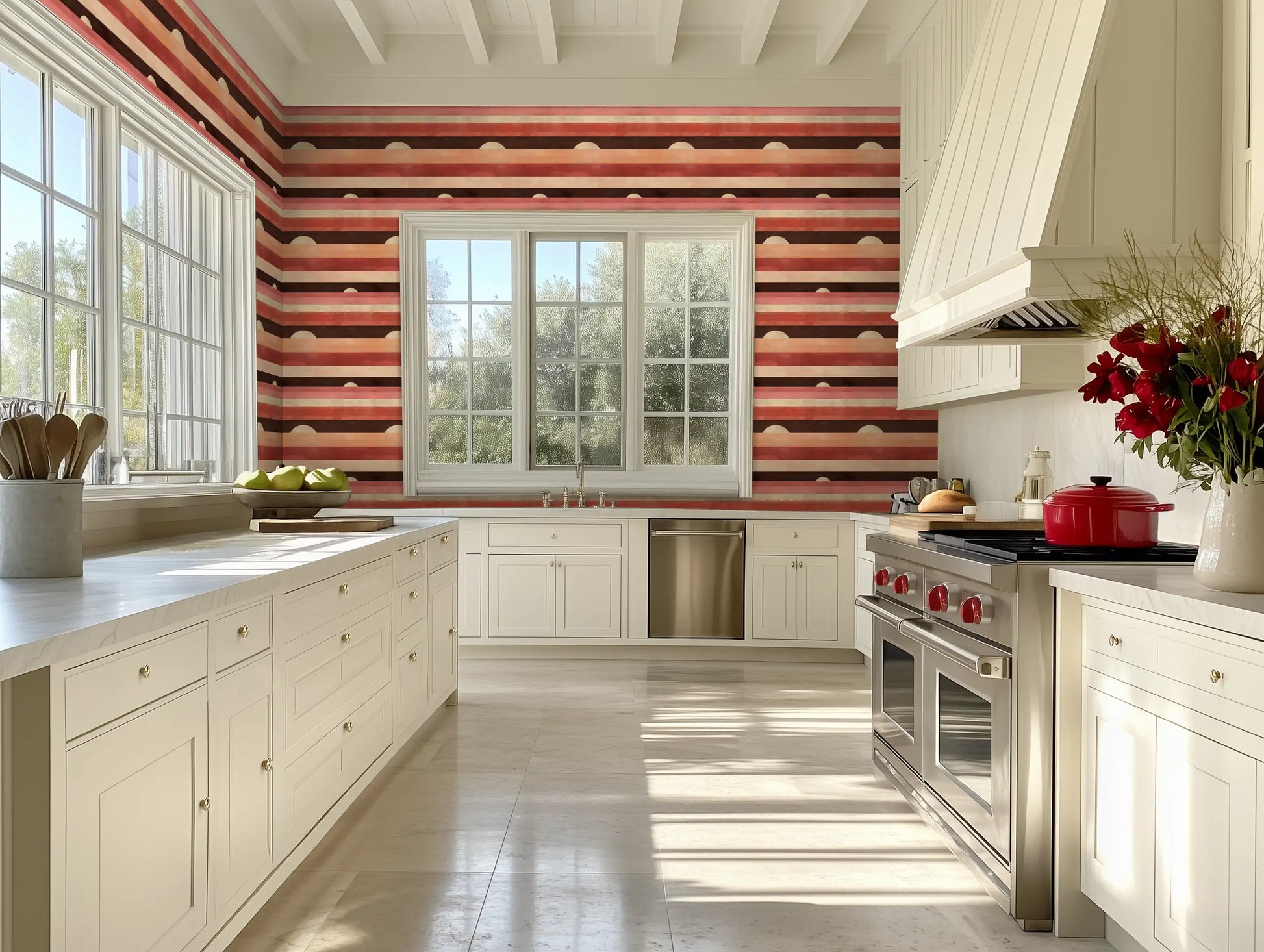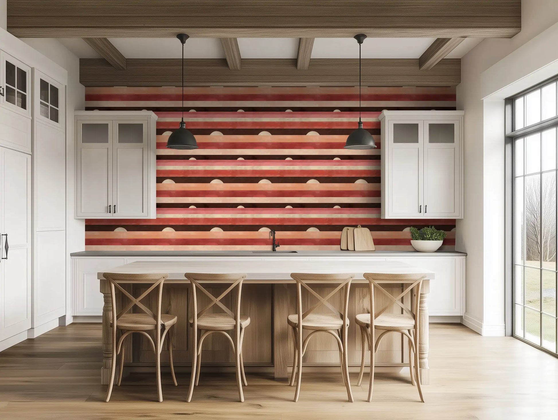 Tuscany’s sunsets aren’t just moments—they’re masterpieces, casting the hills in soft ochres, siennas, and warm rose hues. Terracotta Dreams channels this fleeting beauty into an earthy striped wallpaper, where sun-washed pinks, warm golds, and rustic reds create a soft yet structured aesthetic.