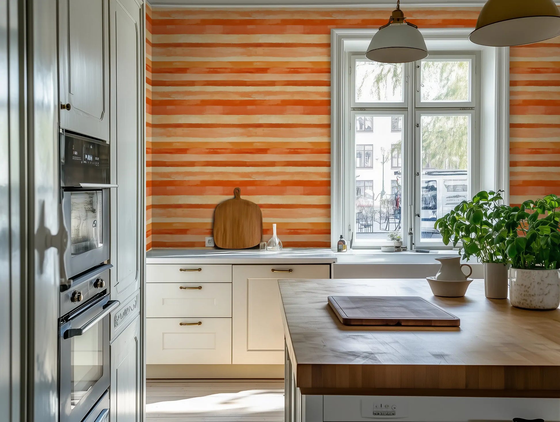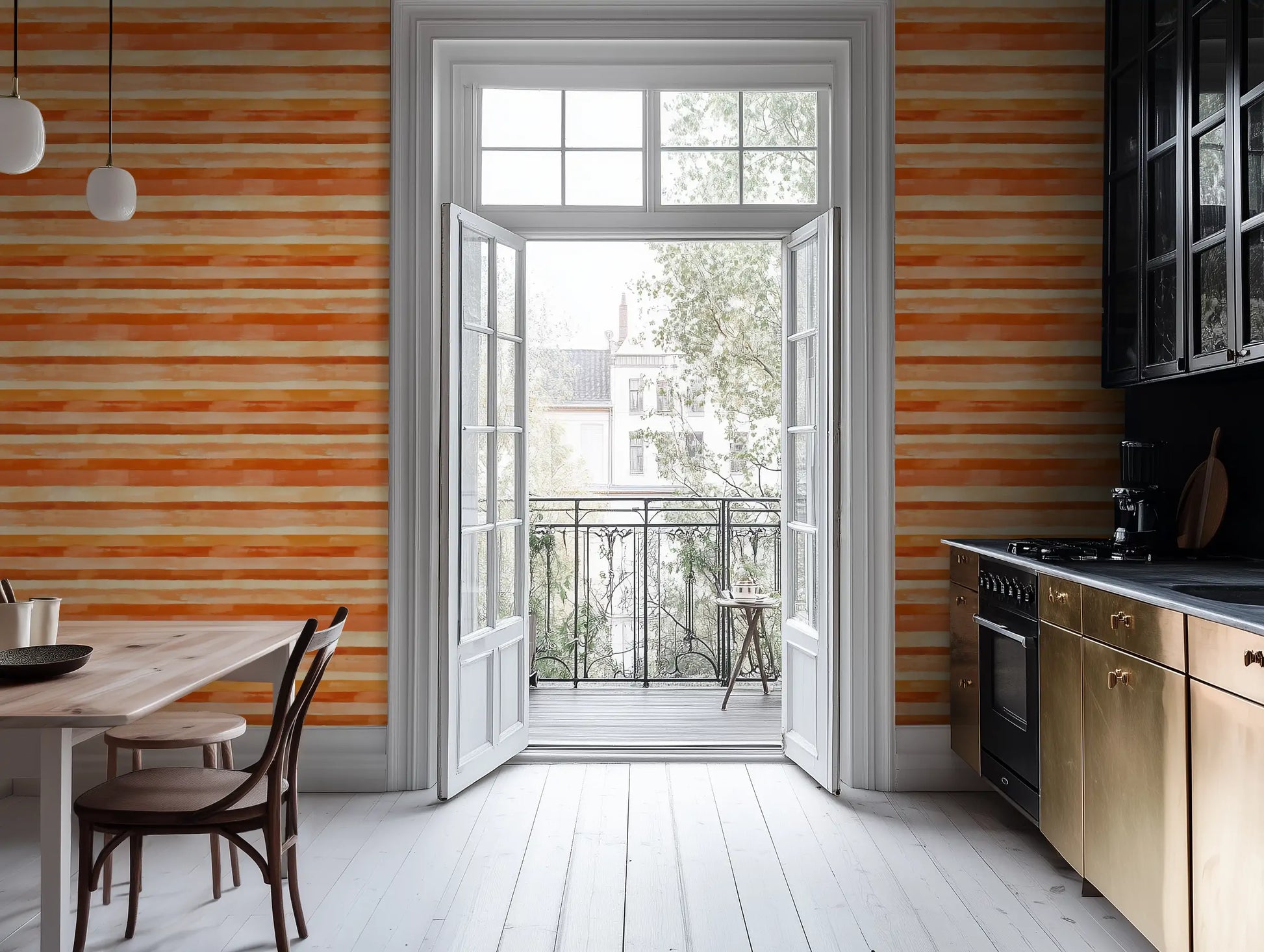 Perfect for Mediterranean interiors, rustic dining rooms, or sun-filled kitchens, this earthy striped wallpaper pairs beautifully with aged wood, linen textures, and hand-painted ceramics, creating a cozy yet refined Tuscan-inspired home.