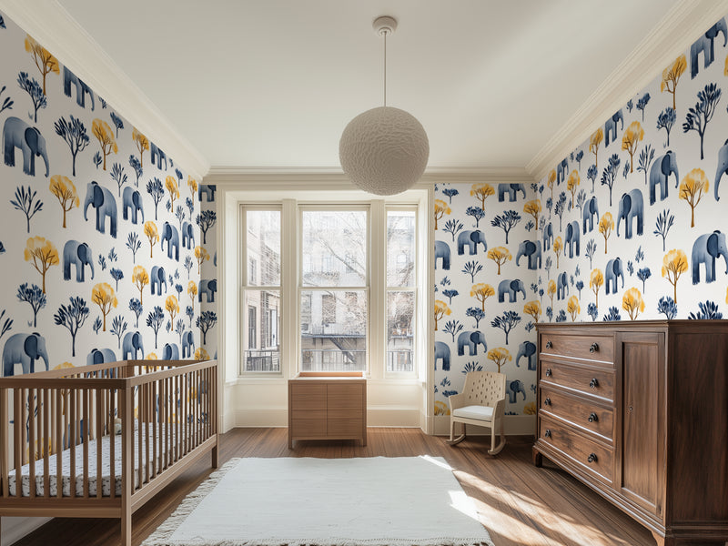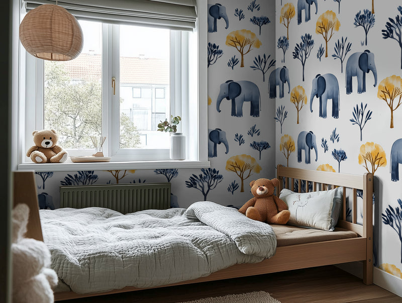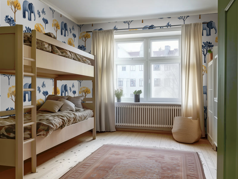 A modern twist on safari style. Elephant Sun (White) mixes soft blues with bursts of ochre, laying out a repeating pattern of elephants and stylized trees in a crisp, white landscape. It feels clean, fresh, and full of gentle movement.