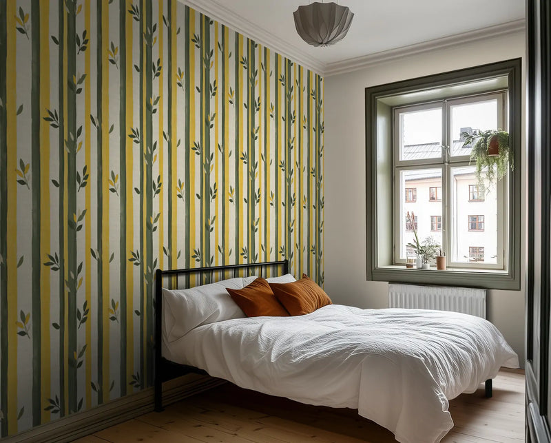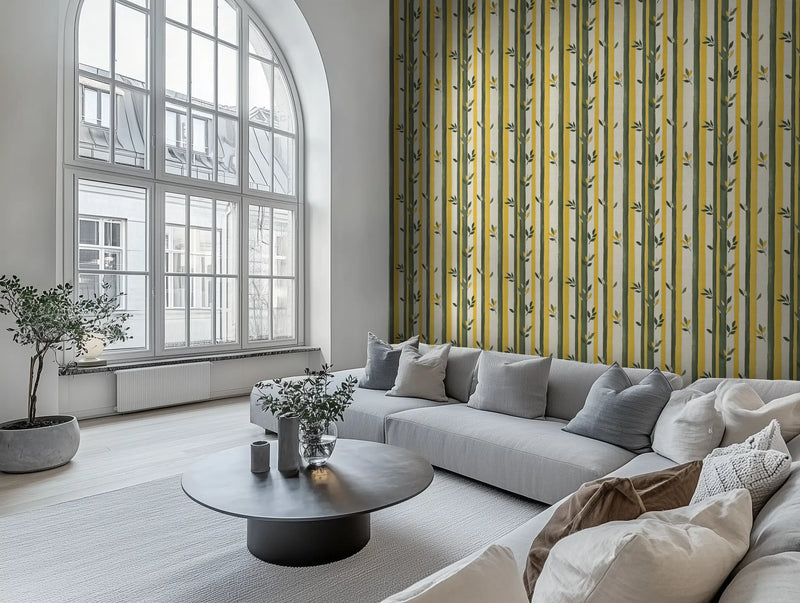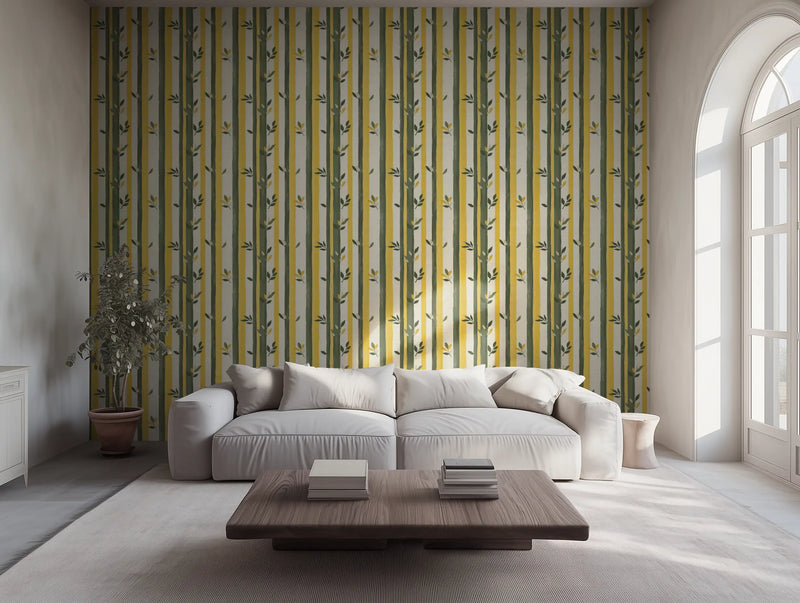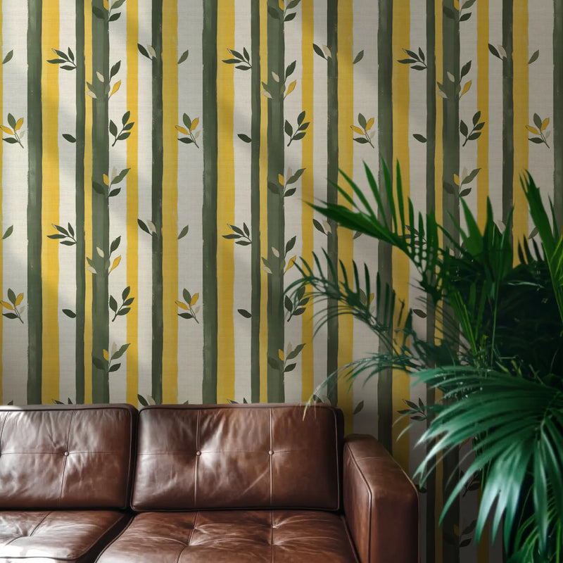 Among the vine-covered walls of Provençal estates, olive branches stretch toward the sky, casting playful shadows over the sun-warmed stone. Verdant Provence captures this lush, nature-infused aesthetic, weaving botanical details through soft sage and golden ochre stripes.
