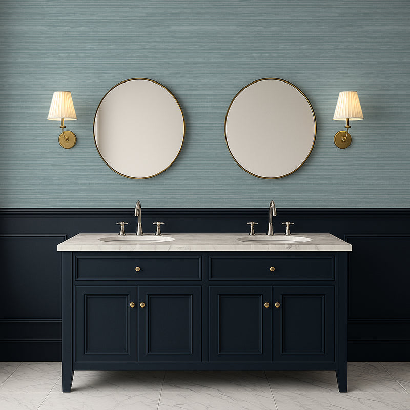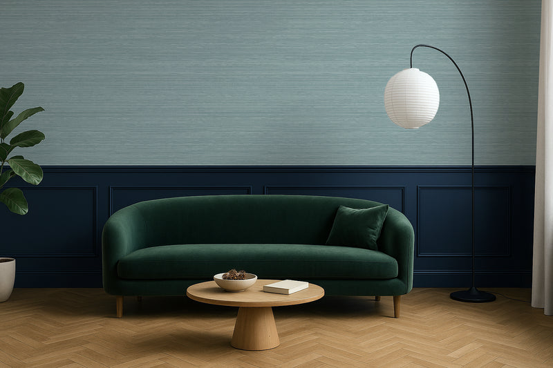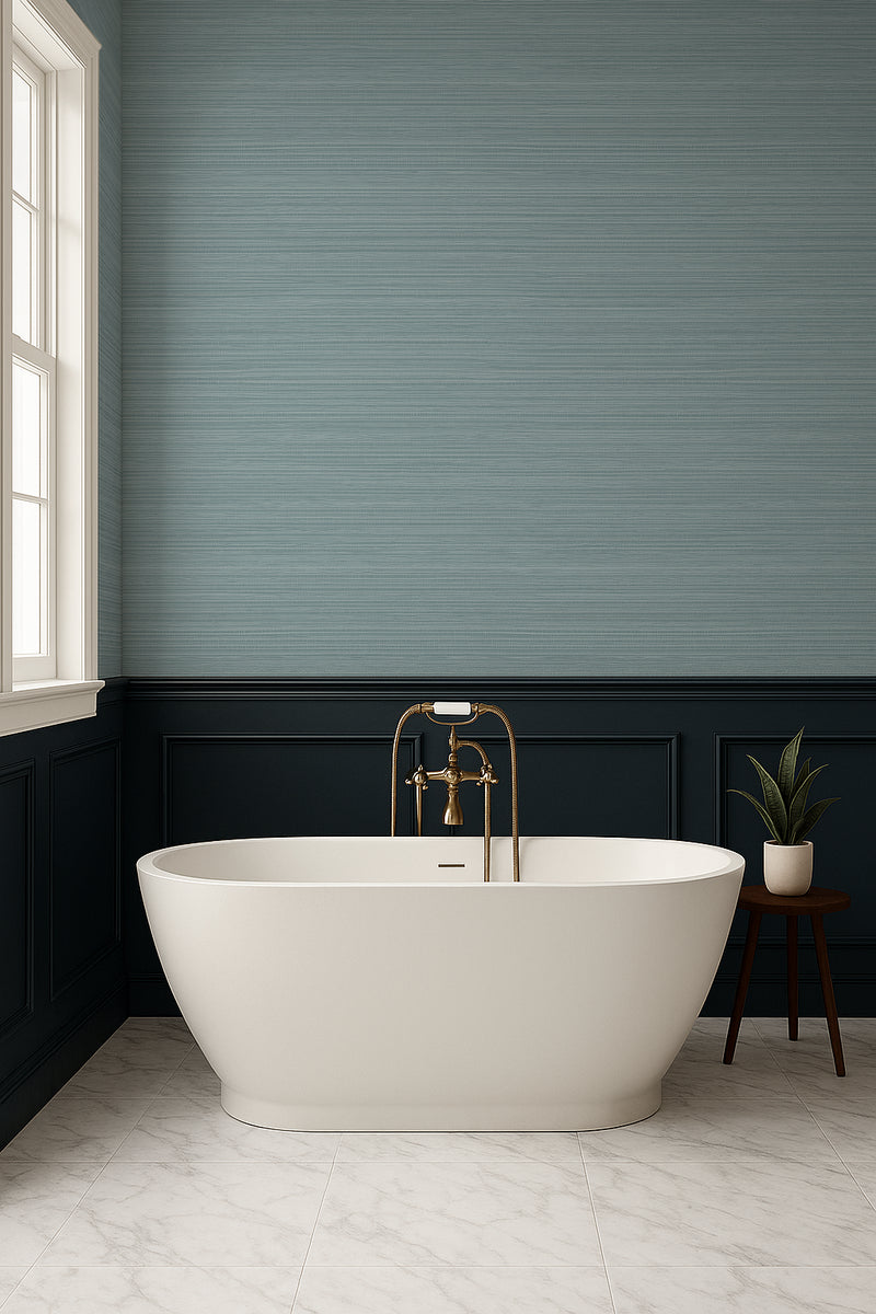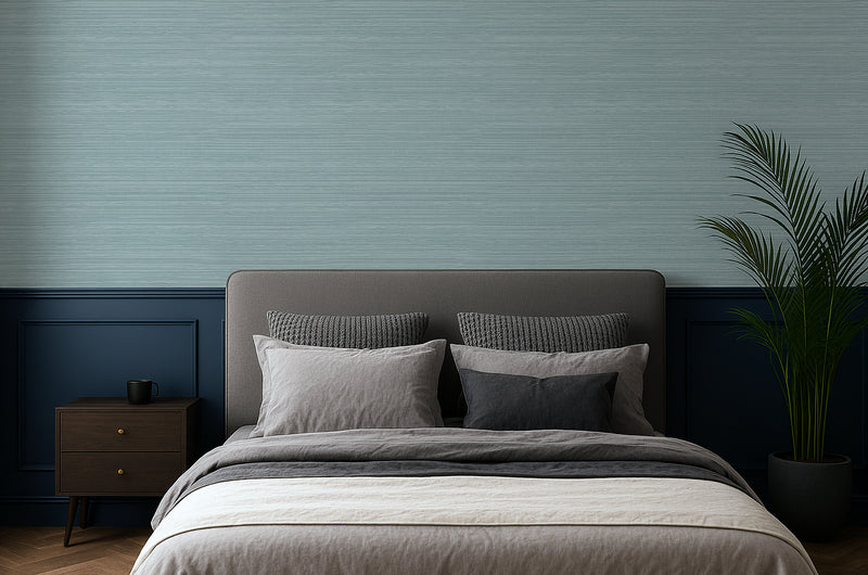 Unlike traditional grasscloth, this wallpaper offers the depth and tactile feel of handwoven fibers with the ease of a smooth print — no seams, no fraying, just effortless texture. The pale blue-gray tone softens light beautifully, making it a go-to for bedroom accent walls, spa-like bathrooms, or open-plan living spaces that need a calming anchor.