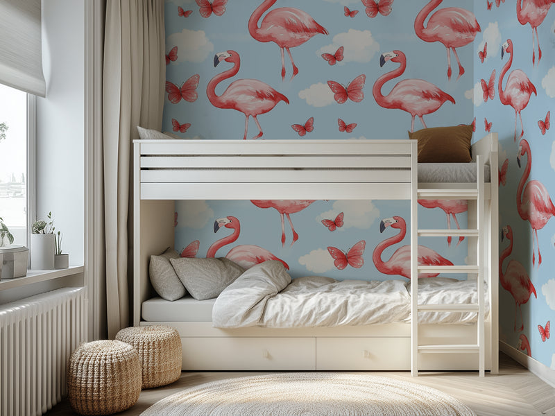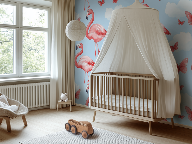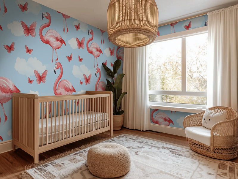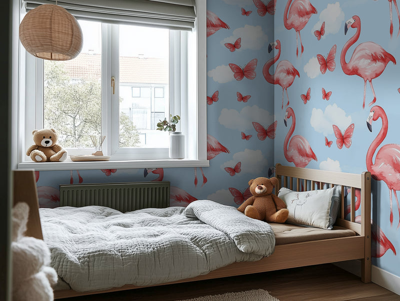 Animal-themed wallpapers are timeless, and this version blends it with the cloudcore and sky aesthetic trending in dreamy kids’ décor. Think whimsical, modern, and endlessly uplifting.