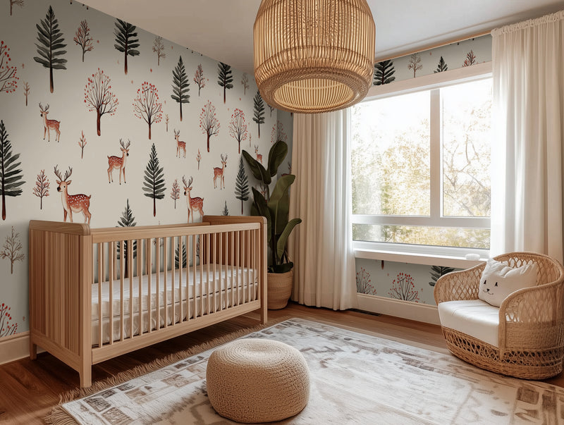 Neutral animals and seasonally shifting trees bring a timeless woodland vibe with a modern twist. A great choice for parents seeking something nature-inspired, but still soft and elevated.
