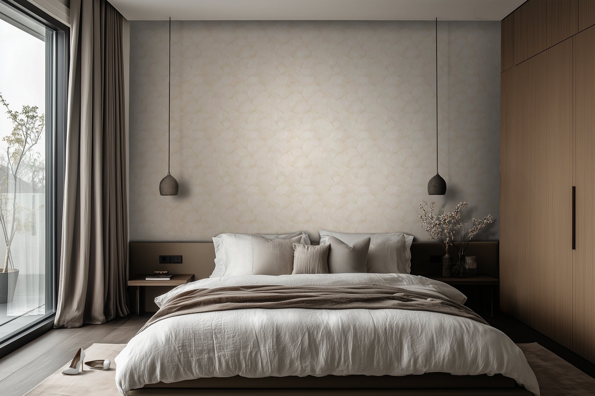 Neutral palettes with organic forms are driving design trends, bridging minimalism and coastal influences. Champagne Shell on Almond Cream delivers that balance of warmth and refinement for modern interiors.