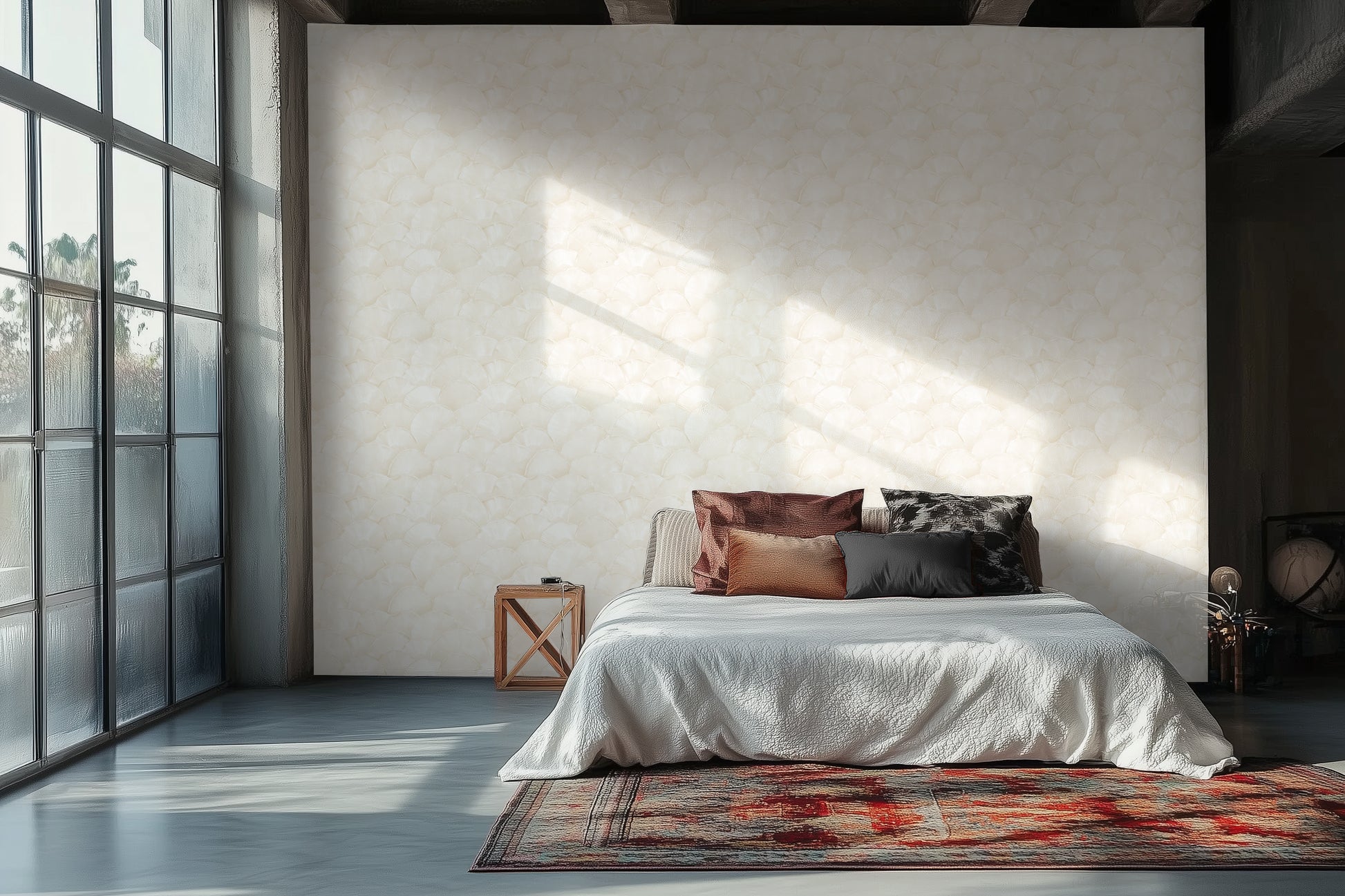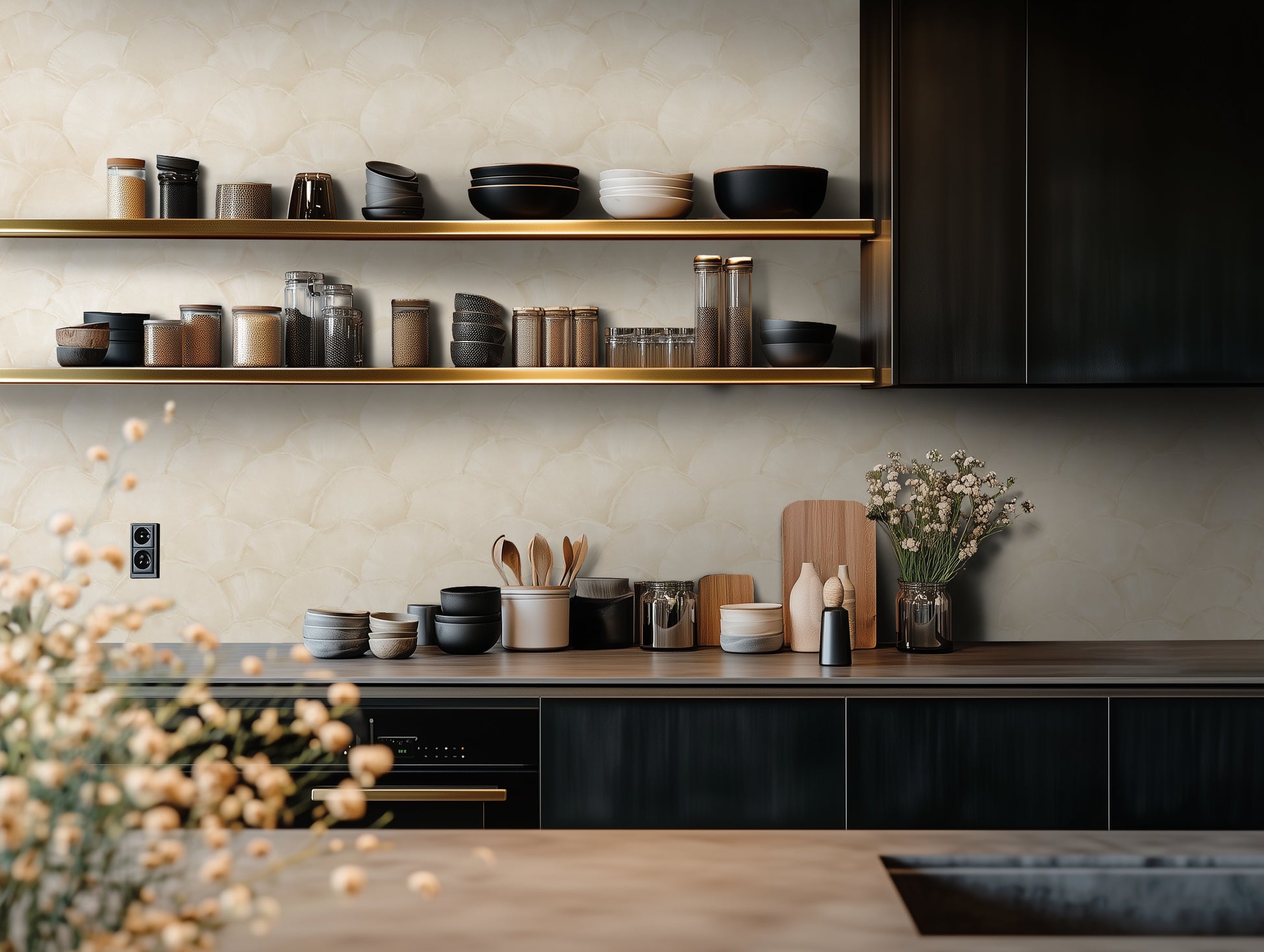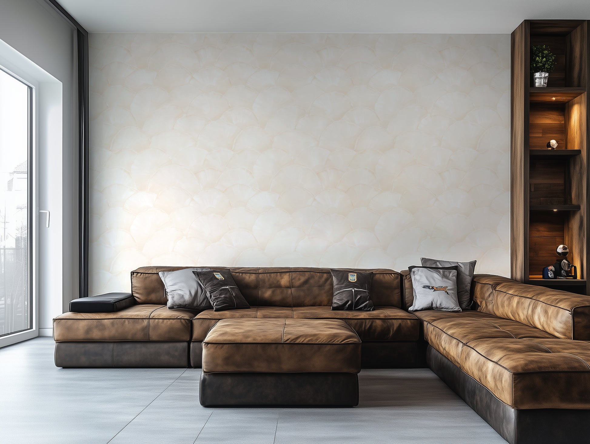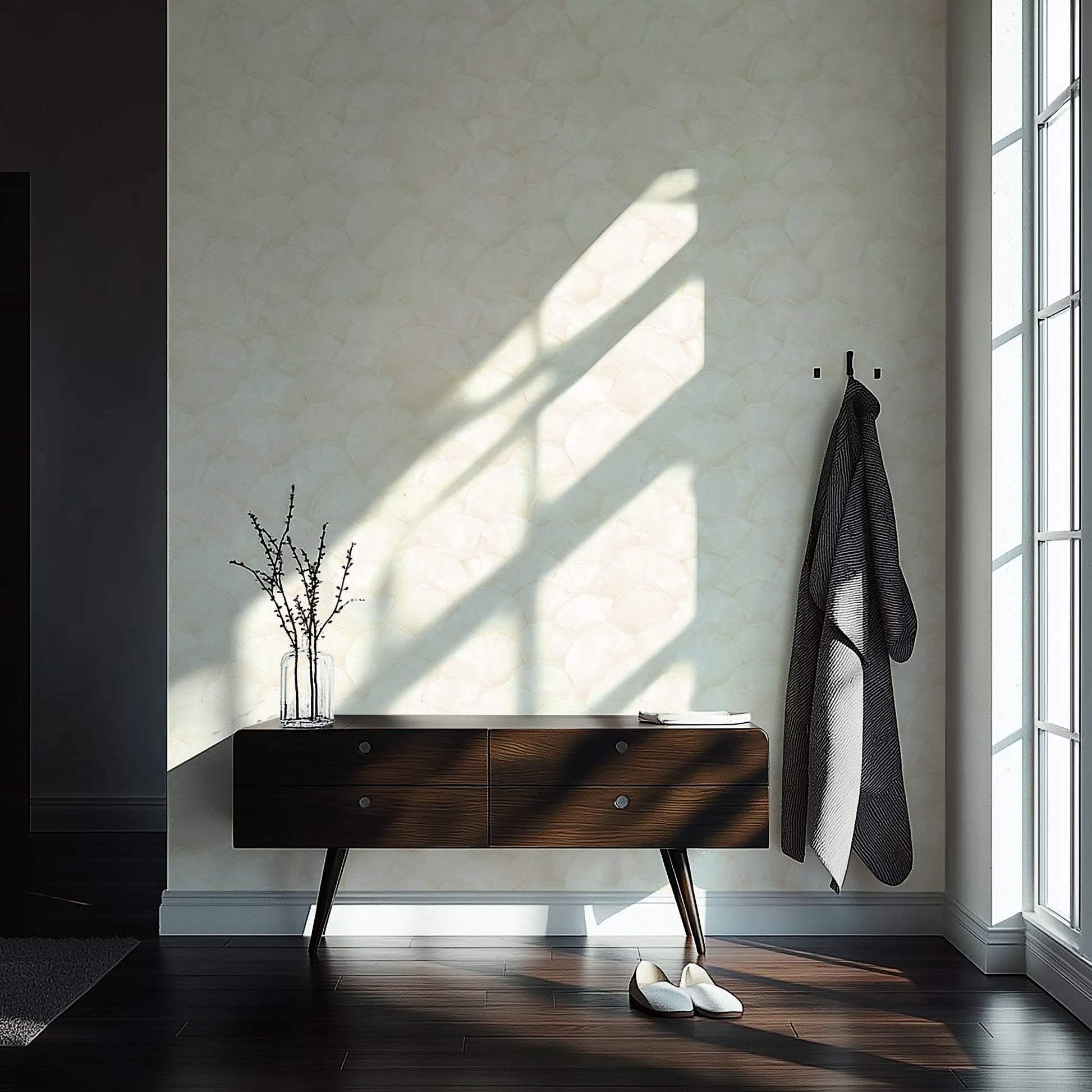 Shoreline Fan – Champagne Shell on Almond Cream softens seashell geometry into warm, tonal neutrals — creamy arcs touched with champagne warmth that feel both organic and luxurious. It’s subtle enough for serene spaces, but special enough to hold its own as a feature wall.