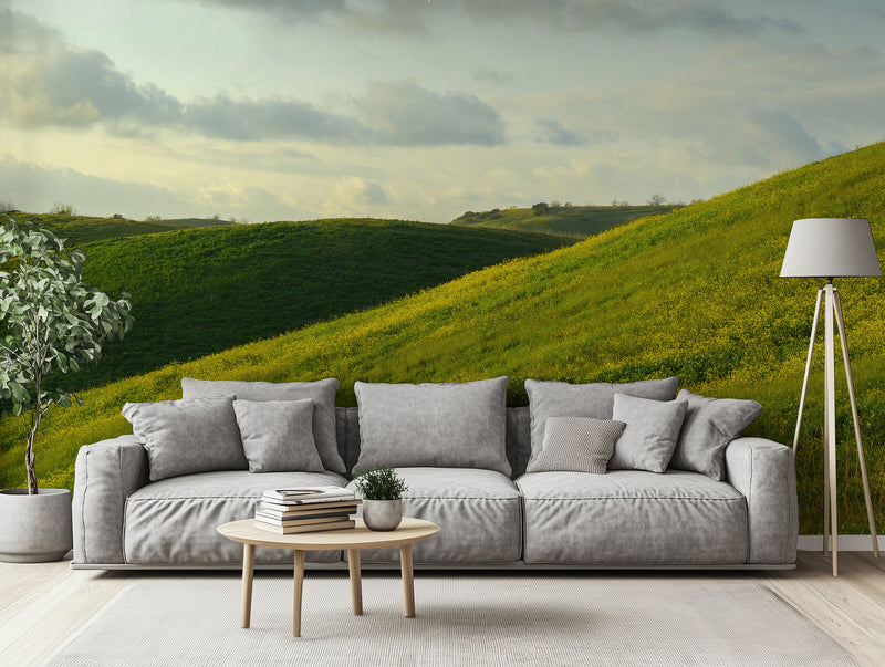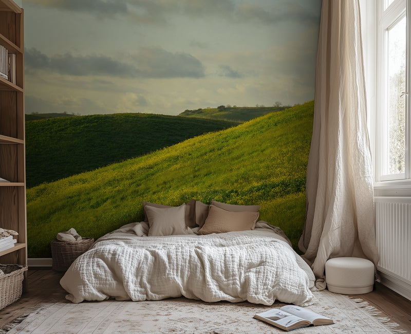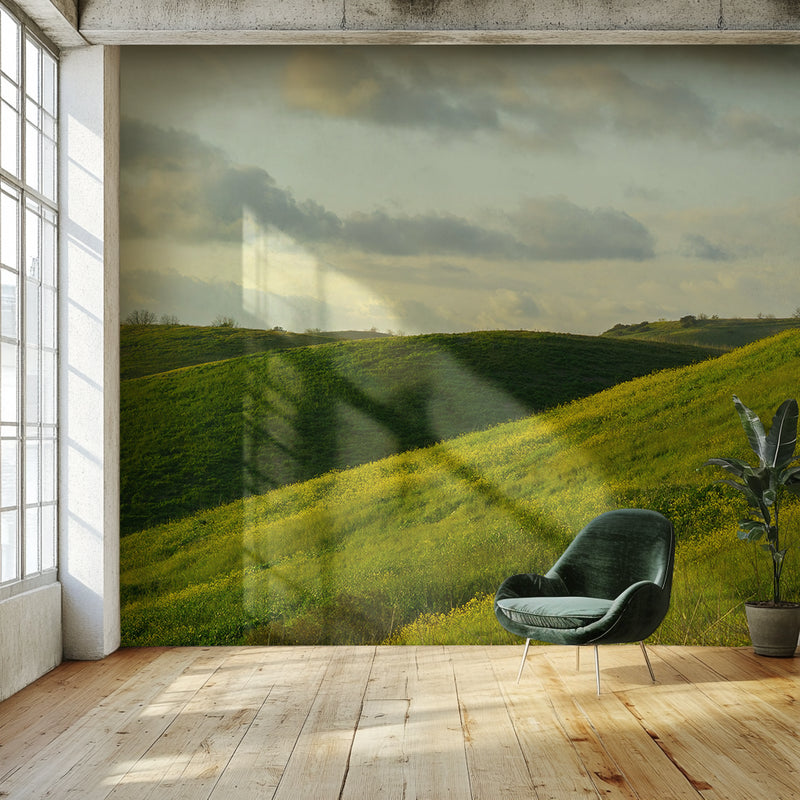 Rolling green hills catch the last warm light of day, curving like brushstrokes beneath a sky of quiet clouds. Hillshade is all about softness and rhythm—a natural lullaby in landscape form. This countryside wallpaper brings a warm, open calm into your home, making it feel timeless, grounded, and endlessly peaceful.