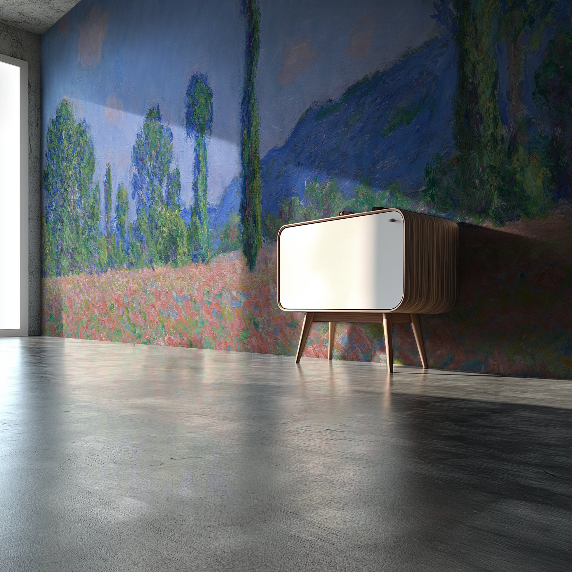 This wallpaper is based on the original painting by Claude Monet, now in the public domain. It has been carefully restored and adapted for large-scale interior use under a public domain license.