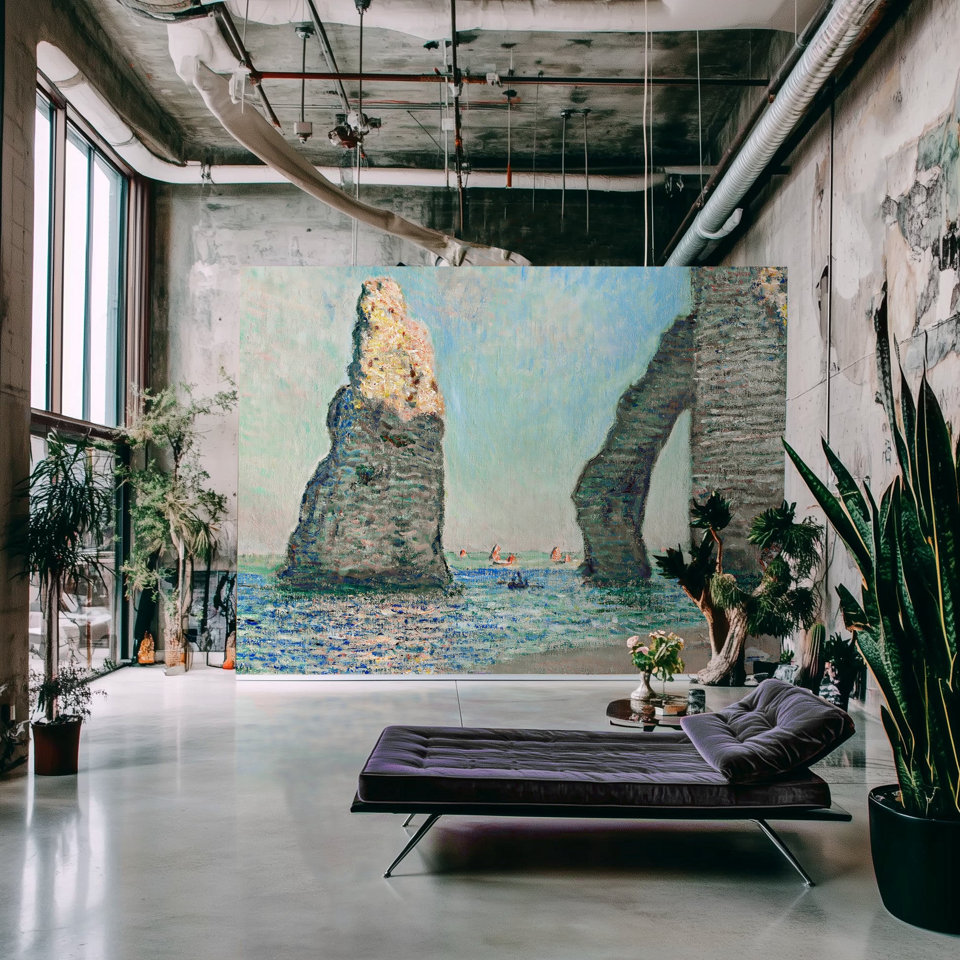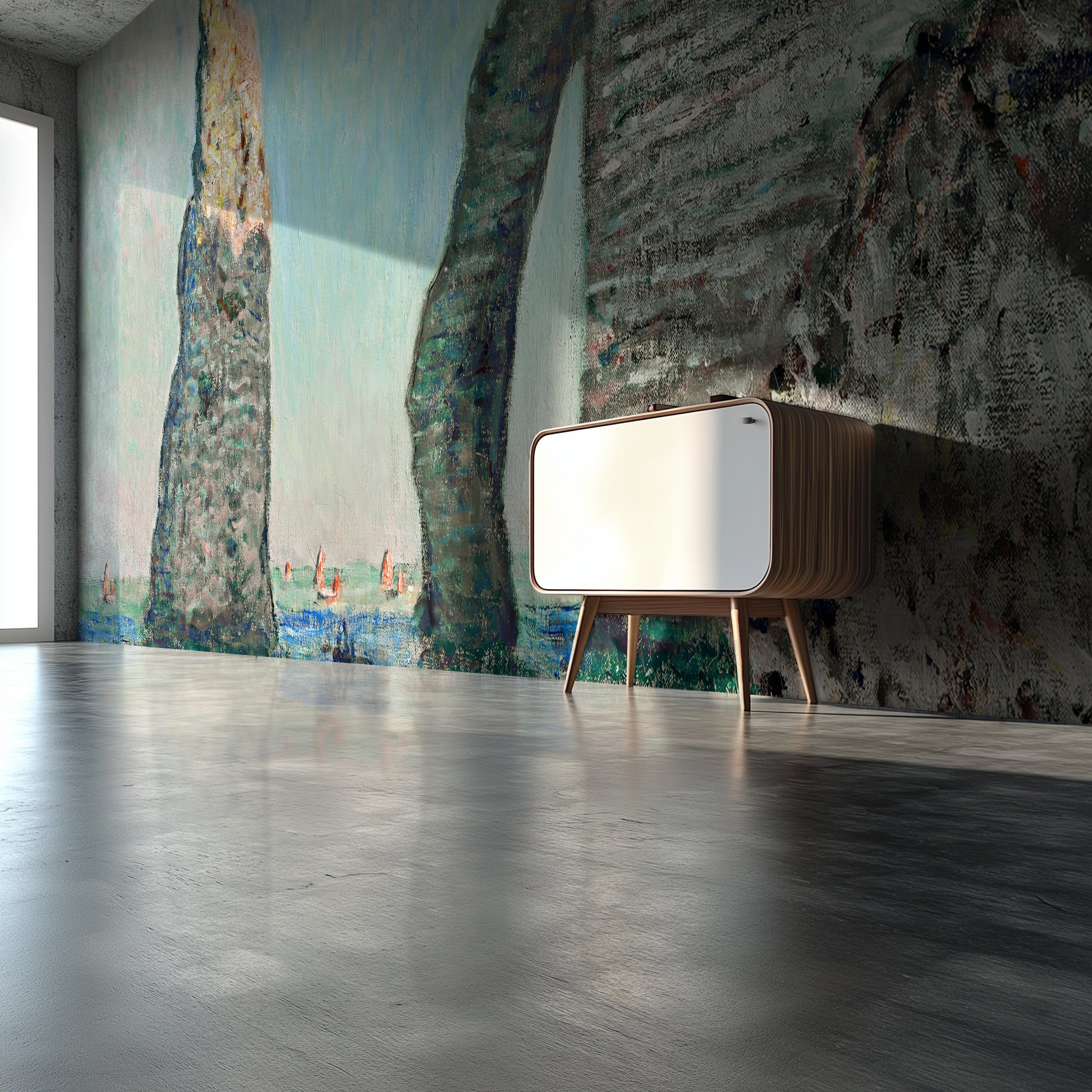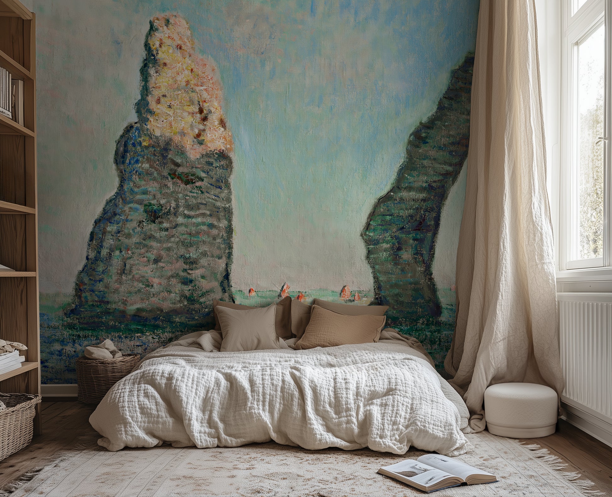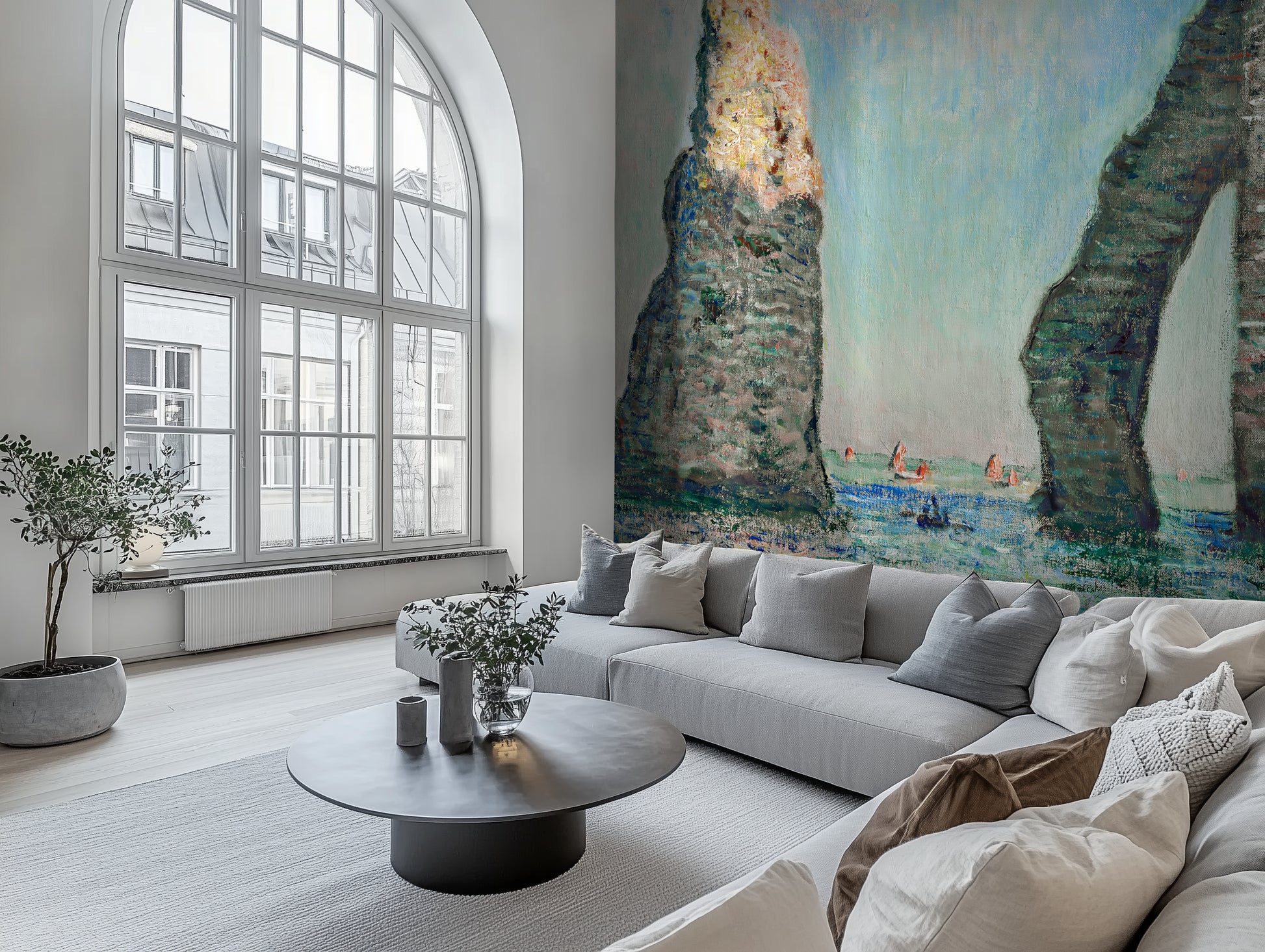Étretat was one of Monet’s favorite escapes, where he studied light across changing tides and weathered stone. This mural brings that same elemental energy into your home—perfect for coastal-inspired spaces, minimalist bedrooms, or anywhere that calls for a breath of ocean air and painterly drama.