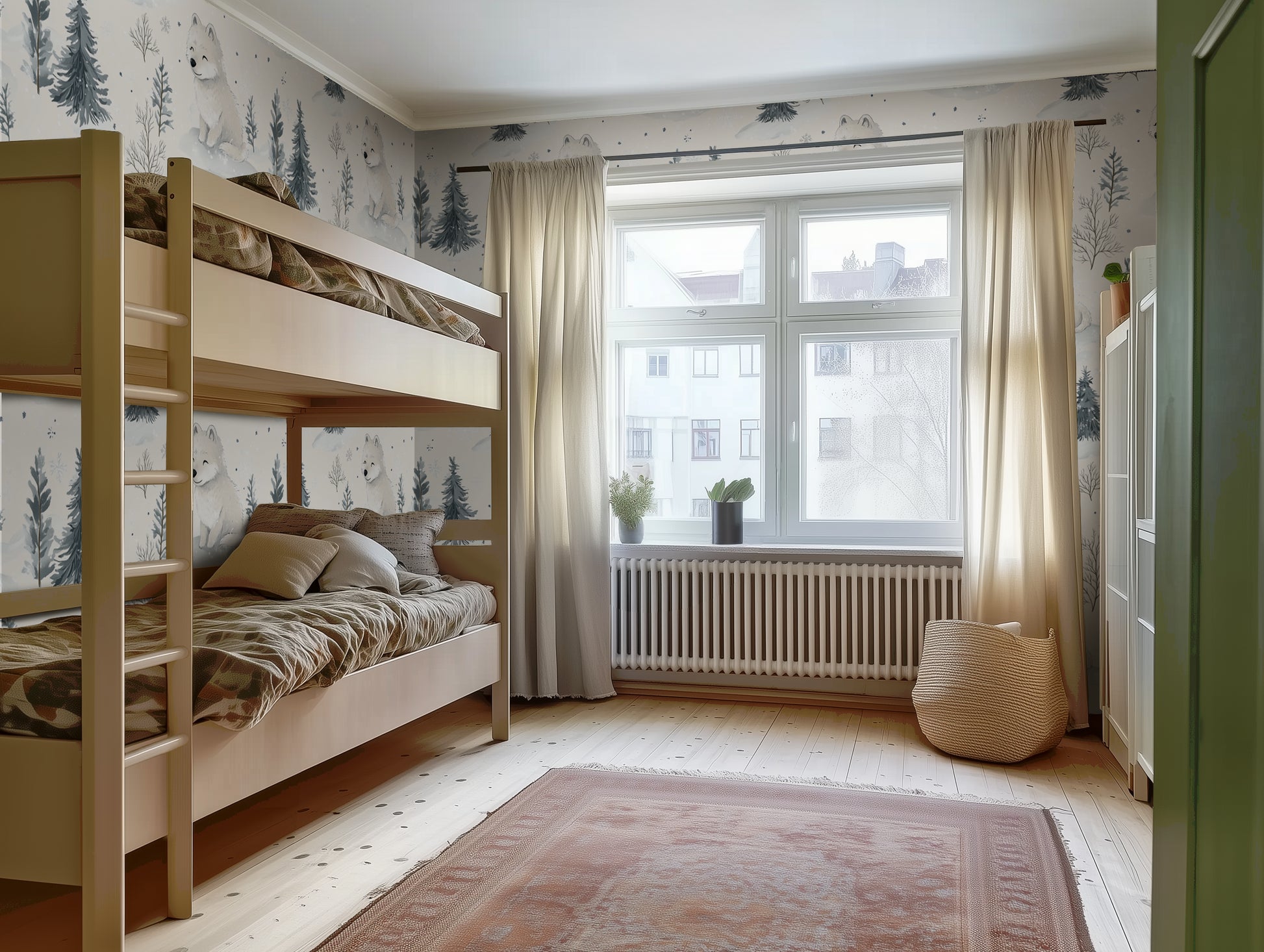 Combining adorable arctic animals with a soothing, neutral palette, this design delivers storybook charm without overwhelming the space. A cozy winter vibe that’s cute without being cutesy.