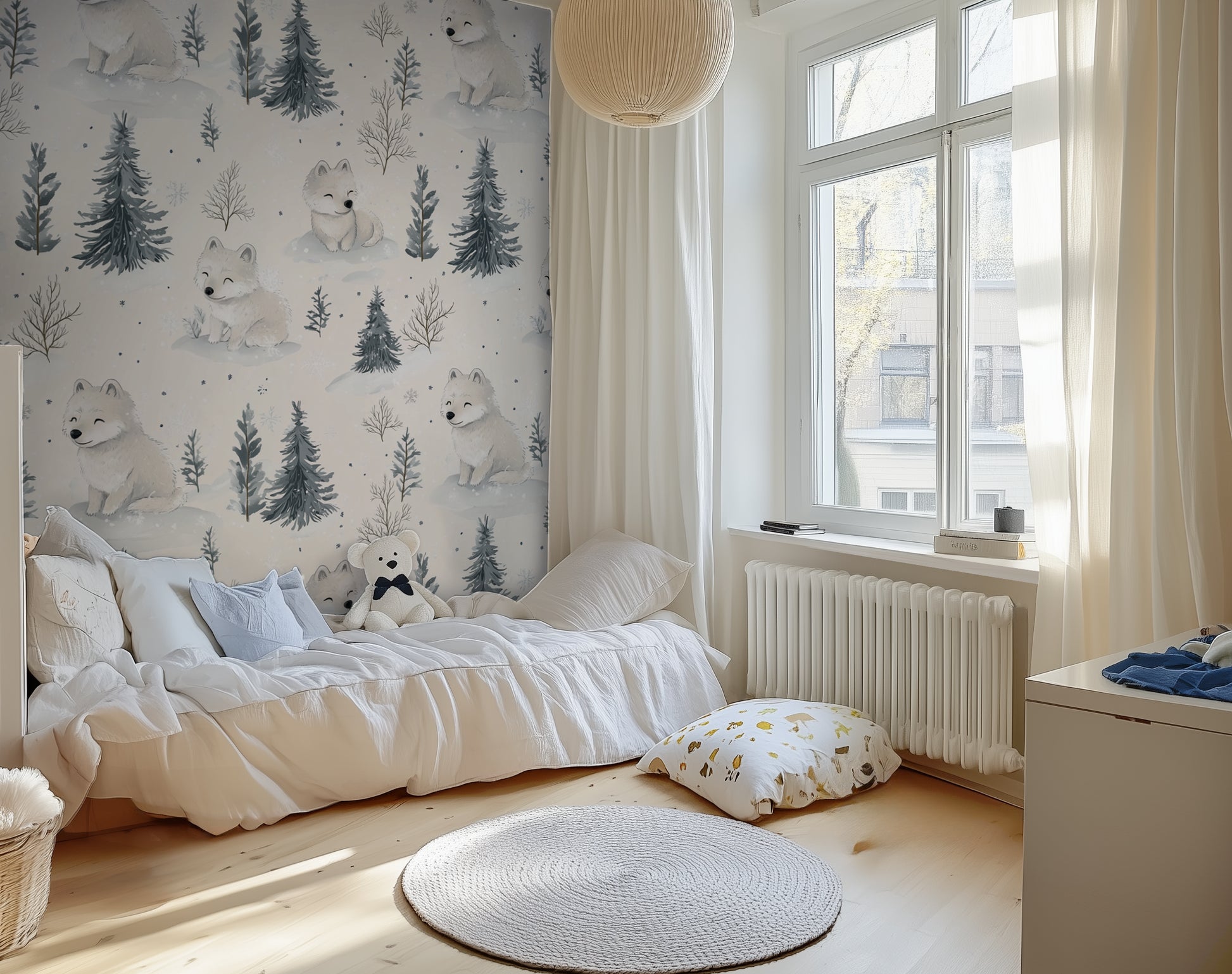 This repeatable pattern wallpaper is ideal for nurseries, winter-themed play spaces, or anyone who dreams in shades of snow and silver. Available as a full mural or seamless pattern—just pick your wild.